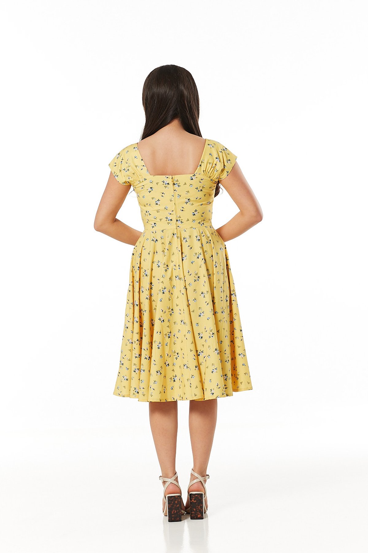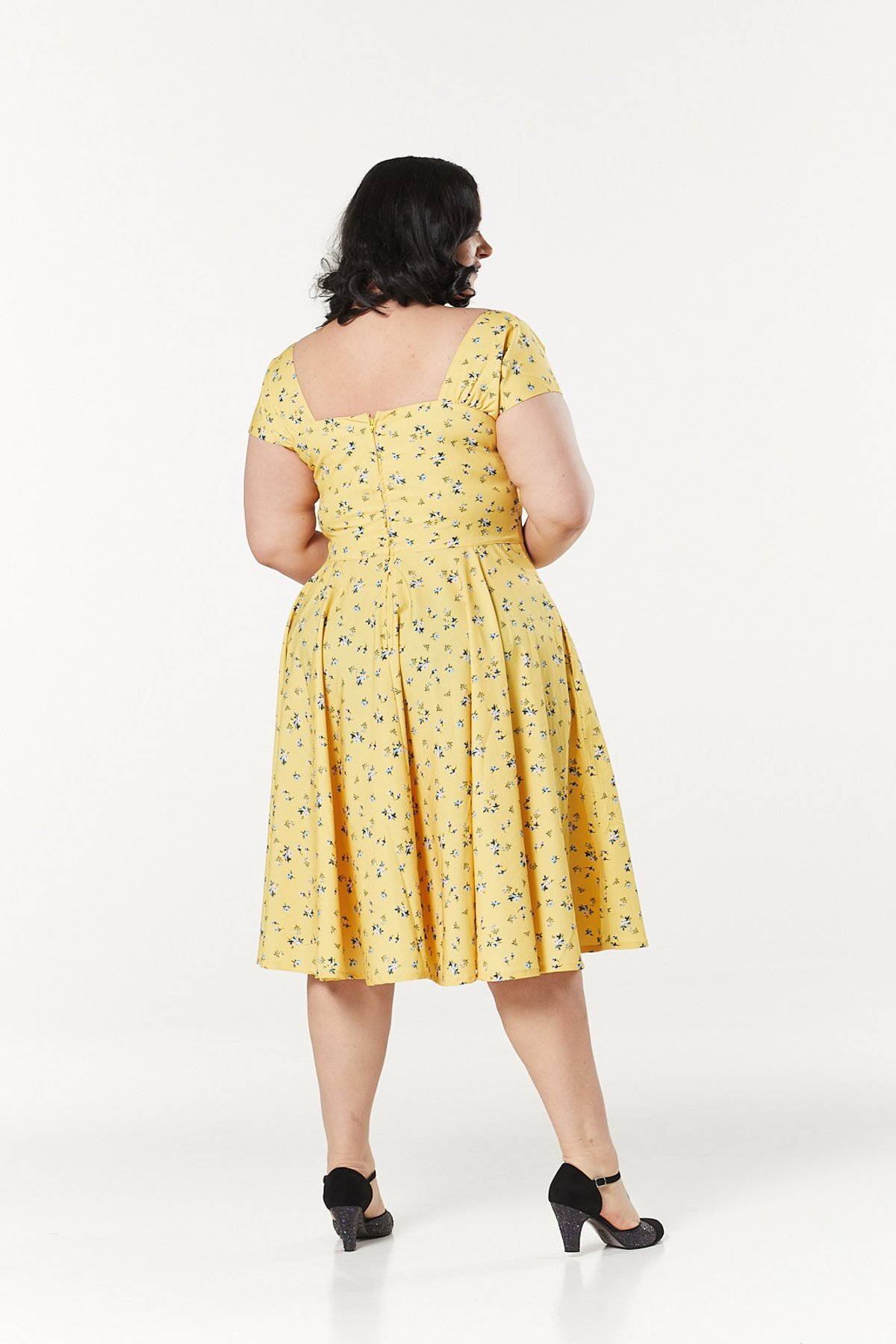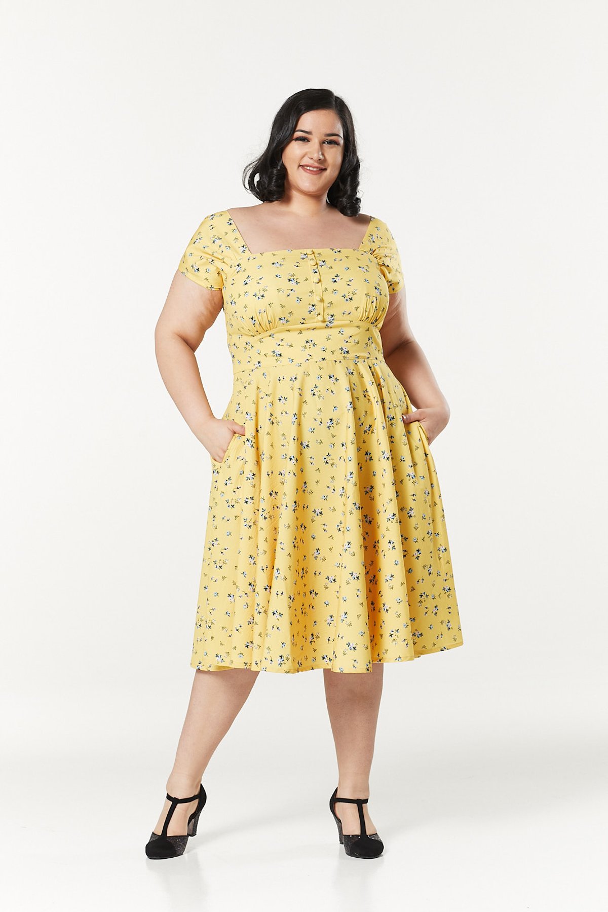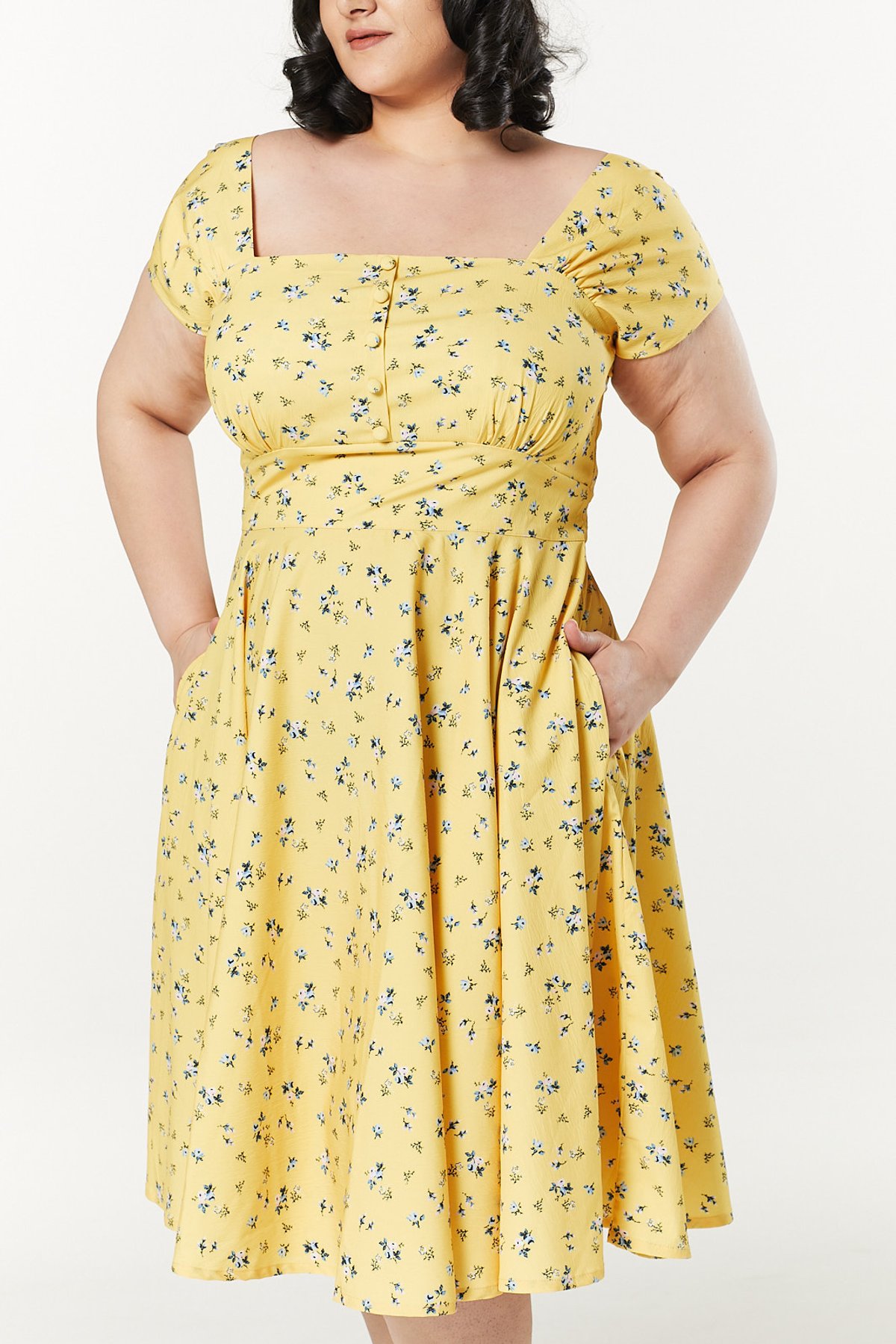 Add a pop of sunshine to your wardrobe with the Seema Dress—where vintage charm meets playful sophistication. Its lively floral print in blue, pink, and white dances against a radiant yellow backdrop, ensuring you'll turn heads and purrs alike. The square neckline and cap sleeves lend a modest touch of elegance, while faux buttons and under-bust gathers whisper sweet vintage secrets. Crafted from a breezy woven blend, this swing dress is your go-to for effortless summer style—perfect for twirling through the sunshine or enjoying a leisurely day out.