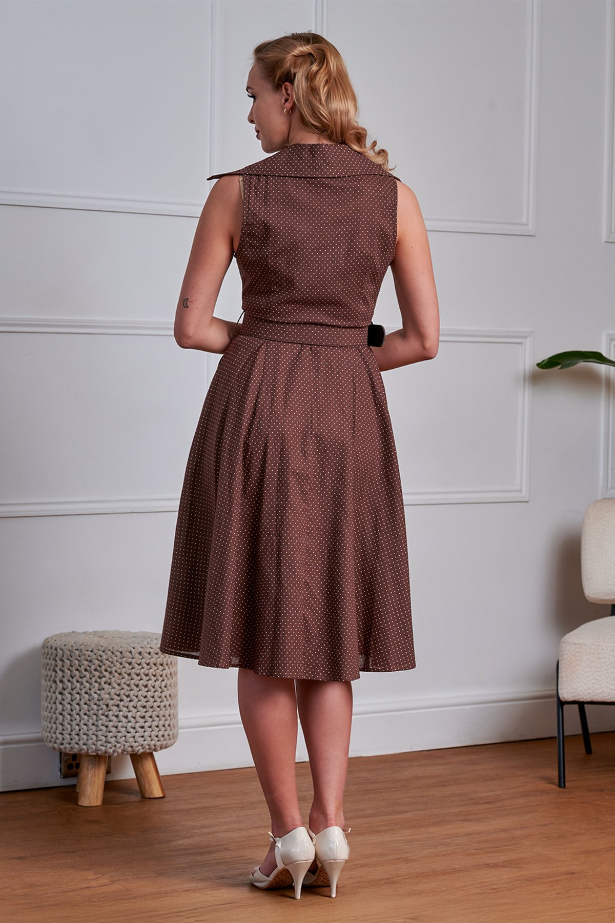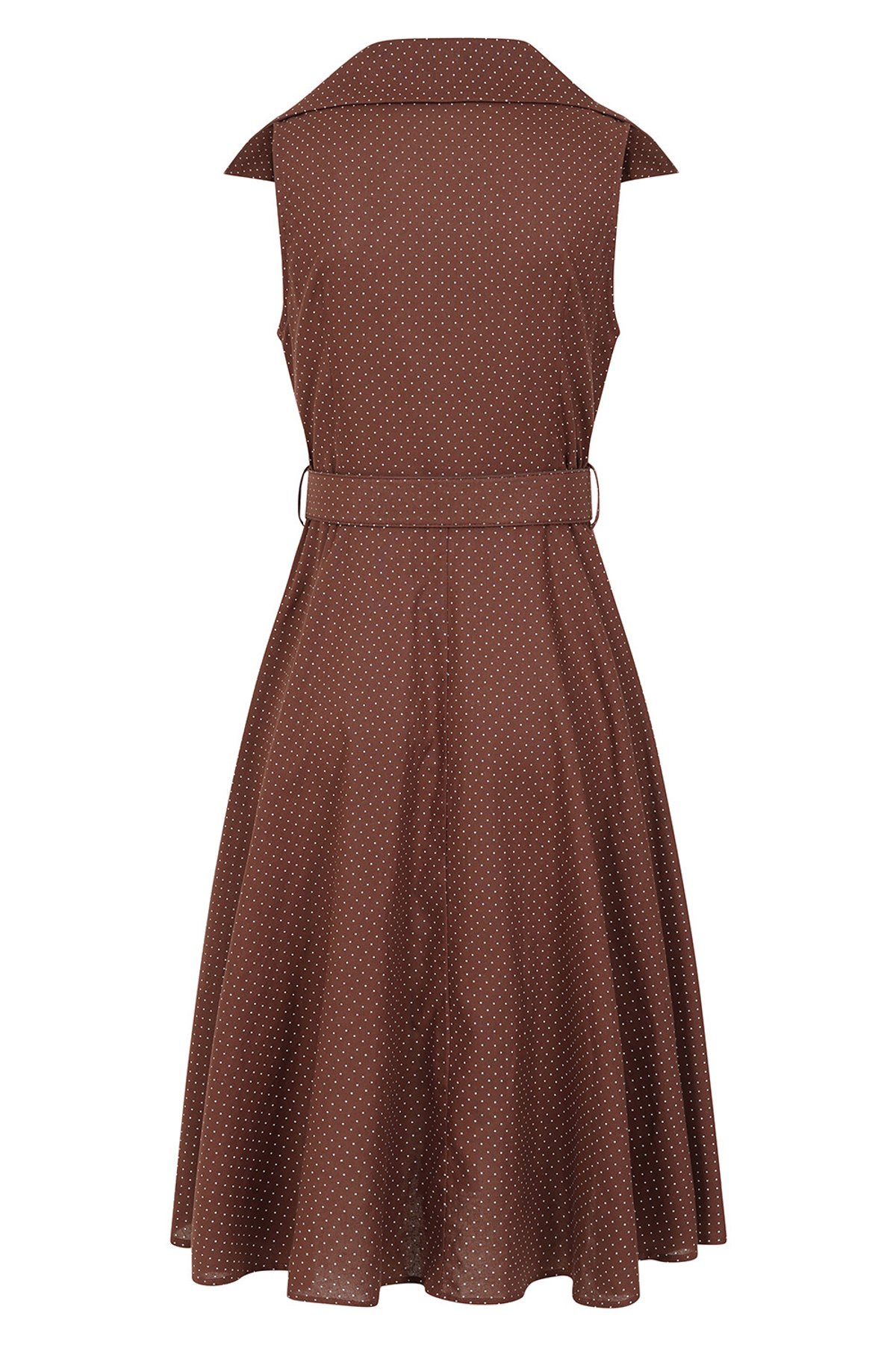 This banned apparel 1950’s inspired brown & cream polka dot is a stunning summer dress! This sophicated & flattering silhouette is made from an airy cotton & linen mix. This dress has a notched collar with a side front opening and side pockets! The belt is made from the beautiful polka spot with a contrast cream buckle.