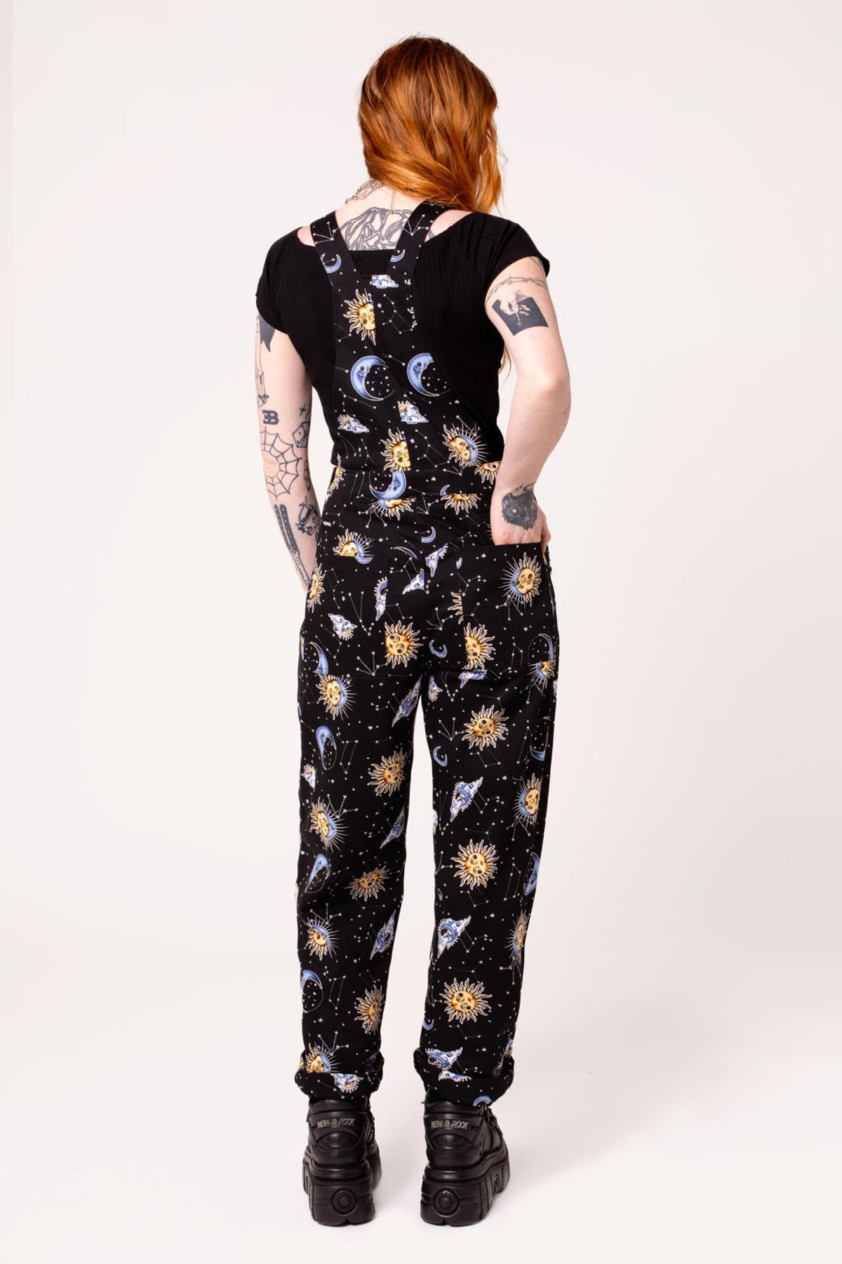 Get ready to orbit your style with the Solaris Dungarees—an interstellar mix of cosmic print and cool comfort. With their sleek black canvas adorned with enchanting moons and stars, these dungarees are truly purrfect for those who love a touch of celestial magic. Crafted from stretchy cotton twill, they hug your silhouette just right, offering a flawless fit that’s as versatile as it is eye-catching. Silver buttons at the hips and adjustable shoulder straps ensure you’re always in control of your look, while pockets galore keep everything you need close at paw. Whether you’re aiming for laid-back chic or a whimsical statement, these dungarees are your new wardrobe constellation.