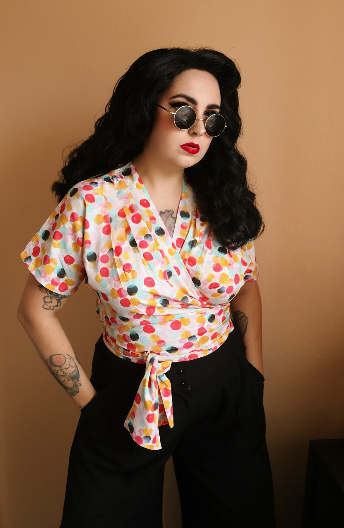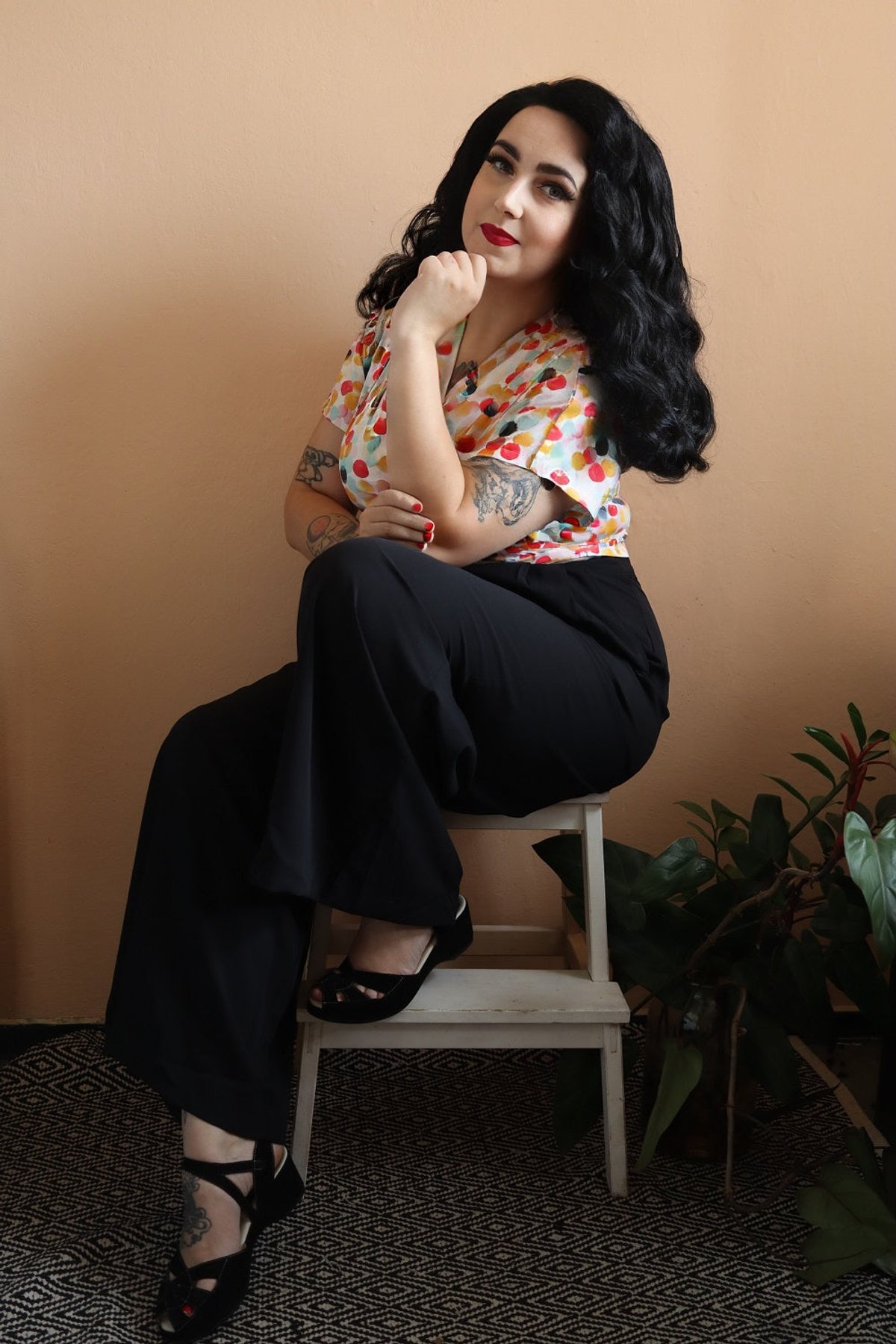 Step into the spotlight with our Sophia Palazzo Wide Leg Trousers in Black — where vintage allure meets modern sophistication. The high waist and double front buttons add a touch of retro glamour, while the flowing wide-leg silhouette creates a sleek, elongated look that’s utterly purrfect for making a stylish statement. Crafted from medium-weight Polly Crepe, these trousers drape effortlessly, giving you a look that’s both polished and comfortably chic. Whether you're channeling old Hollywood elegance or adding a twist to your everyday wardrobe, these trousers are a versatile must-have that elevate any outfit with a dash of timeless charm.