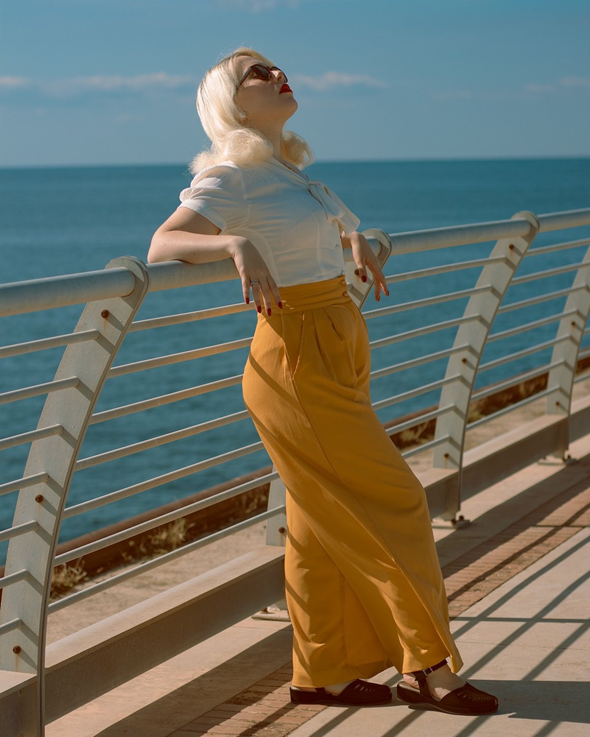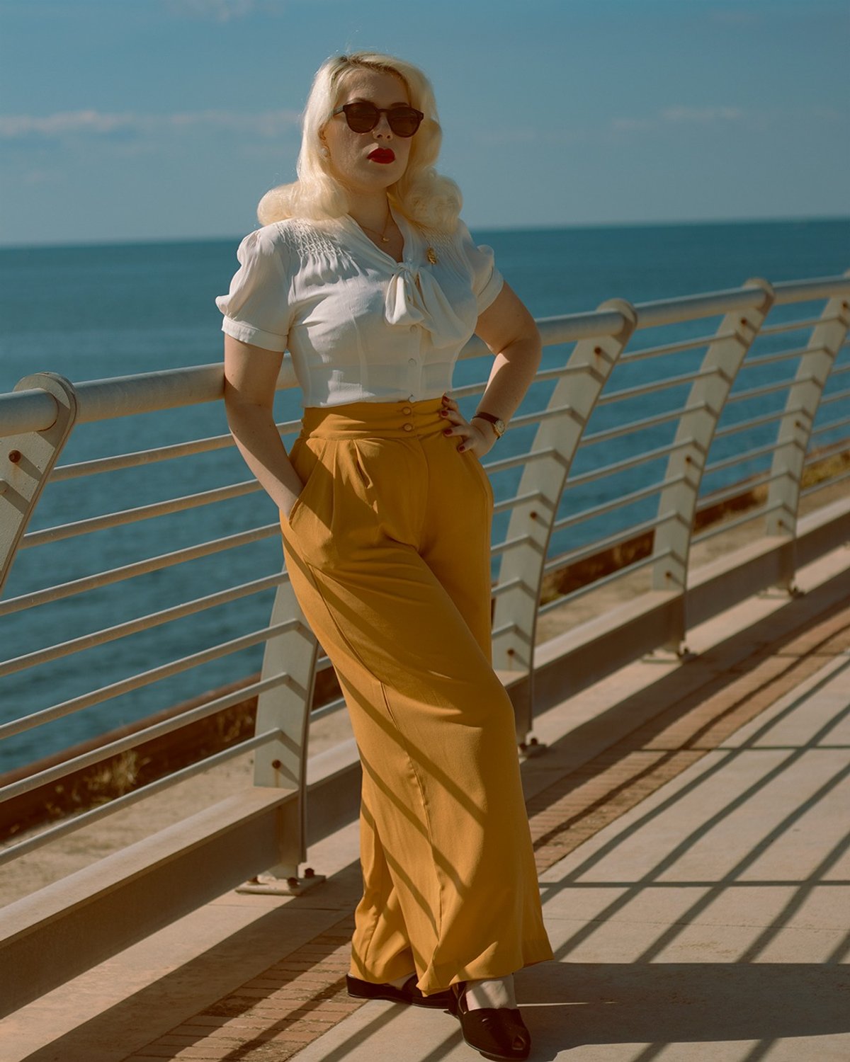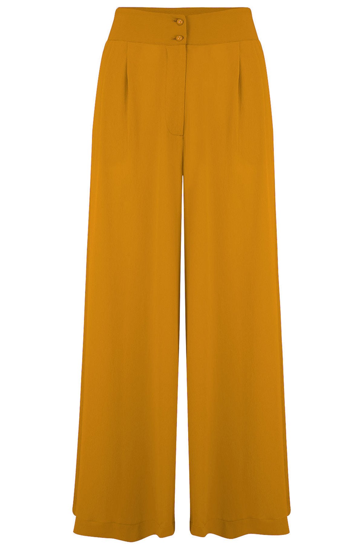 Unleash your inner starlet with the Sophia Palazzo Wide Leg Trousers in a bold, purrfect mustard hue. These trousers are a real showstopper, boasting a high waist that flatters curves and a dramatic wide-leg silhouette that commands attention. The double front buttons add a touch of vintage glamour, while the soft Polly Crepe fabric drapes with effortless grace — sharp enough for the office, yet relaxed enough for a chic evening out. Whether you're channeling old Hollywood elegance or making a statement in modern style, these trousers are a total game-changer for your wardrobe.
