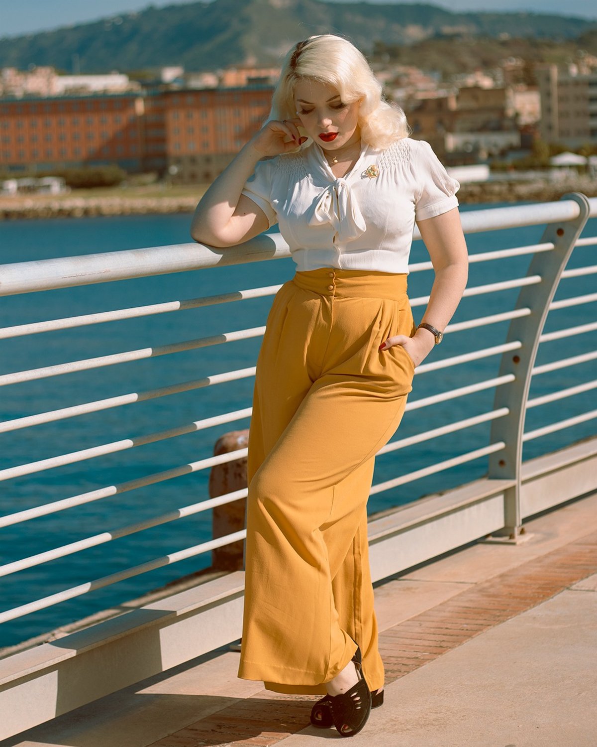 Add a sleek belt to emphasize the waist, or pair them with a fitted blouse for a polished look. For a playful twist, throw on some bold earrings or a statement clutch. Since these trousers are all about timeless elegance, keep accessories chic and understated, letting the mustard hue do all the talking.