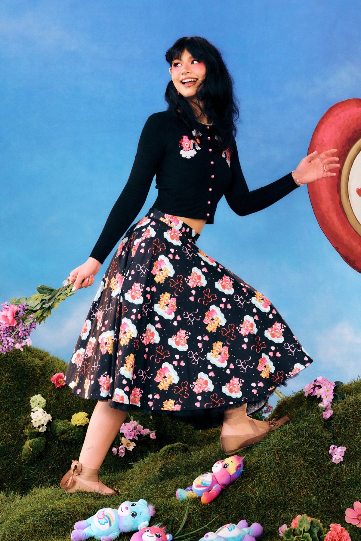 The Tenderheart Skirt comes alive on a classic black backdrop. It showcases the delightful dance of Love-a-Lot Bear and Tenderheart Bear, floating amidst dream-like clouds, complete with hearts and bows. This mid-length marvel’s flared silhouette is versatile for all your vintage stylings, whether you’re twirling at a garden soiree or adding a pinch of nostalgia to your everyday wear.💃