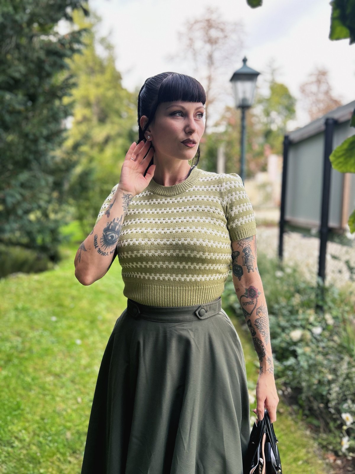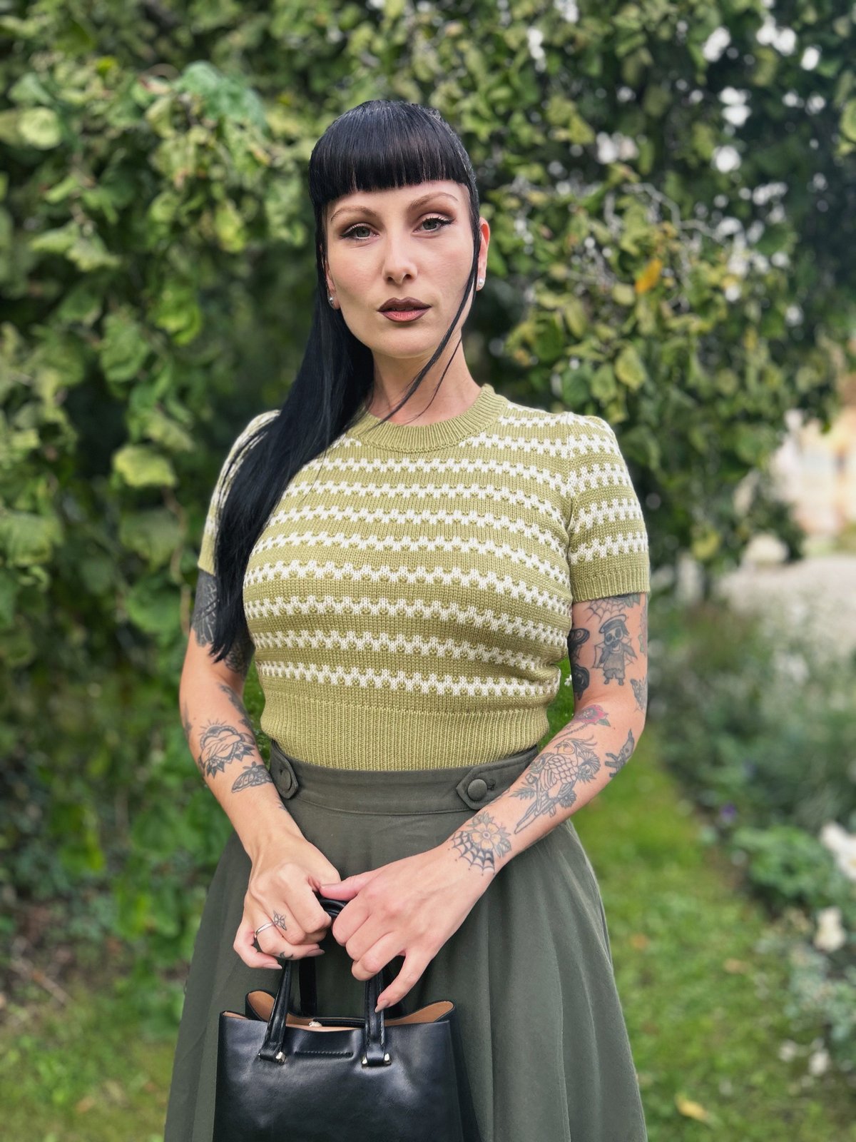 👗 Embrace a bygone era with The Vera Vintage Sage Green Jumper from Kitty Darling. This ’50s-inspired short sleeve pullover jumps out at you in a delightful sage green and white striped pattern. It’s a retro treasure 🏷, perfectly adaptable for any casual ’40s or ’50s look!