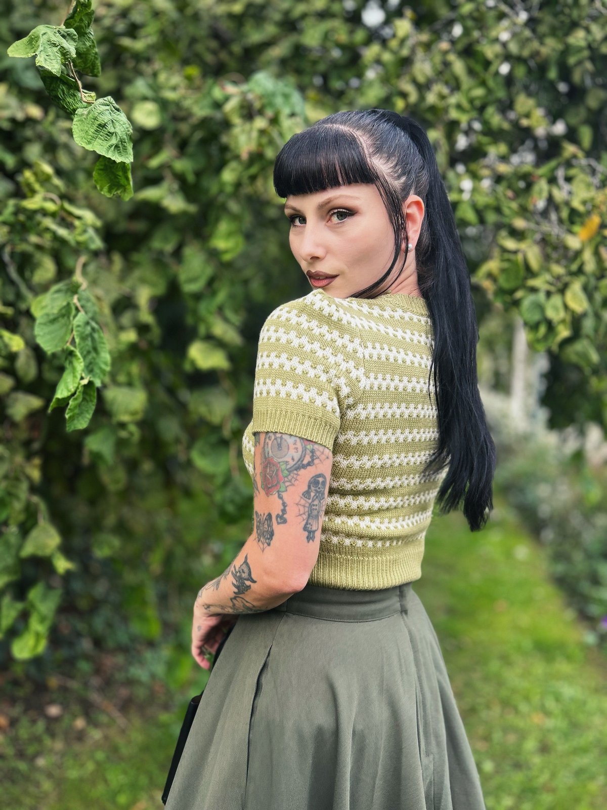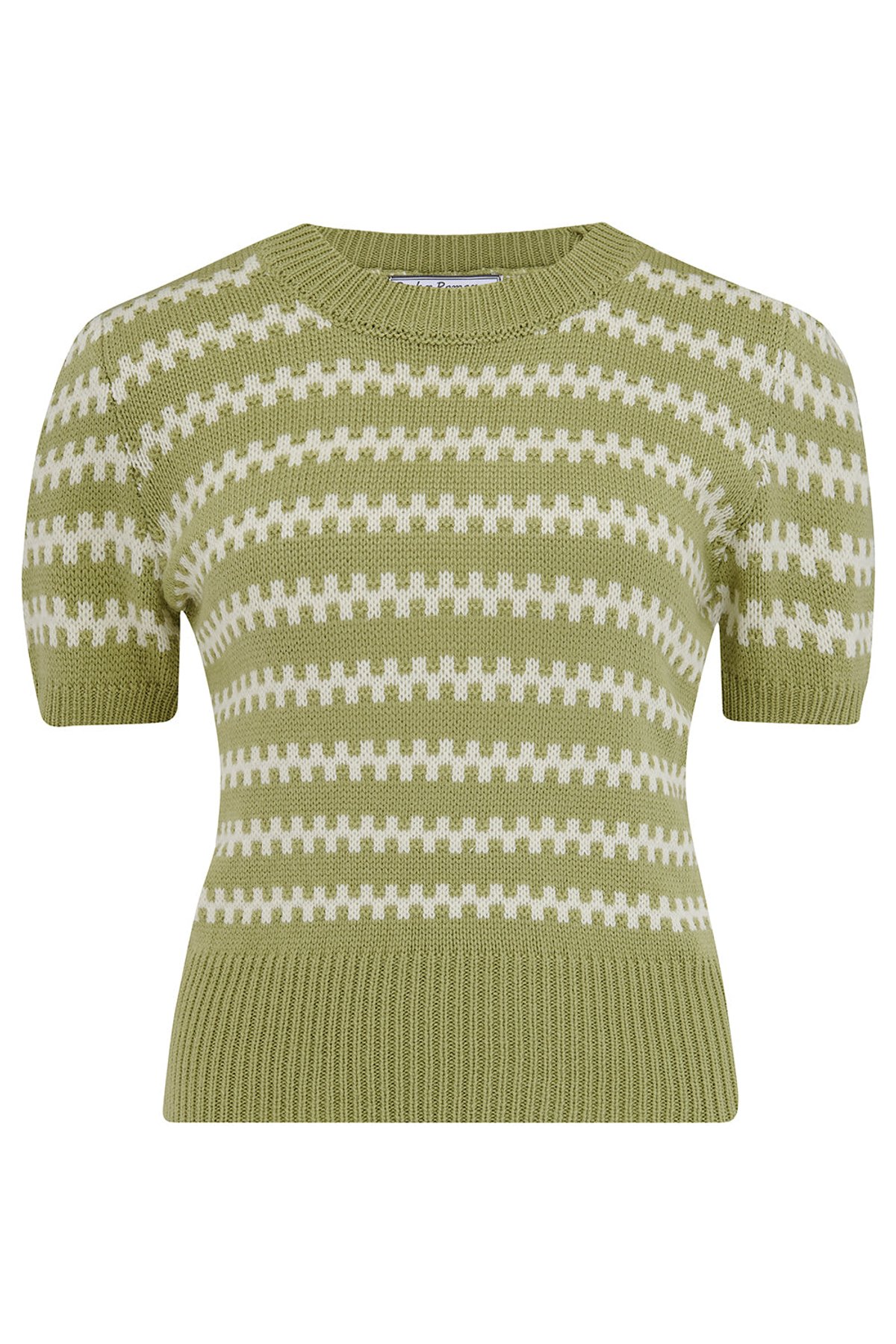 Introducing the Vera Short Sleeve Pullover Jumper in sage green—a purrfect blend of vintage charm and modern ease. With its delightful white stripes and classic knitted feel, this jumper is designed to make your casual look a tad more fabulous. Those charming neck buttons add just the right touch of retro flair, making slipping into style as smooth as a feline's glide. Whether you're lounging in comfort or stepping out with a bit of playful sophistication, Vera is your go-to for a look that's effortlessly chic and undeniably catwalk-worthy.