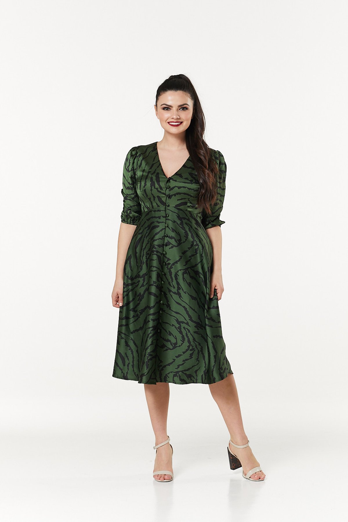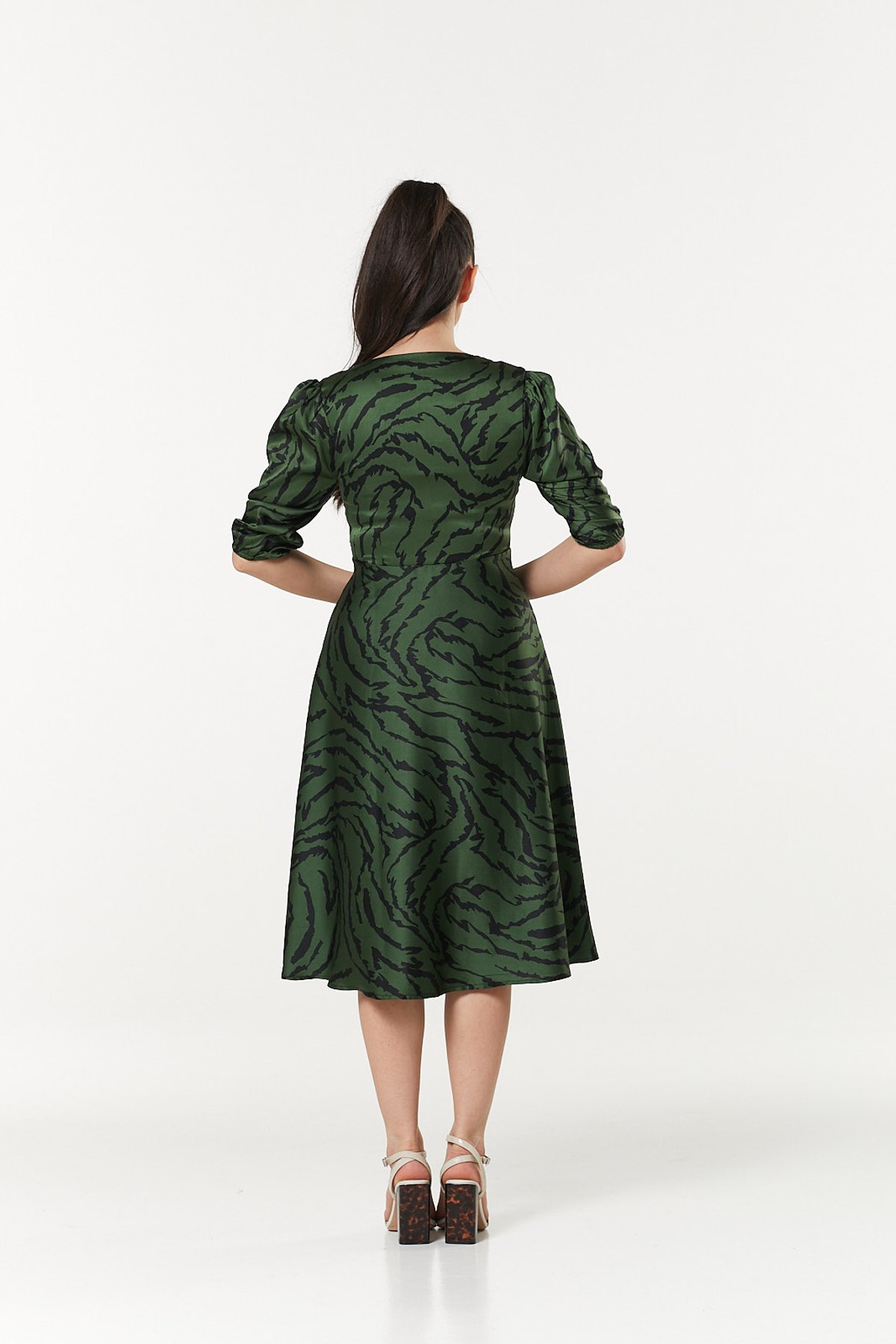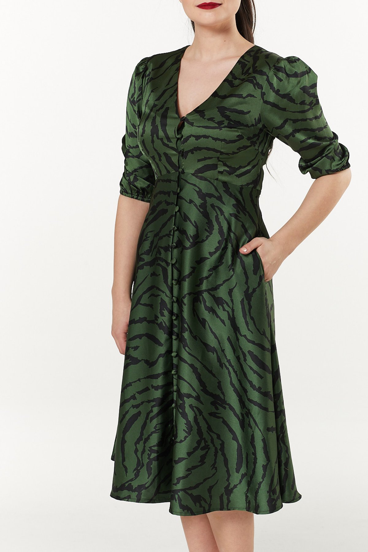 Unleash your inner enchantress with the Kira Dress — a mesmerizing blend of deep emerald and smoky black, adorned with swirling abstract patterns that seem to dance across the fabric. Its fluid silhouette and luxe detailing make it a purrfect choice for those who crave a touch of sophistication with a hint of whimsy. Whether you’re feeling daring or simply elegant, this dress is designed to make you feel utterly claws-down gorgeous.