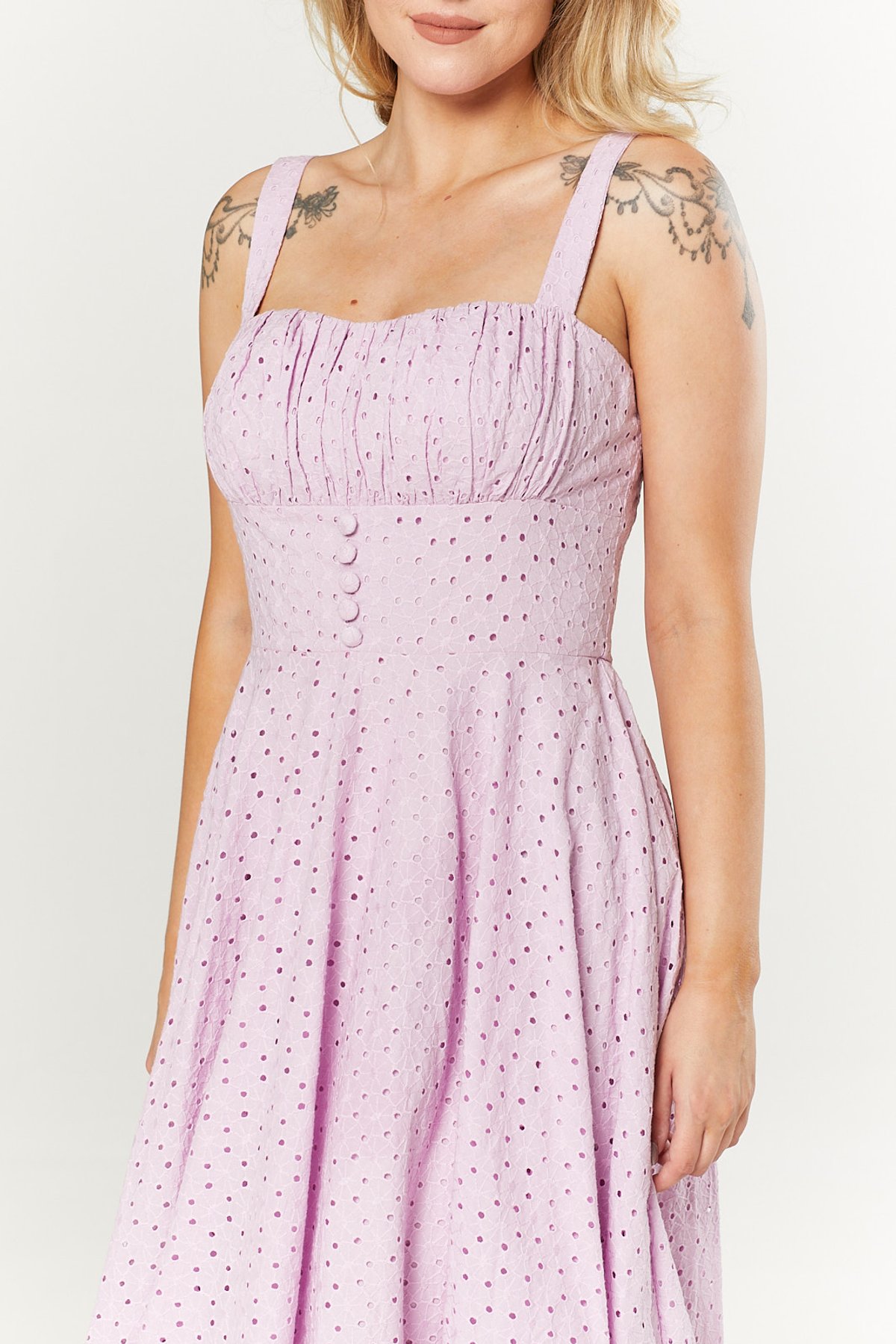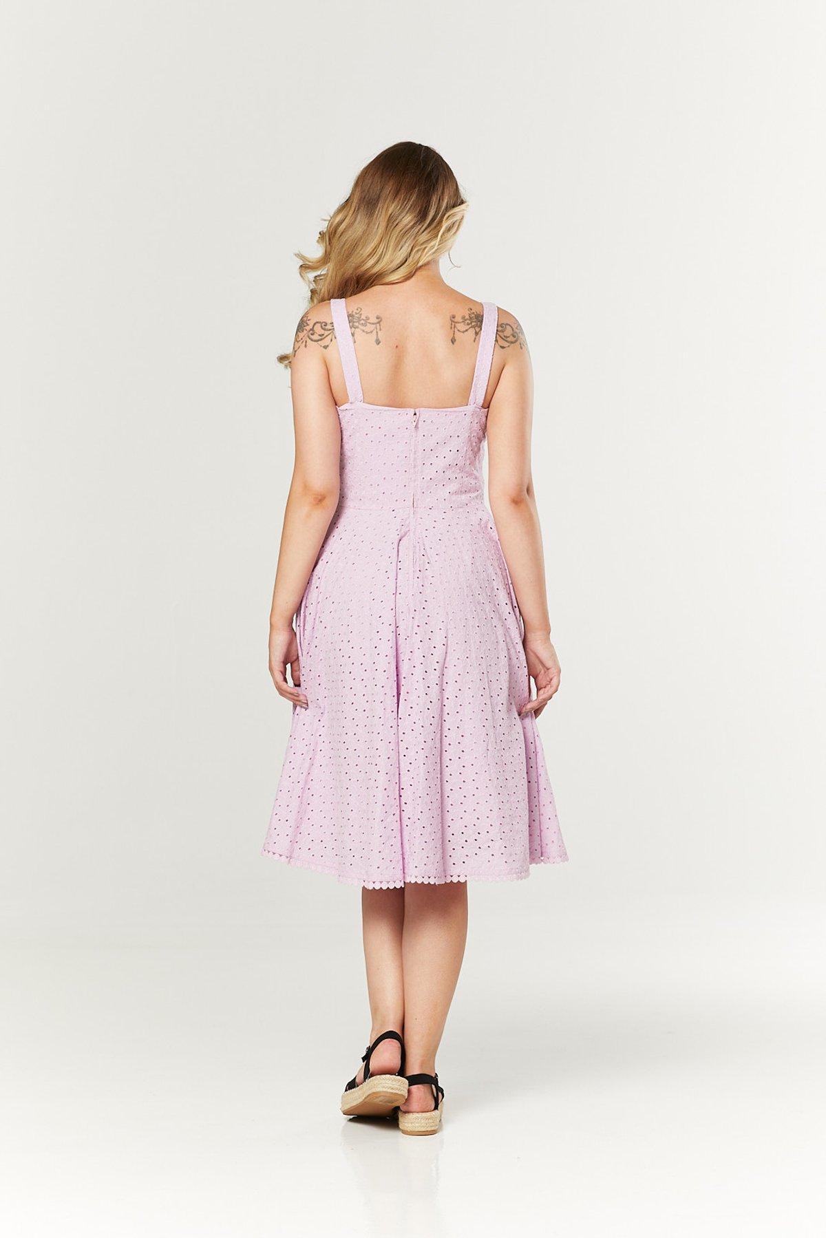 Step into a bouquet of vintage charm with the Valerie Lilac Dress — a true showstopper that’s as sweet as it is chic. The delicate eyelet pattern whispers timeless elegance, while the gathered bust and fitted waist create a silhouette that’s undeniably claws-down gorgeous. The swing skirt invites a playful twirl, making every moment feel like a dance through a sun-dappled garden. This dress is a purrfect blend of retro romance and modern flair, designed to turn heads and spark envy.