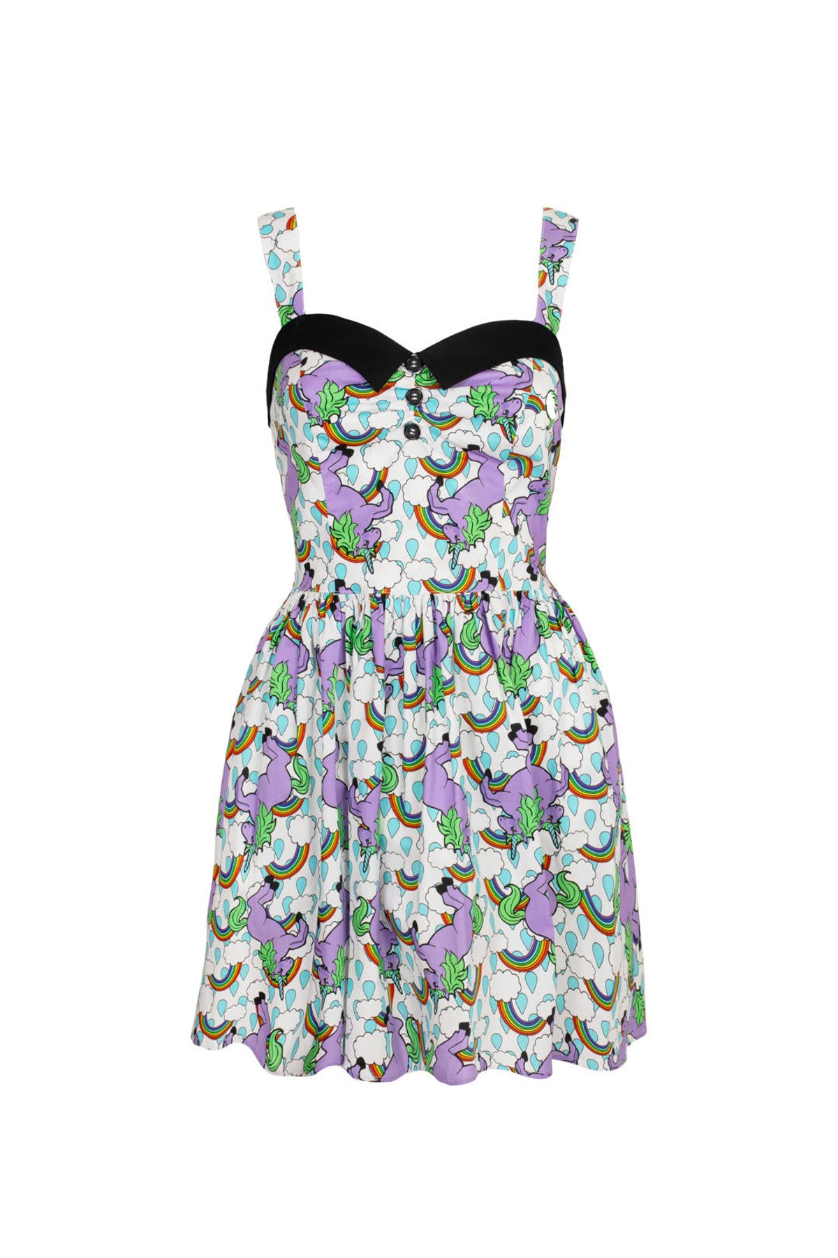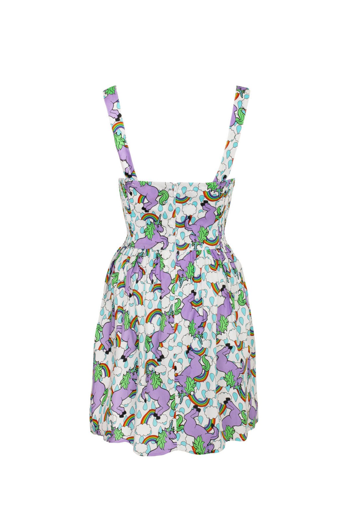 Unleash your inner fairy-tale muse with this purrfectly playful unicorn dress. The crisp white canvas is brought to life by whimsical unicorns and rainbows, all wrapped up in a flirty mini silhouette. The sweetheart neckline framed by a chic black collar trim adds a dash of sassy sophistication, while adjustable straps and elasticated shirring ensure a fit as comfortable as a catnap. Gathers at the waistband create a flared silhouette that’s as flattering as it is fun, and discreet side pockets keep your essentials close without weighing down your style. Crafted from a soft cotton-elastane blend, this dress offers a gentle stretch that moves with you, whether you’re twirling or struttin’ with claws-down gorgeous confidence.