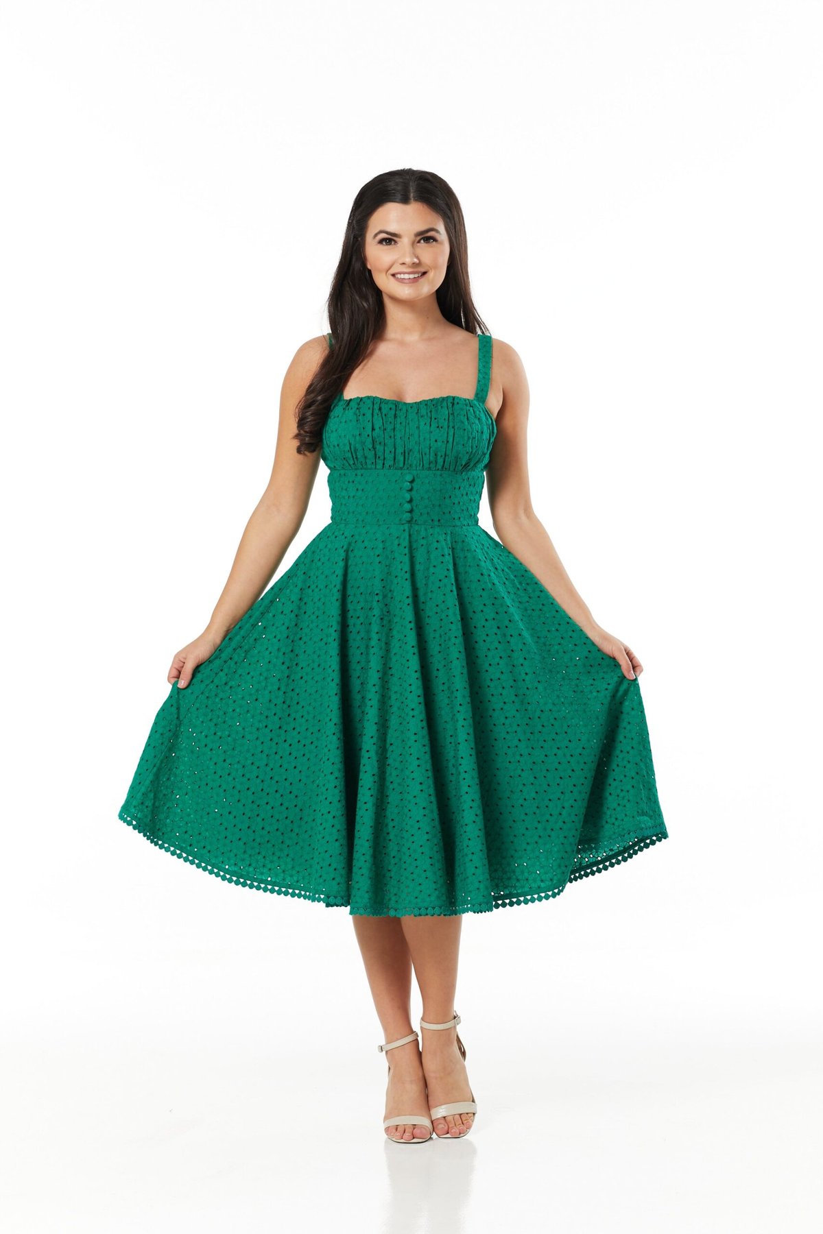 Whether it’s a romantic garden soiree or a sun-drenched picnic, the Valerie Green Dress assures your style is always blooming. 👒 Pair it with sleek heels for a chic look or pair it with white trainers for a laid-back mood. With its rockabilly essence, it’s truly a dress for all occasions. Celebrate life’s little moments with this nod to 50s fashion, embodying the spirit of an era where style and fun reigned supreme. 💃