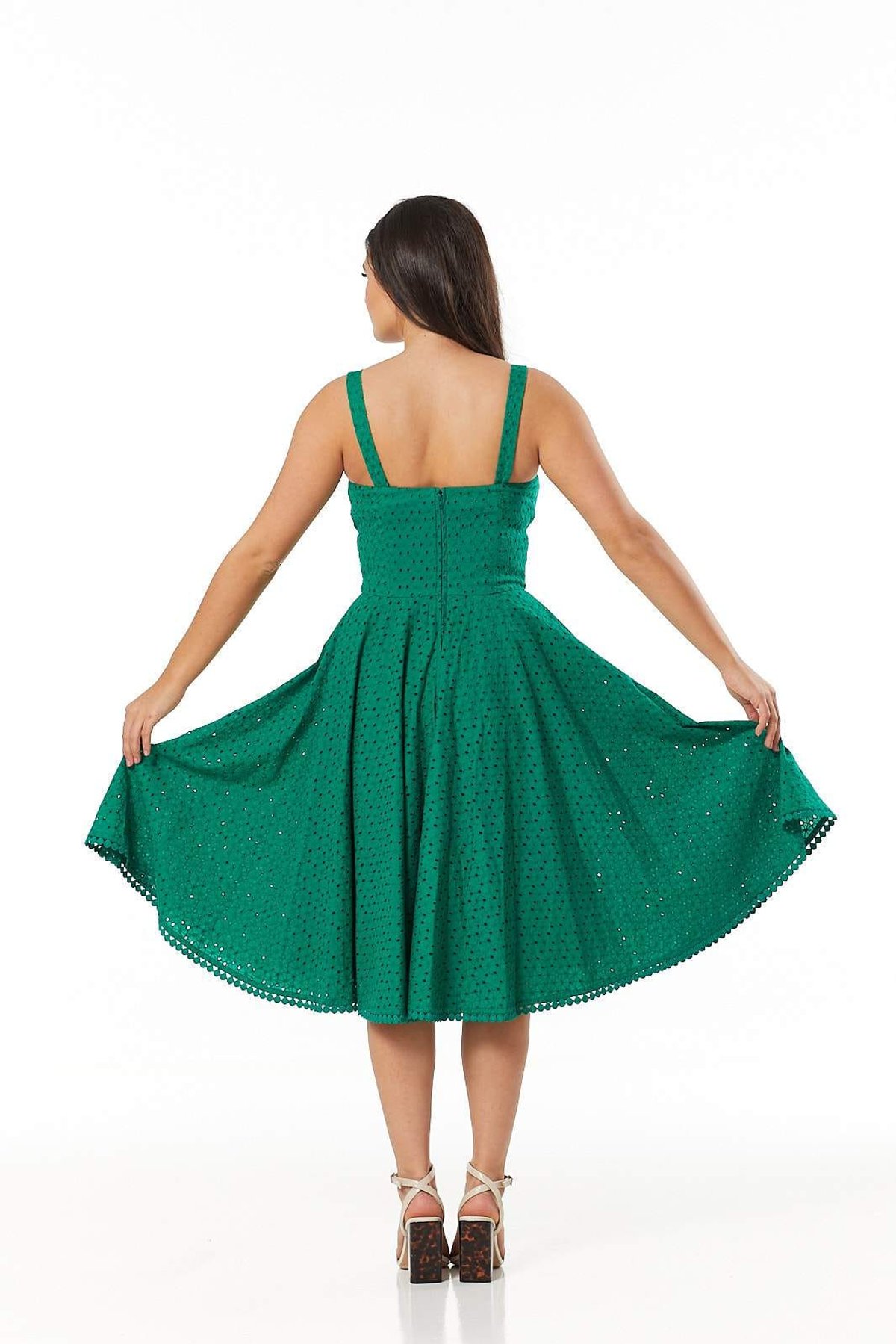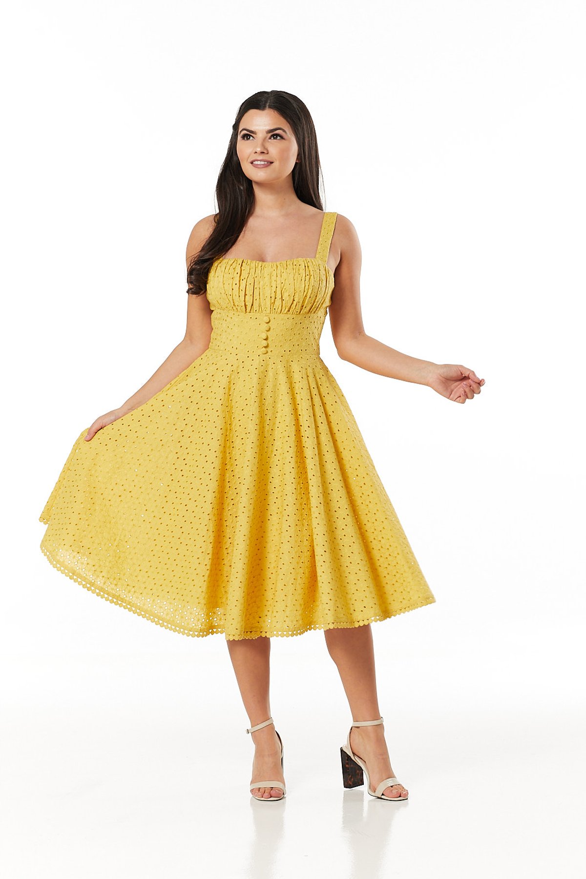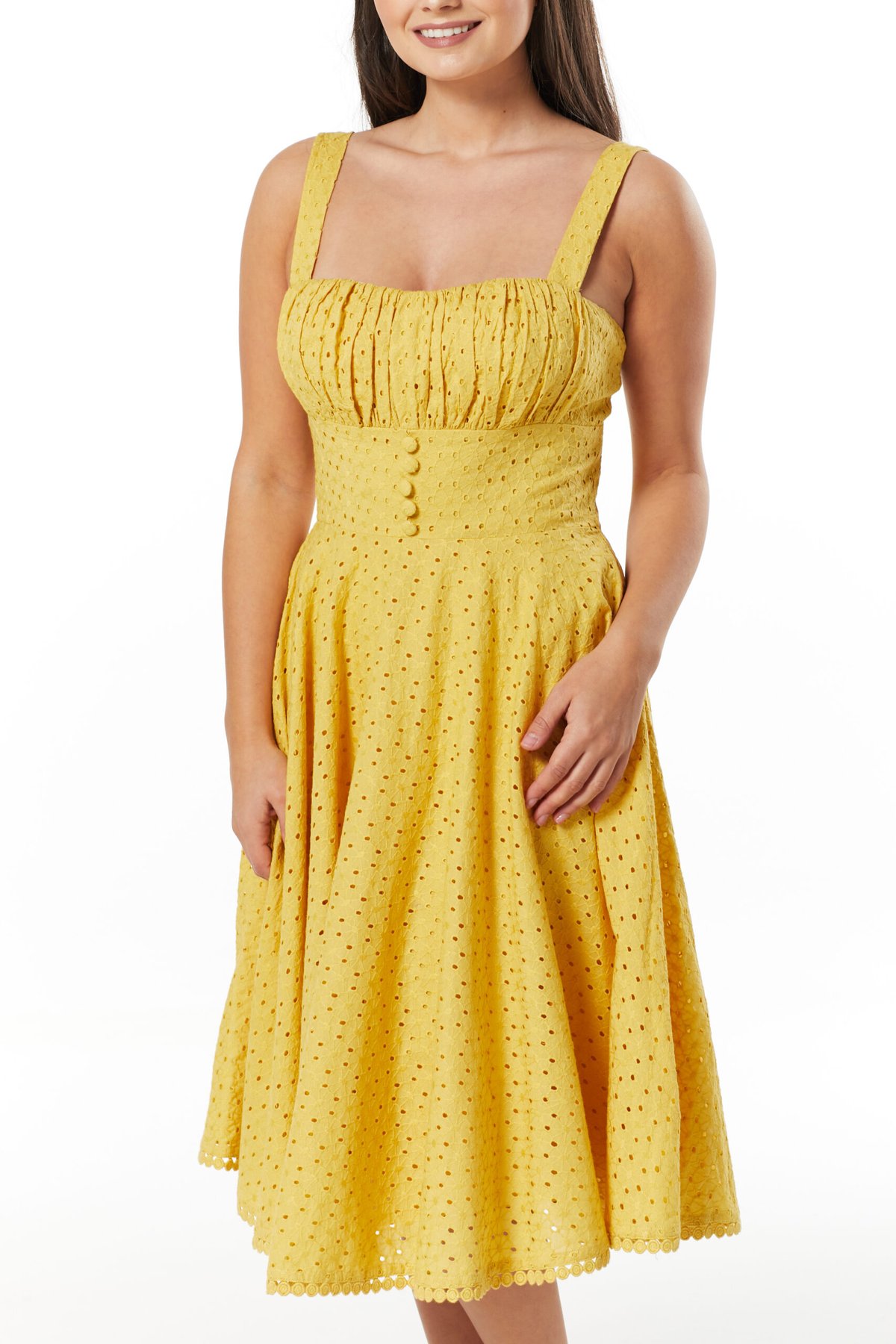 Meet your new go-to for a look that’s both charming and downright irresistible. The Valerie Mustard dress radiates vintage appeal with its eyelet pattern and lively mustard hue—think of it as your ticket to springtime fabulousness. The clever bust gathering and fitted waist create a silhouette that’s as flattering as it is fun, while the swing skirt invites you to twirl with reckless abandon. It’s a purrfect blend of retro allure and modern chic, designed to turn heads and make every outing a little more special.