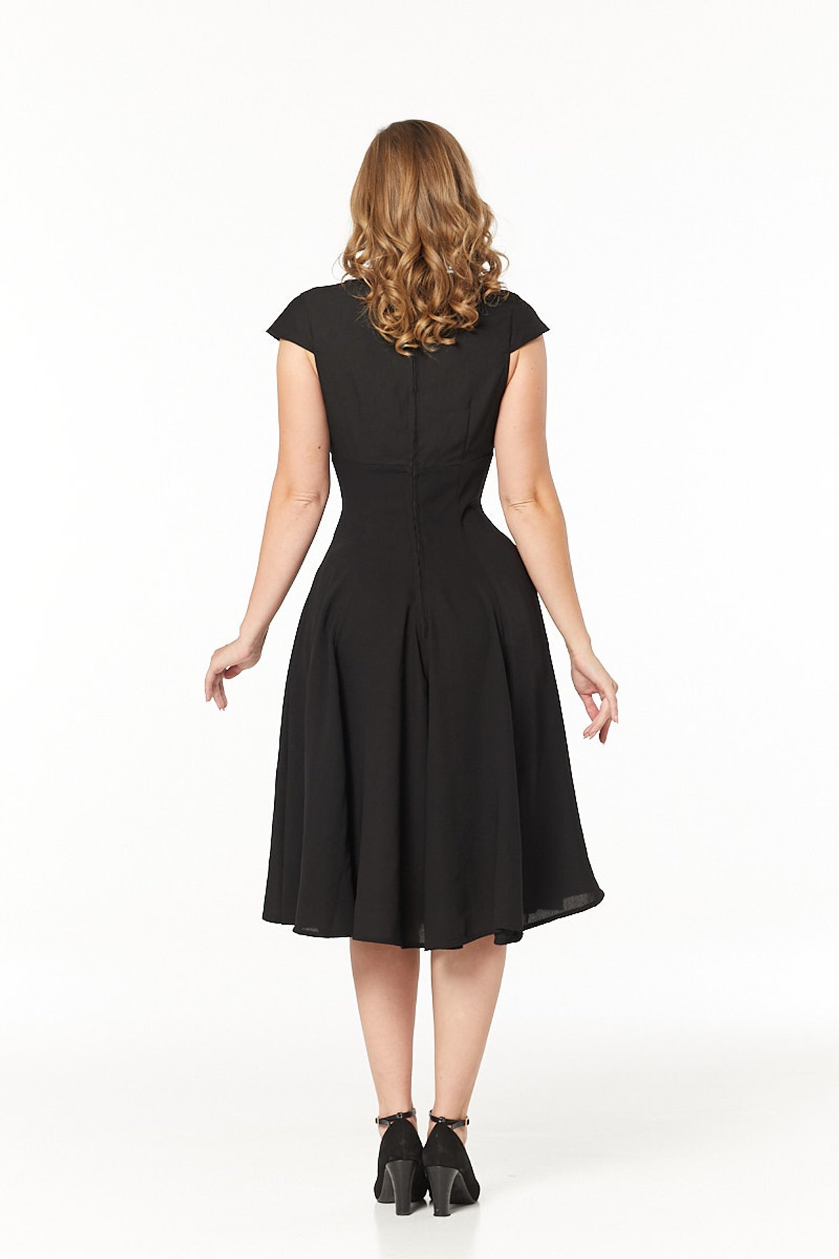Infused with rockabilly charm, this stunning dress boasts of exquisite floral embroidery, stitching stories of timeless femininity on its classic black canvas. Your audience can’t help but be spellbound as these delicate flowers twirl and sway with you! 🌸