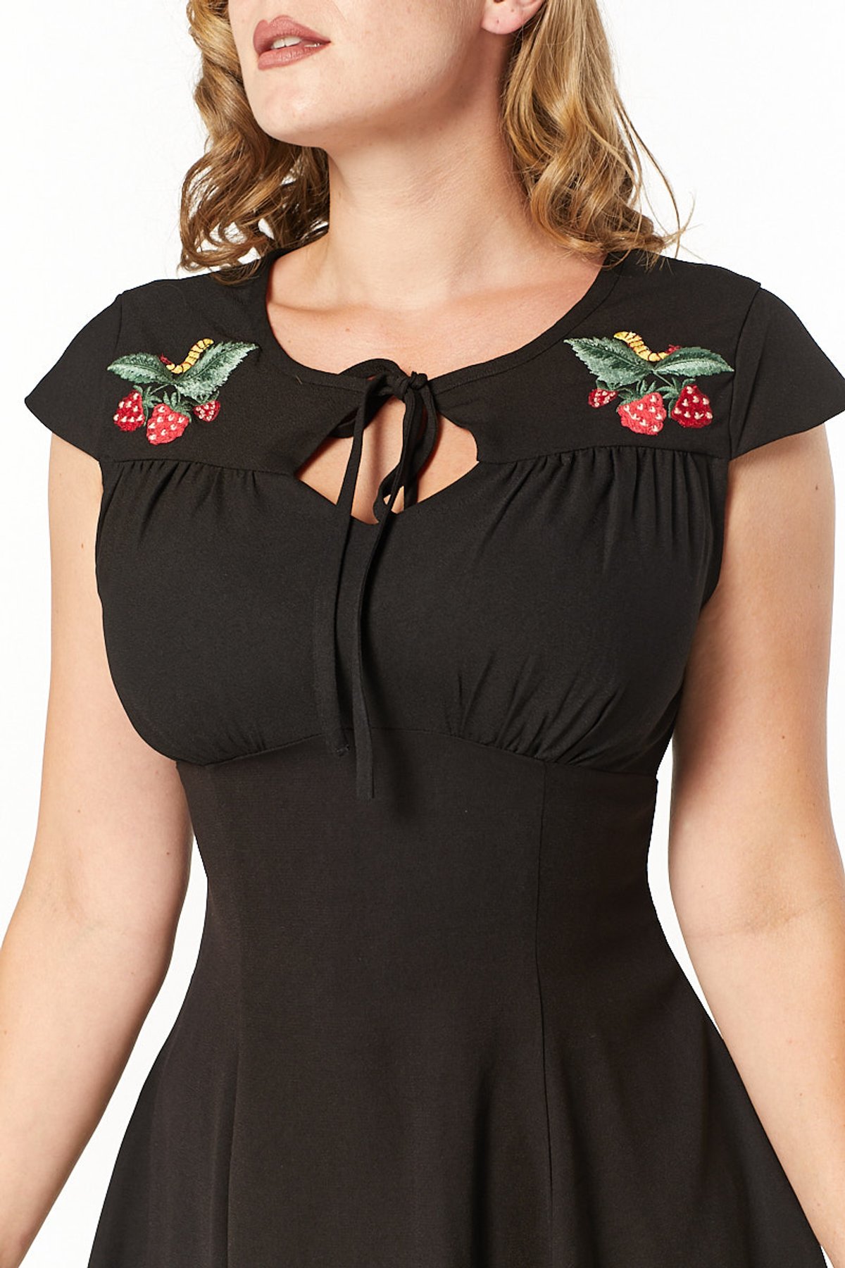 Elevate your vintage wardrobe with the Adalee Dress—a true starlet of timeless charm. Its sleek black silhouette is beautifully adorned with delicate floral embroidery, creating a look that's both sophisticated and subtly playful. This dress boasts classic lines with a modern twist, making it an irresistibly purrfect choice for those who love to turn heads and embrace their inner retro diva.