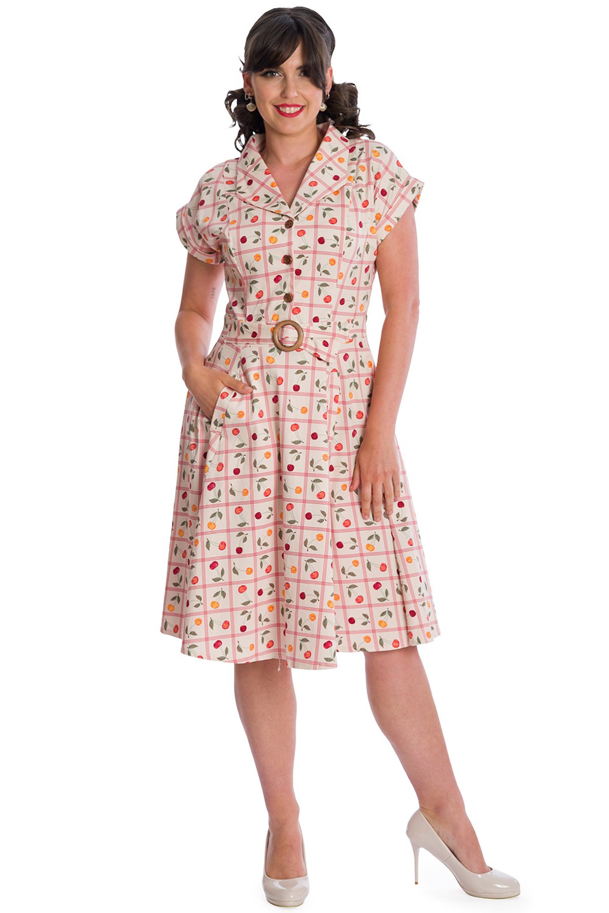Step into vintage vivacity with our OffWhite COUNTRY CHERRY FIT & FLARE COLLAR DRESS—an absolute purrfection for those who love a dash of retro charm. This beauty boasts a playful cherry floral grid pattern on a crisp off-white canvas, all wrapped up in a flattering fit-and-flare silhouette. The charming collar adds a touch of sophistication, making it a versatile piece that’s equally at home for a daytime brunch or an evening soirée. Crafted from a comfy yet chic cotton blend, it’s tailor-made to keep you looking sharp and feeling fabulous—perfect for twirling the night away or simply basking in your own feline fabulousness.