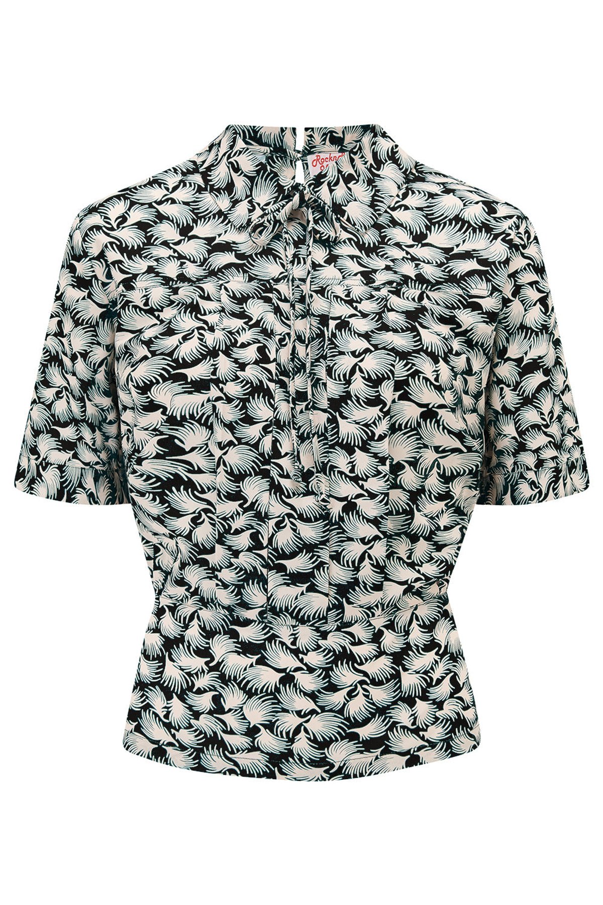 🎀💃 Step into a time capsule of glamorous style with Kitty Darling’s Vintage Chic Elsie Blouse. Showcasing an abstract leaf-print design on a black and white canvas, this charismatic piece truly embodies the elegance of the fabulous 1950s 🍂🖤