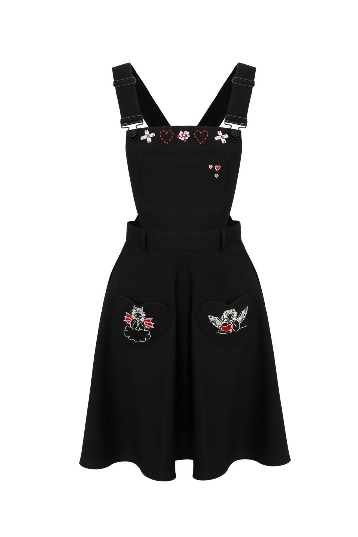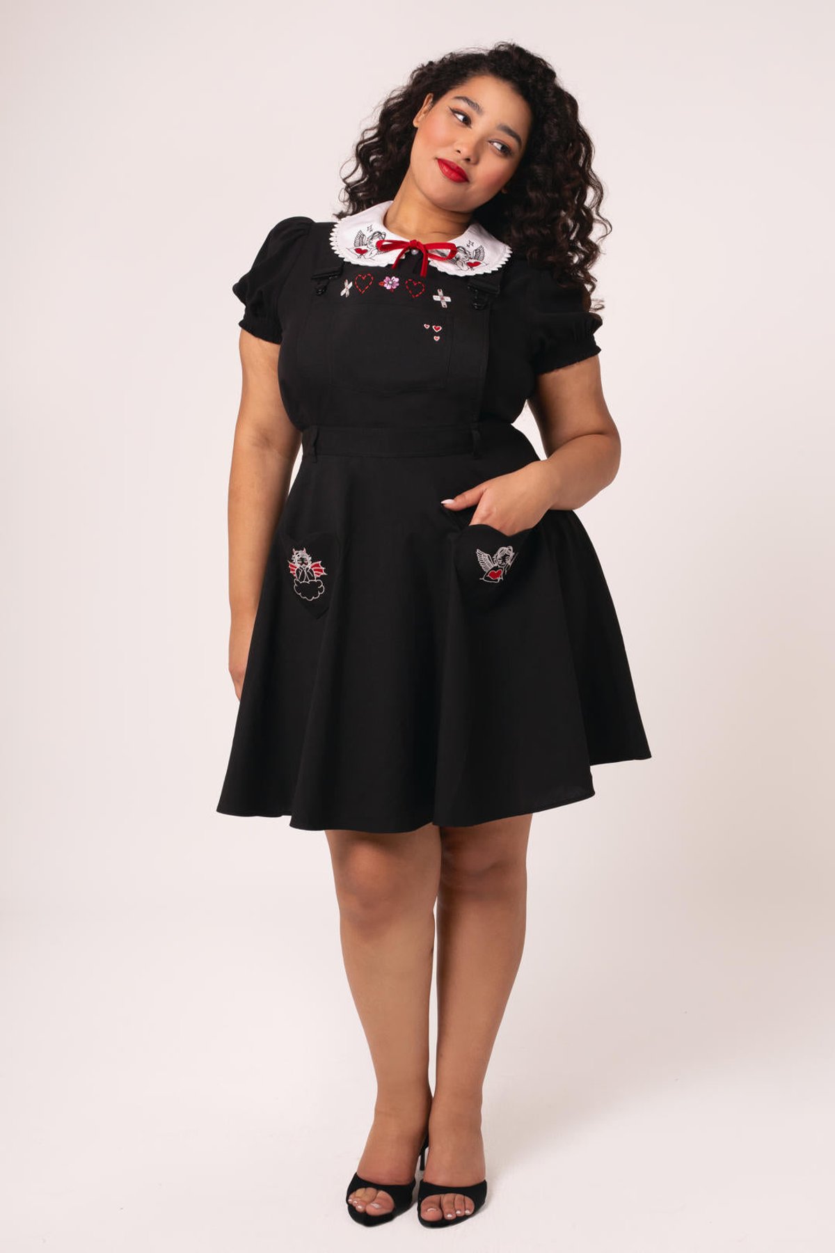 Unleash your inner vintage vixen with the Cupid Pinafore Dress—a playful nod to retro charm that’s as flirty as it is fabulous. With its sleek black hue, delightful heart-shaped pockets, and embroidered accents, this mini dress is a true showstopper. The adjustable cross-back straps add a mischievous twist to the classic silhouette, ensuring a fit that’s as unique as your personality. Whether you’re feeling sweet or a little bit daring, this piece will have you feeling claws-down gorgeous and effortlessly chic.