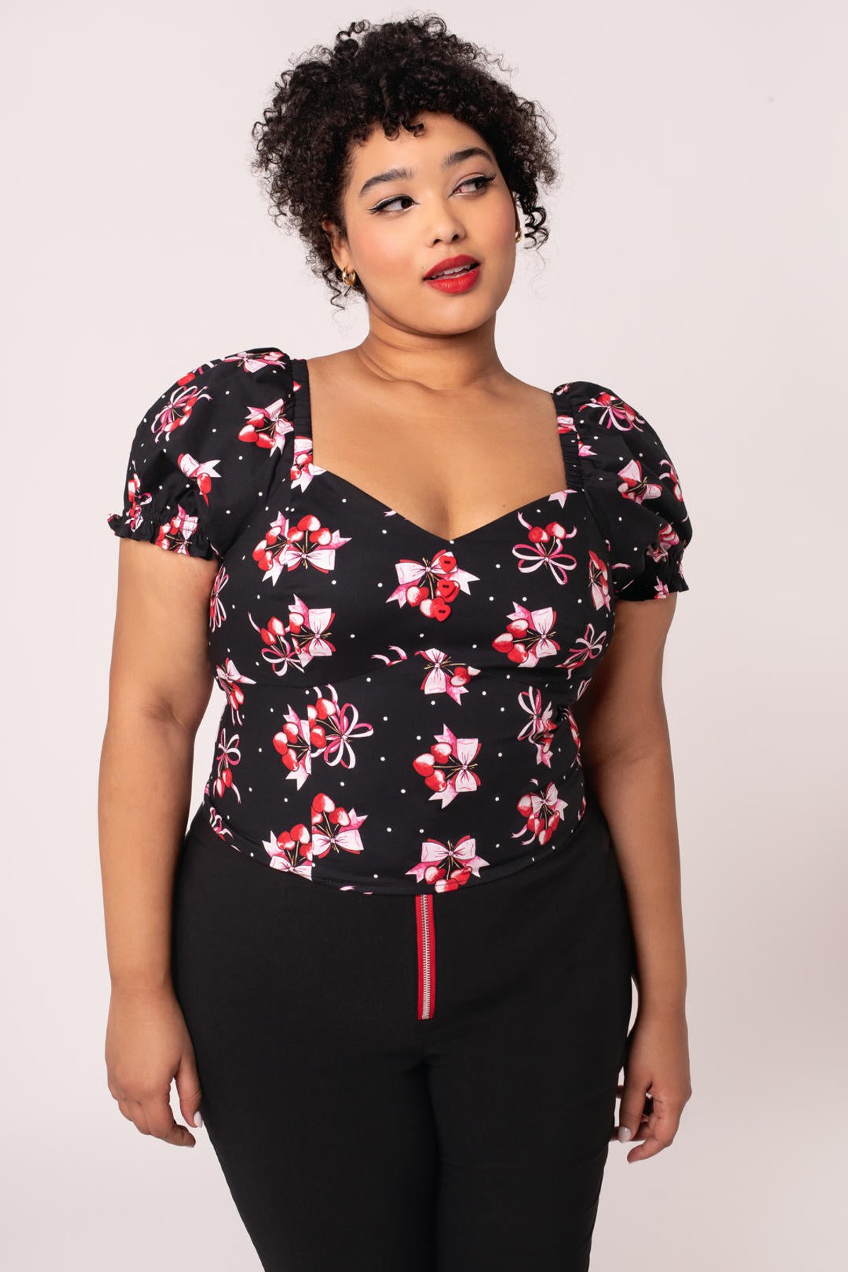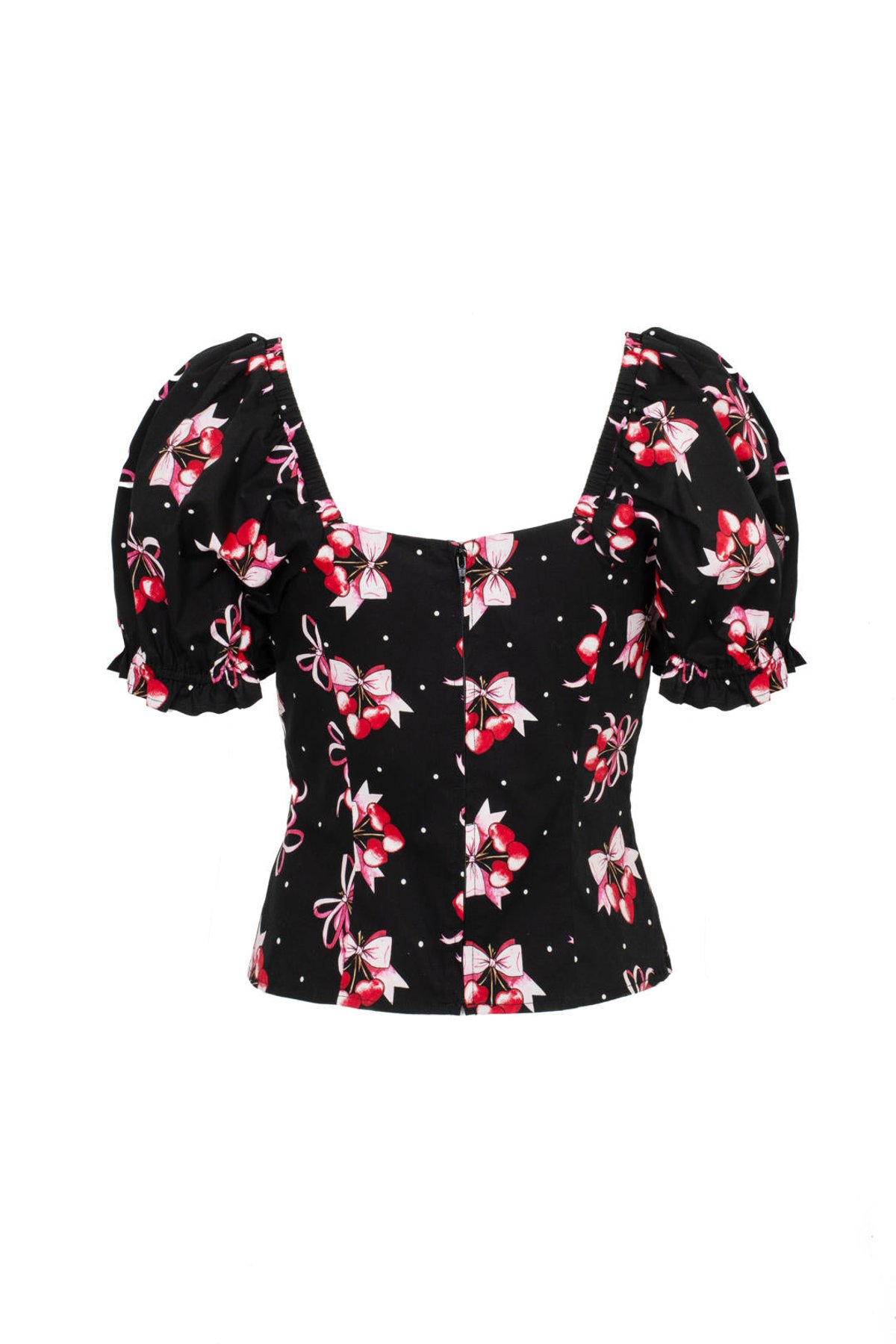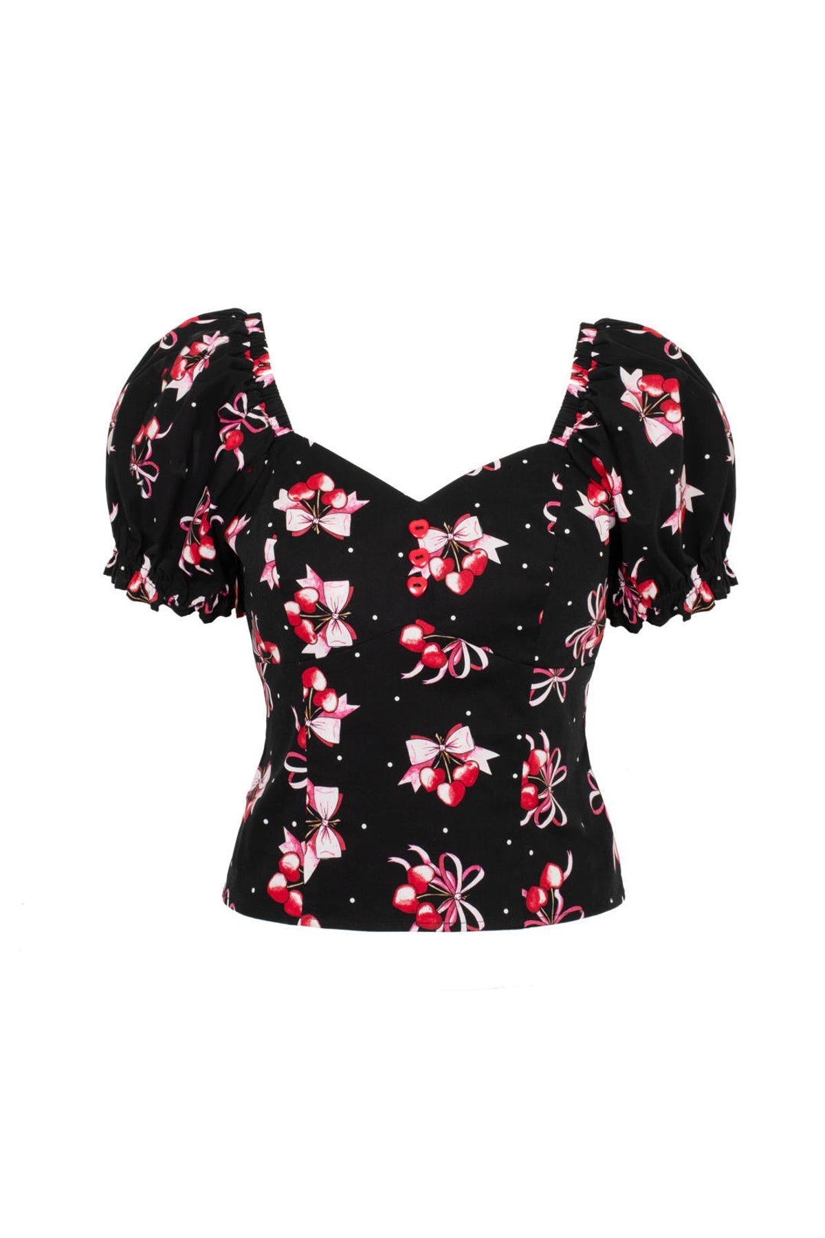 Unleash your inner vintage vixen with the Cherilyn Top—where playful florals meet a hint of flirtatious charm. This black beauty, dotted with sweet pink bows and fiery red heart-shaped cherries, is designed to turn heads and spark compliments. The sweetheart neckline with adorable red heart buttons oozes retro allure, while the puff sleeves with elastic cuffs add just the right touch of sass. Crafted from a comfy cotton blend with a pinch of elastane, this piece promises a flattering fit that moves with you. It’s more than just a top; it’s your new secret weapon for a look that’s both chic and cheeky, perfect for those days when you’re feeling a little extra adorable.