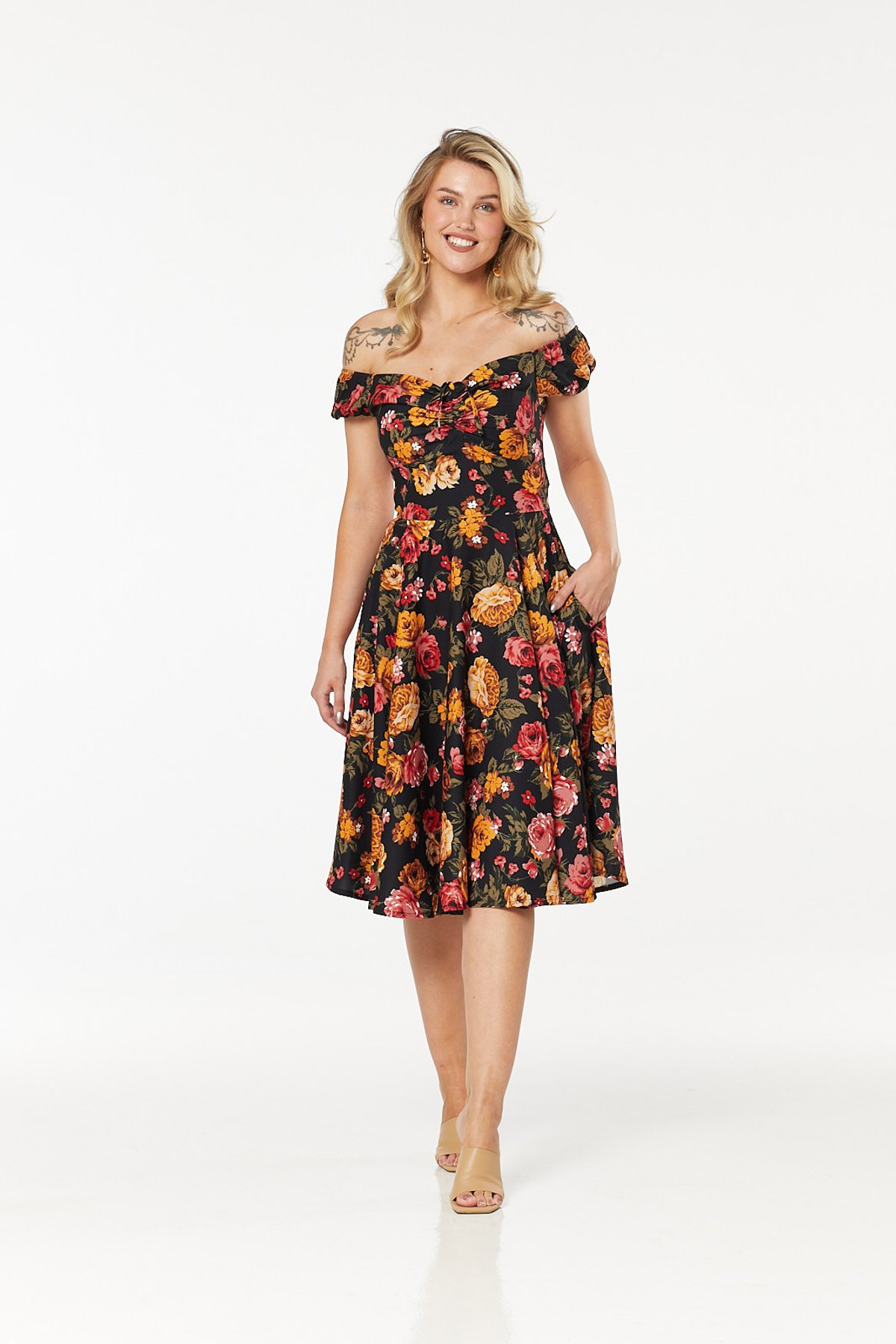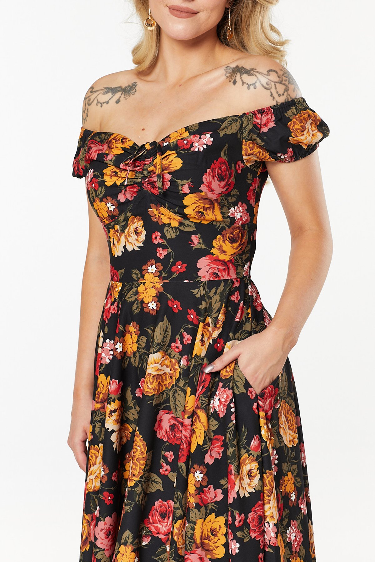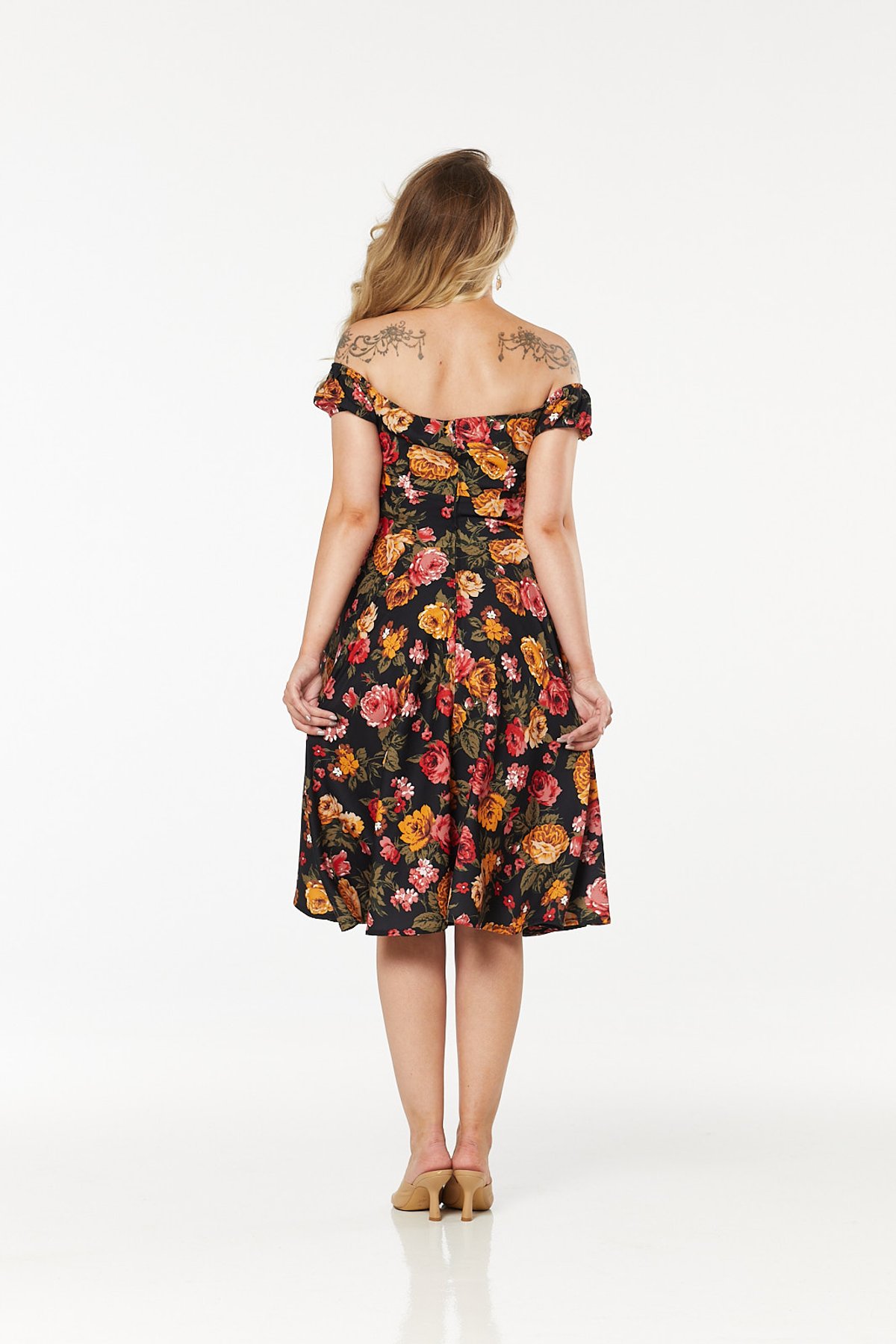 Unleash your inner star with the Moni Dress — a true purrfection in vintage-inspired style. Its sleek black backdrop is a lush canvas for vibrant red and golden roses, creating a floral fantasy that’s as eye-catching as it is timeless. The off-shoulder puff sleeves and charming adjustable bow add a playful, feminine touch, while the flared mid-length skirt will have you sashaying with effortless grace. Crafted from lightweight crepe, this dress offers purrfect comfort for all-day adventures, whether you’re strutting through city streets or enjoying a romantic garden soirée. It’s a statement piece that whispers vintage glamour with every step.