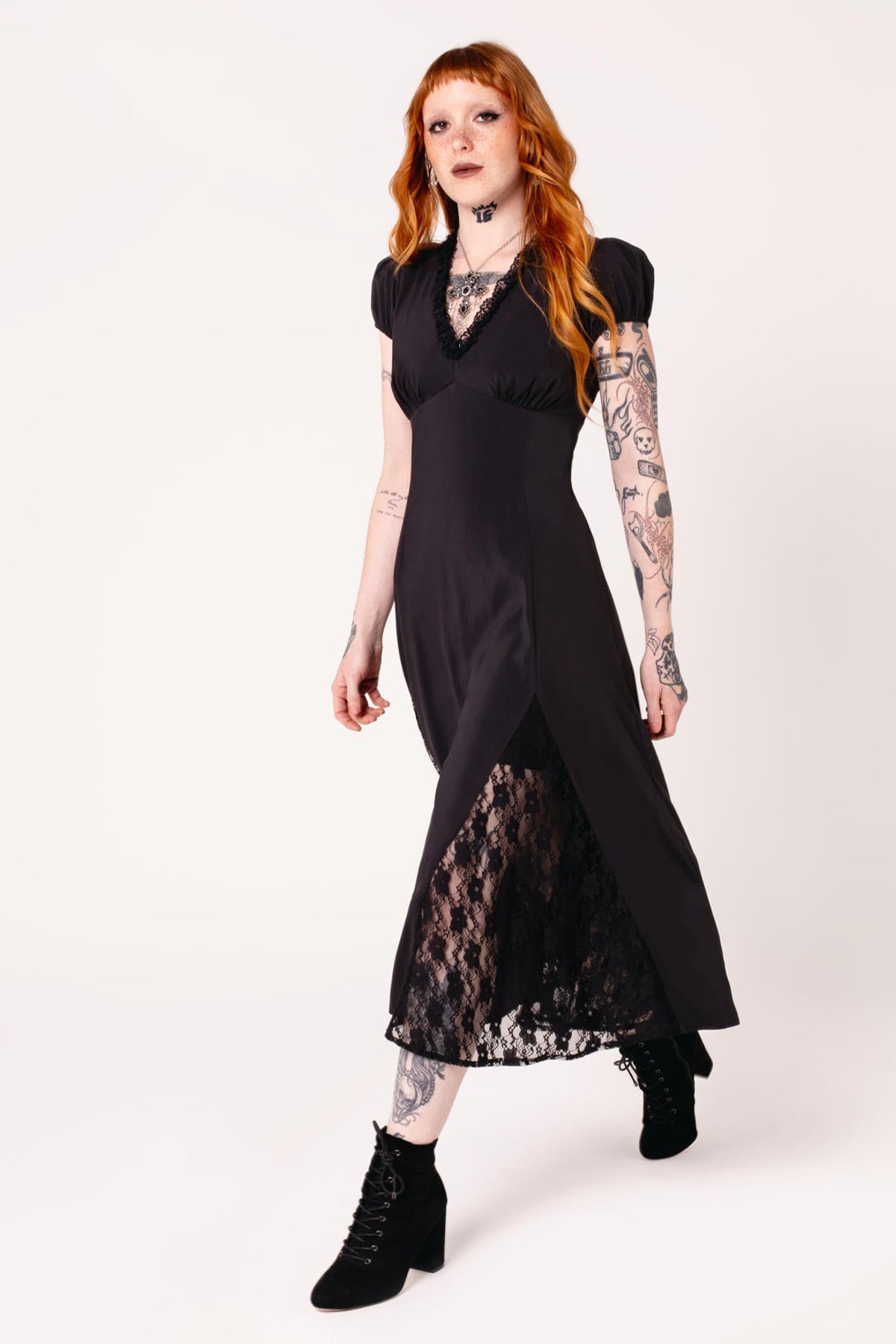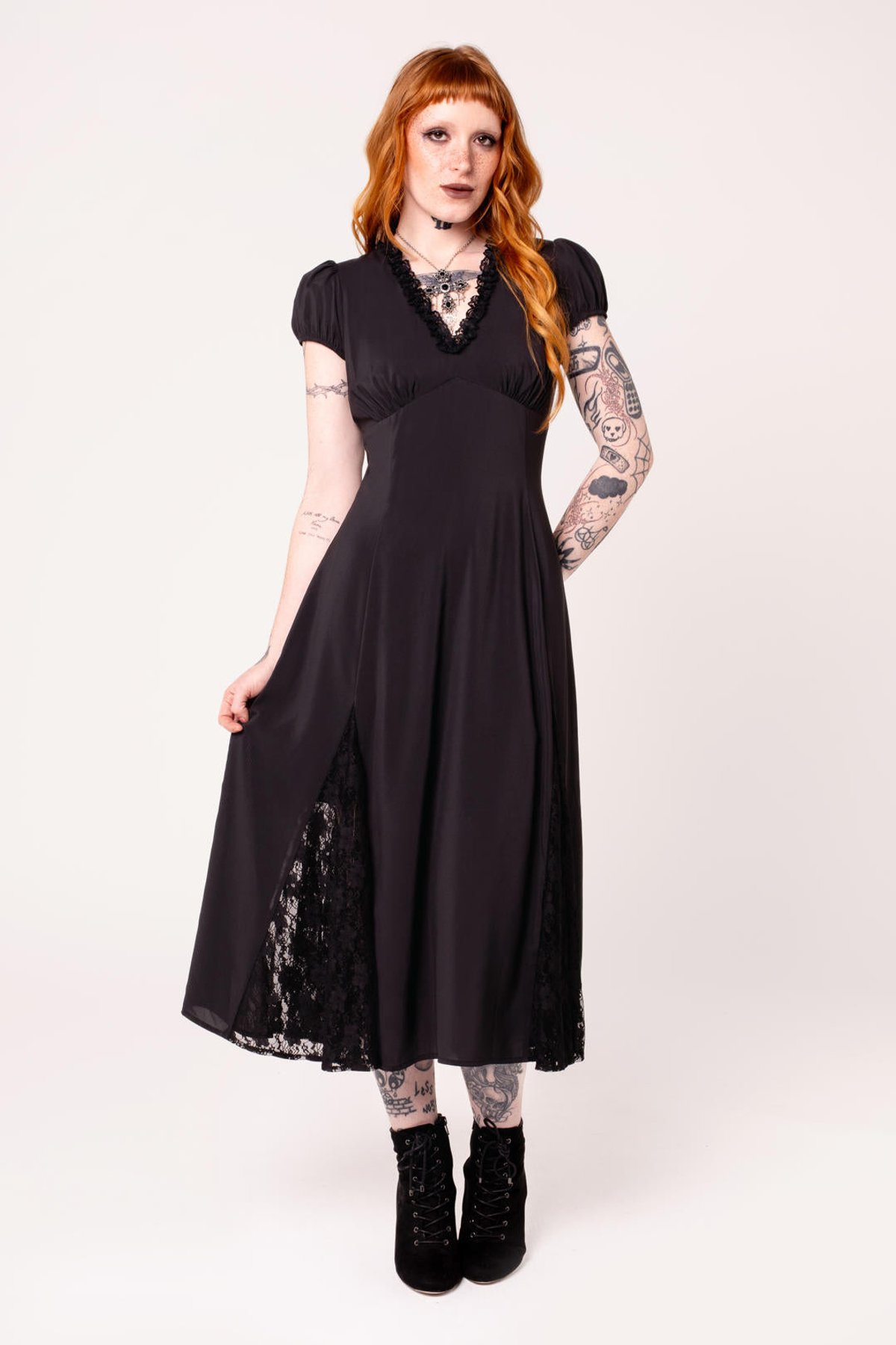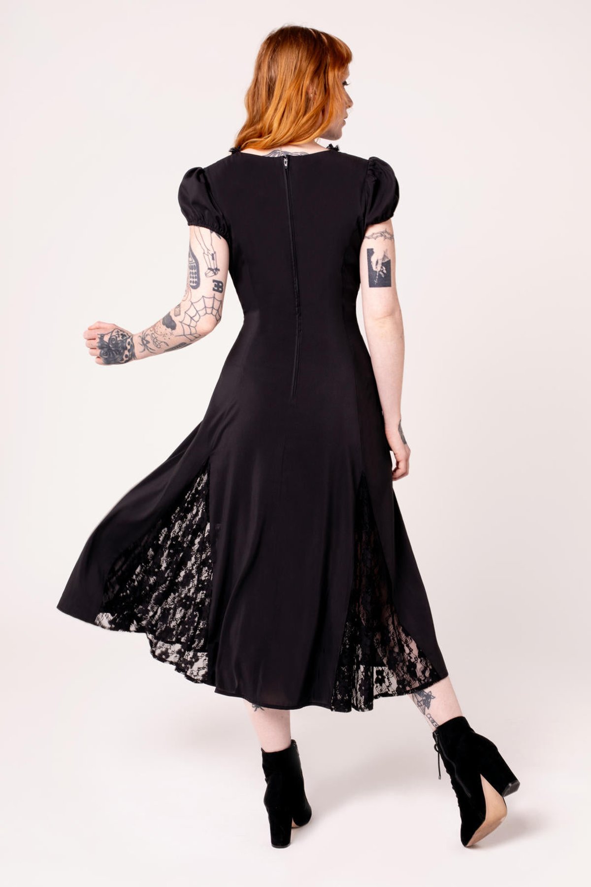 Unleash your inner gothic goddess with the Edith Dress—an alluring blend of vintage charm and daring elegance. Its sleek black fabric, accented by delicate lace godets that swirl with every step, creates a mesmerizing silhouette that’s both timeless and temptingly modern. The V-neckline, trimmed in subtle black, whispers sophistication, while the playful puff sleeves add just the right touch of feline flirtation. Whether you're feeling mysterious or bold, this dress purrs versatility and style all in one.