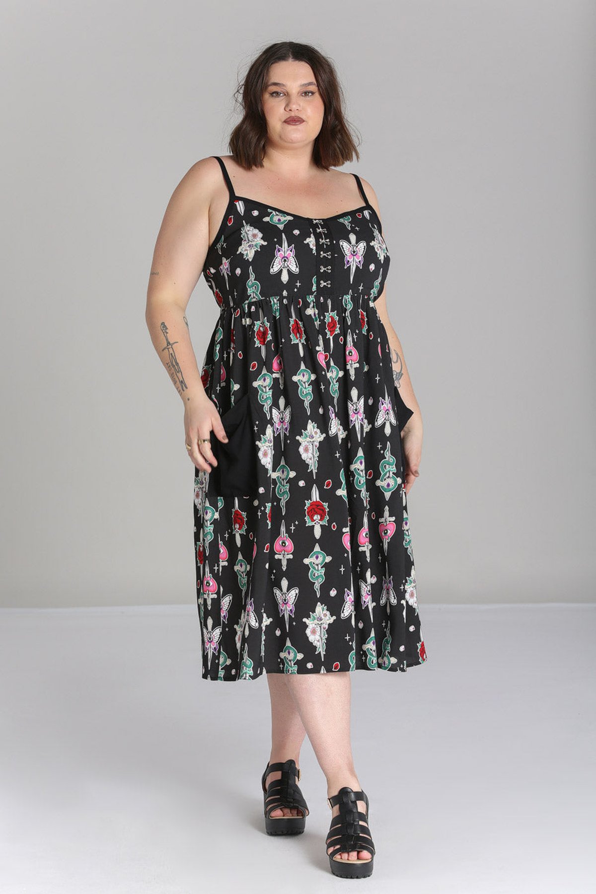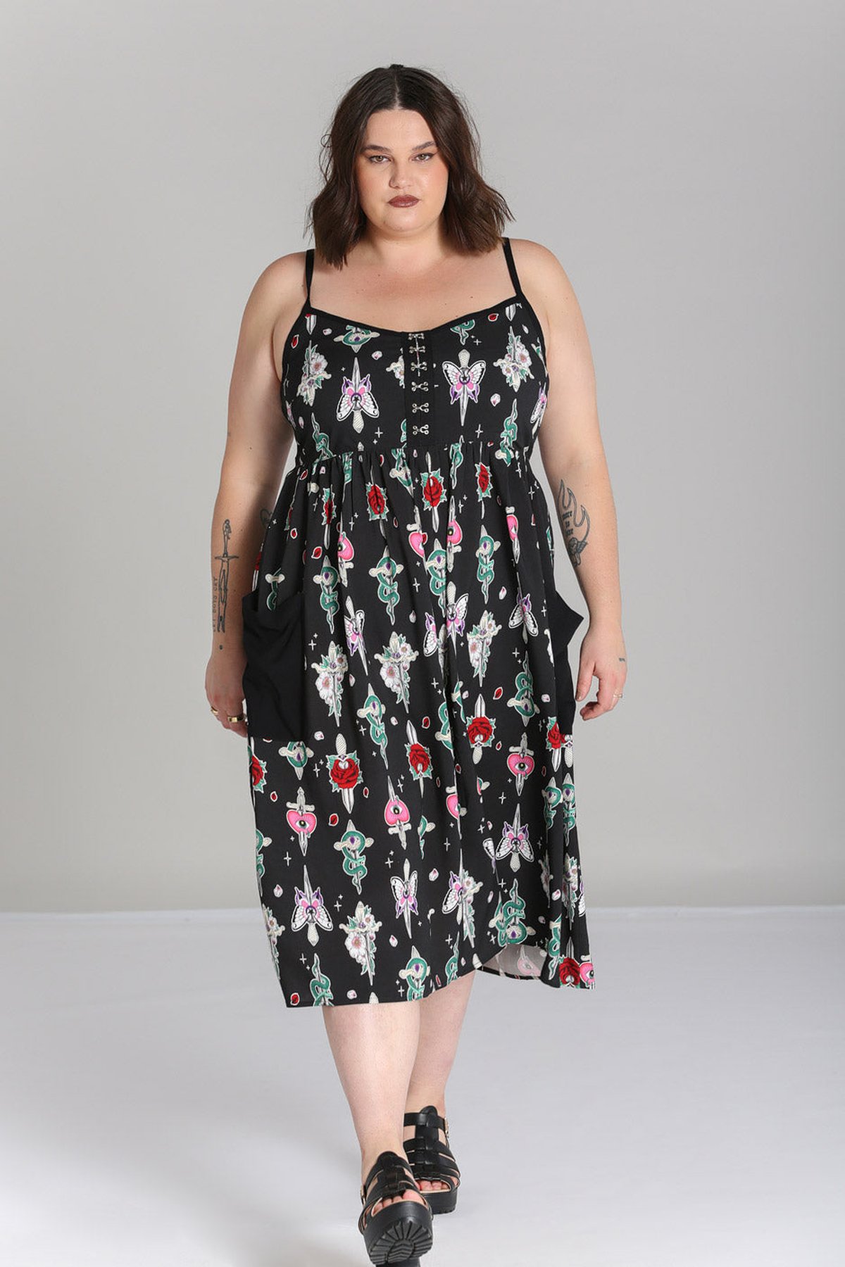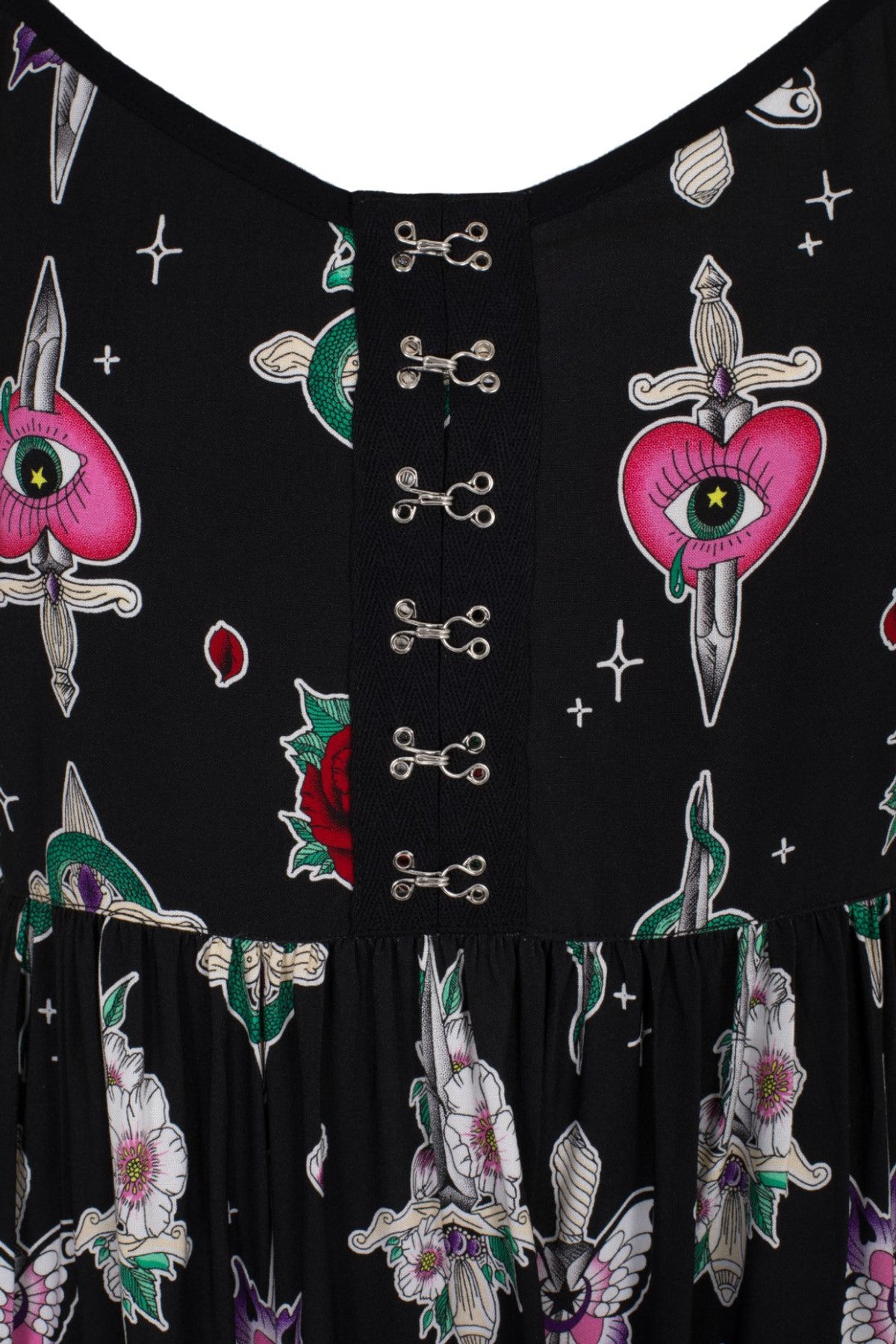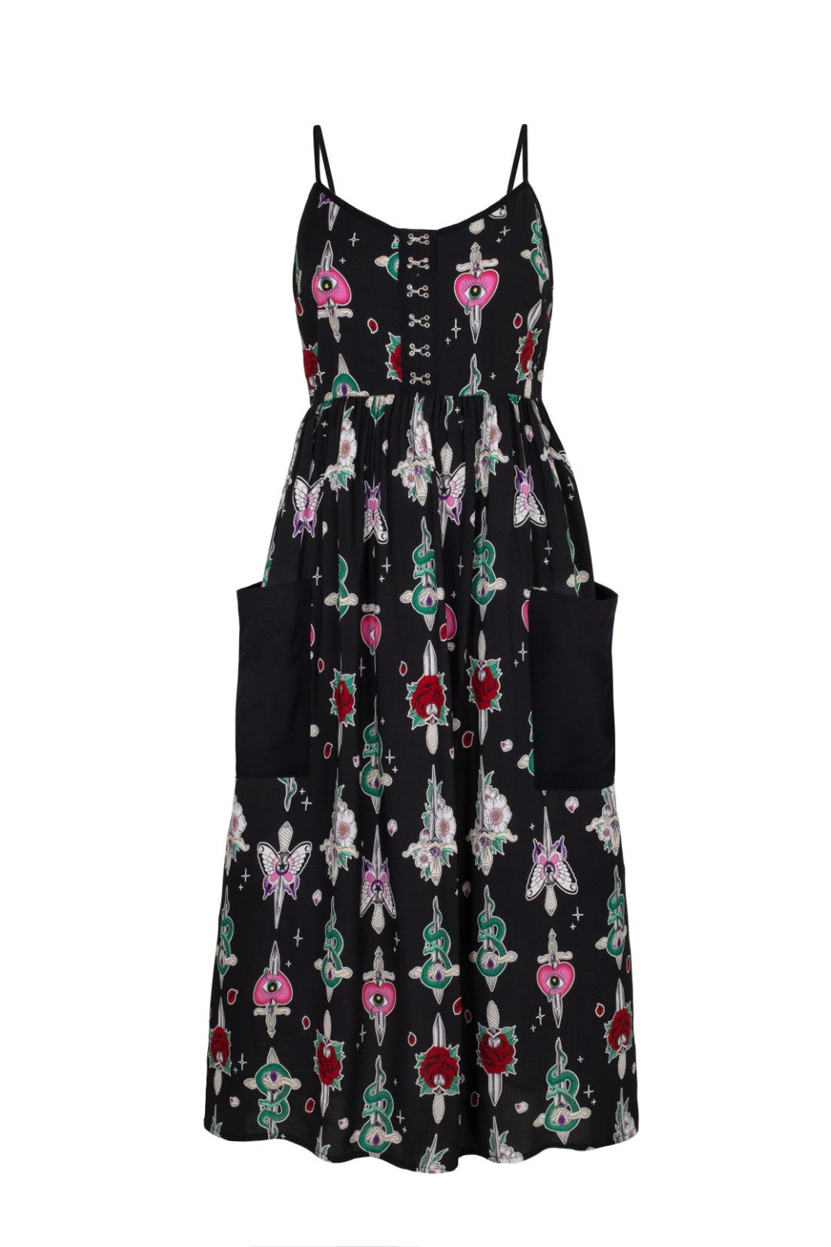 Introducing the Cersei Maxi Dress — where vintage-inspired charm meets modern allure with a daring twist. The jet-black fabric is adorned with a captivating tapestry of tattoo-style dagger motifs, adding just the right touch of rebellious elegance. Adjustable spaghetti straps and shimmering silver hook & eye details give the neckline a flirtatious edge, while the relaxed silhouette and oversized pockets make this piece as comfortable as it is covetable. Whether you're draping yourself in flowy fabric or making a statement, this dress is a purrfect blend of boho whimsy and chic sophistication, designed to turn heads with subtle claws-down gorgeousness.