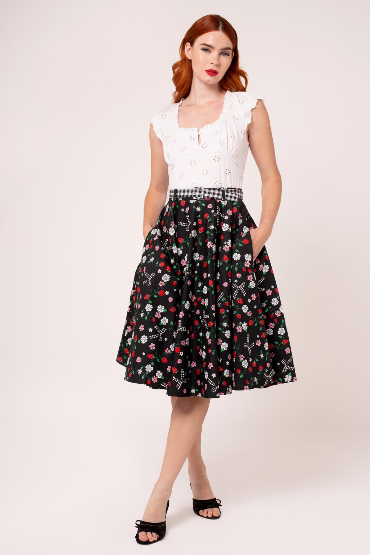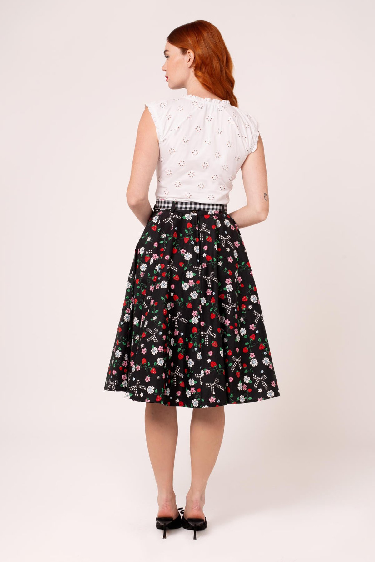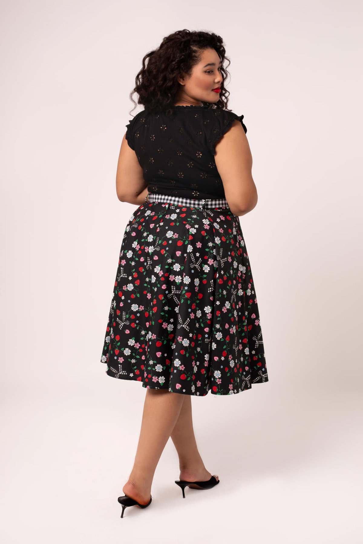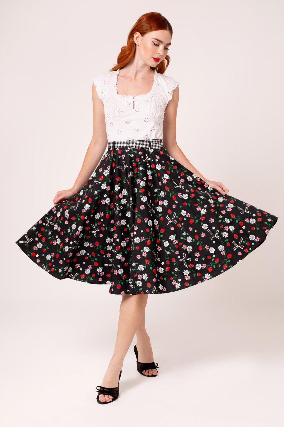 Unleash your inner vintage vixen with the Isobel Skirt—where retro charm meets playful sophistication. The bold black base is irresistibly sprinkled with sweet strawberries, delicate florals, and quaint gingham bows, making it a true purrfect statement piece. Its full circle silhouette flows with swoon-worthy volume and flair, perfect for twirling through days and nights alike. Crafted from a comfy cotton blend with a hint of elastane, this skirt offers a snug yet flexible fit that feels as fabulous as it looks. Whether you're channeling a pin-up vibe or adding a touch of nostalgic glamour to your wardrobe, the Isobel Skirt is a delightful way to turn heads and paws for applause.