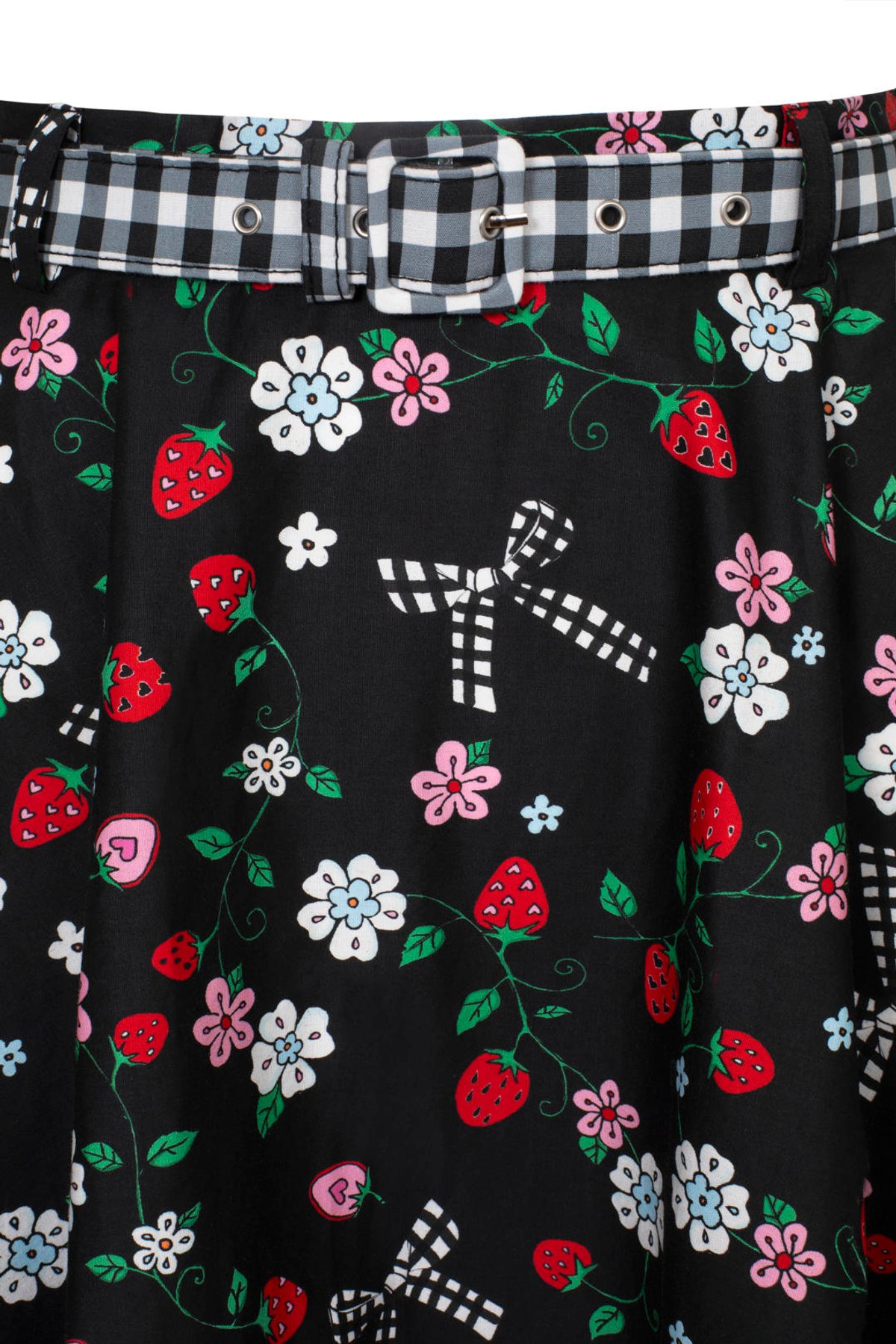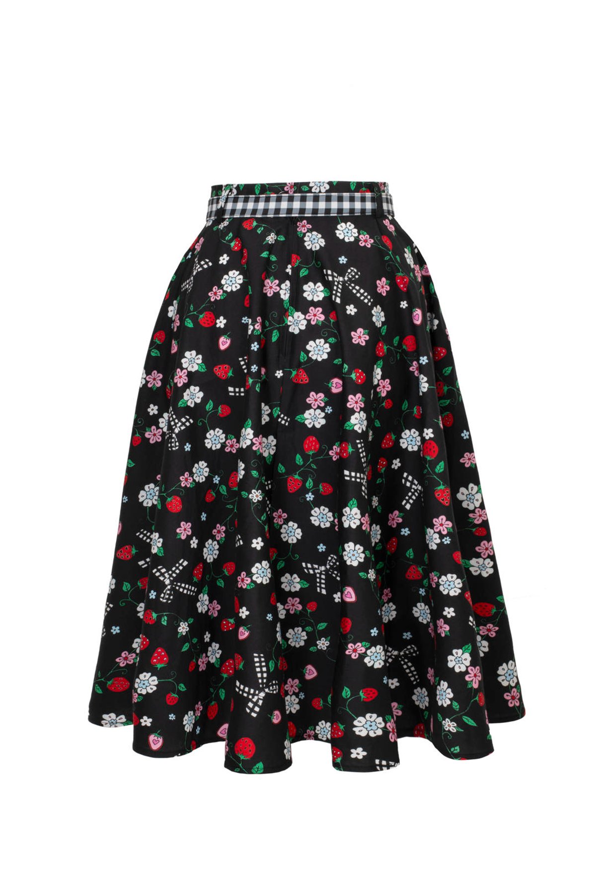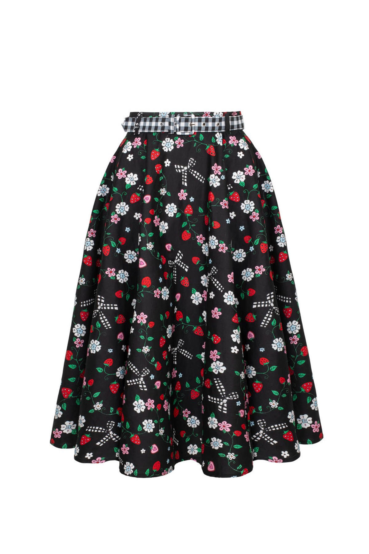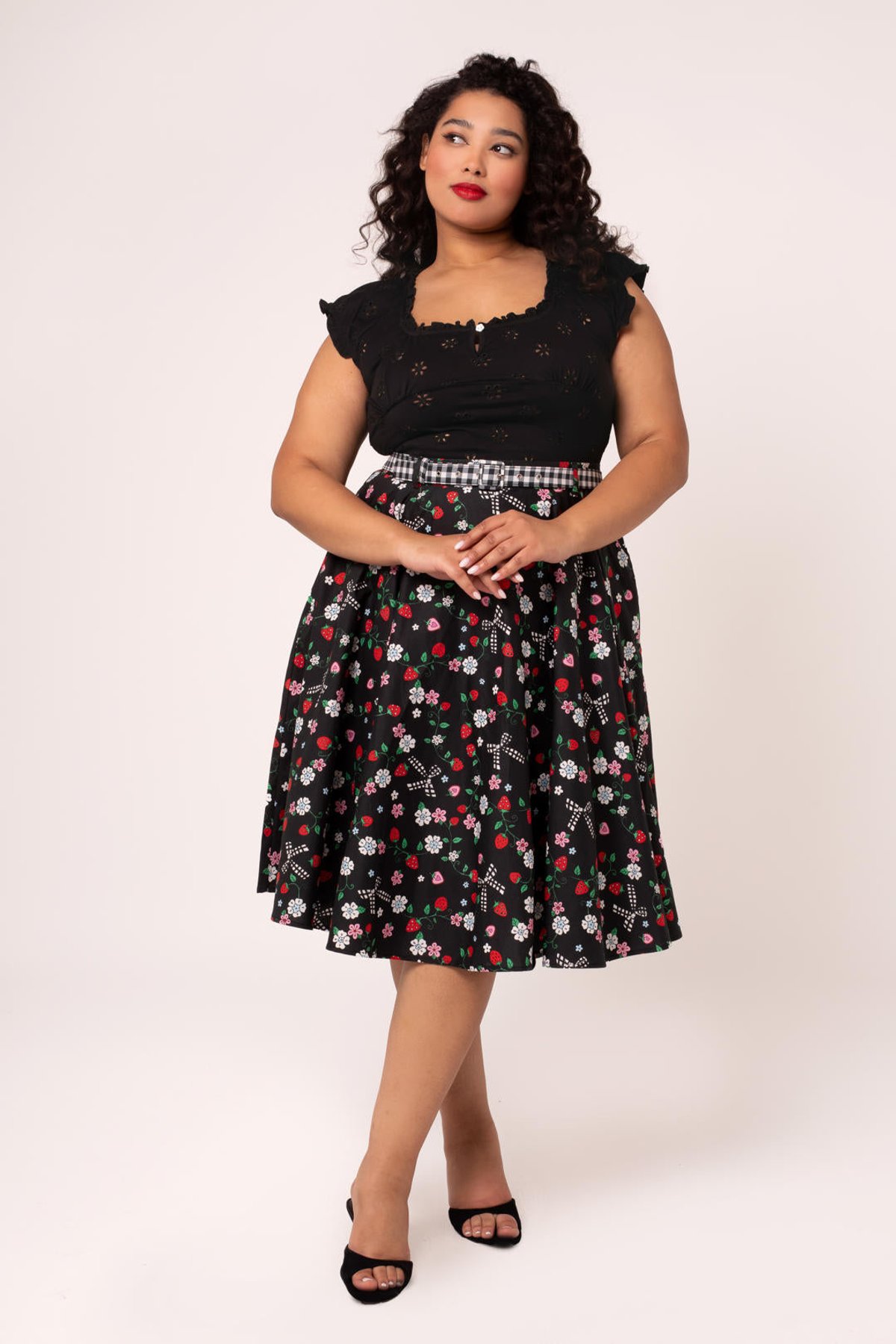 Unleash your inner vintage vixen with the Isobel Skirt—where retro charm meets playful sophistication. The bold black base is irresistibly sprinkled with sweet strawberries, delicate florals, and quaint gingham bows, making it a true purrfect statement piece. Its full circle silhouette flows with swoon-worthy volume and flair, perfect for twirling through days and nights alike. Crafted from a comfy cotton blend with a hint of elastane, this skirt offers a snug yet flexible fit that feels as fabulous as it looks. Whether you're channeling a pin-up vibe or adding a touch of nostalgic glamour to your wardrobe, the Isobel Skirt is a delightful way to turn heads and paws for applause.