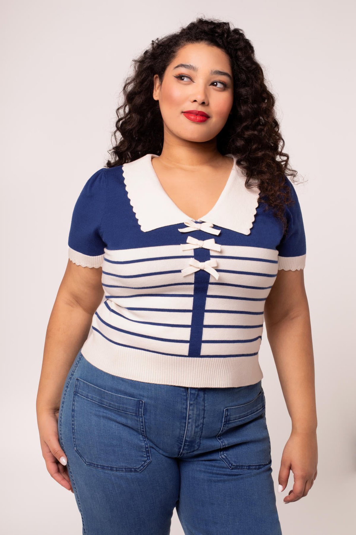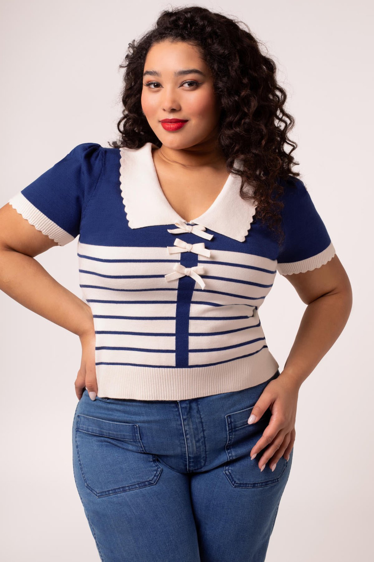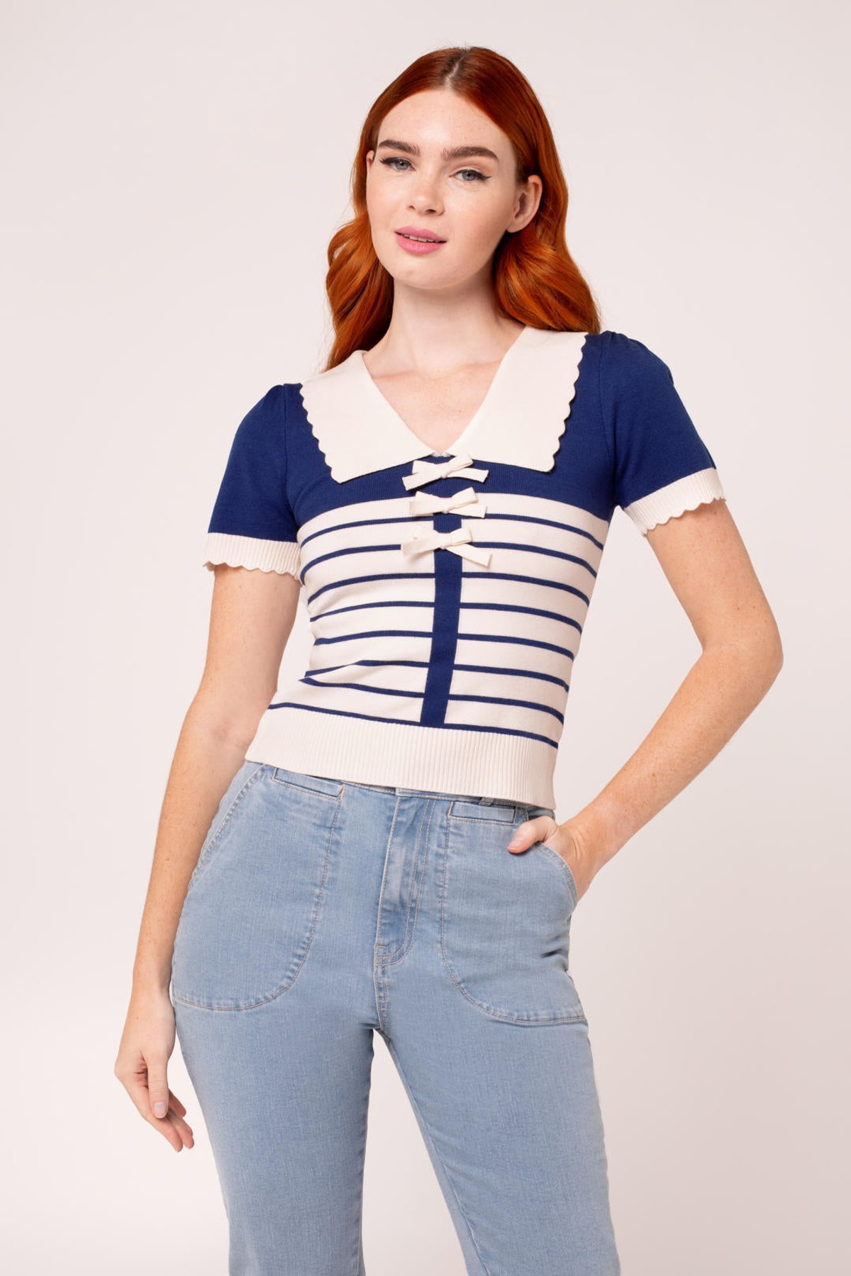 Meet the Jennie Top—a purrfect blend of vintage charm and modern sass. With its deep blue stripes contrasted by crisp ivory, this piece oozes feline-inspired style that’s both playful and polished. The delightful bows down the front add a touch of coquettish fun, while the scalloped collar and cuffs elevate the look with a hint of elegance. Whether worn alone or layered, it’s designed to flatter your figure and keep you feeling fabulous from dawn till dusk. Crafted from a comfy, stretchy blend of viscose, polyester, and nylon, this top ensures all-day ease without sacrificing style. Its versatile vibe makes it a must-have for your wardrobe, ready to be paired with your favorite jeans or a flirty skirt.