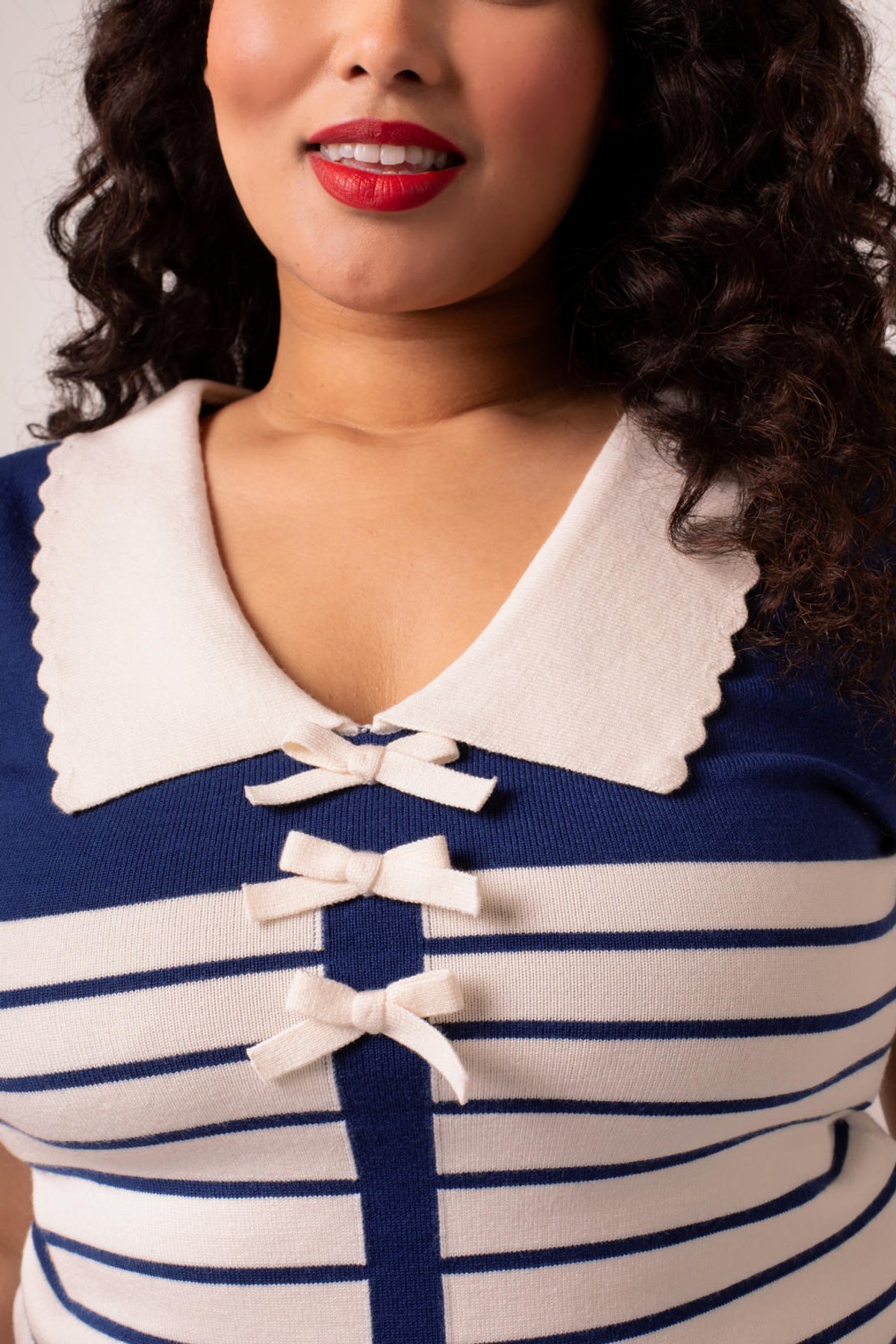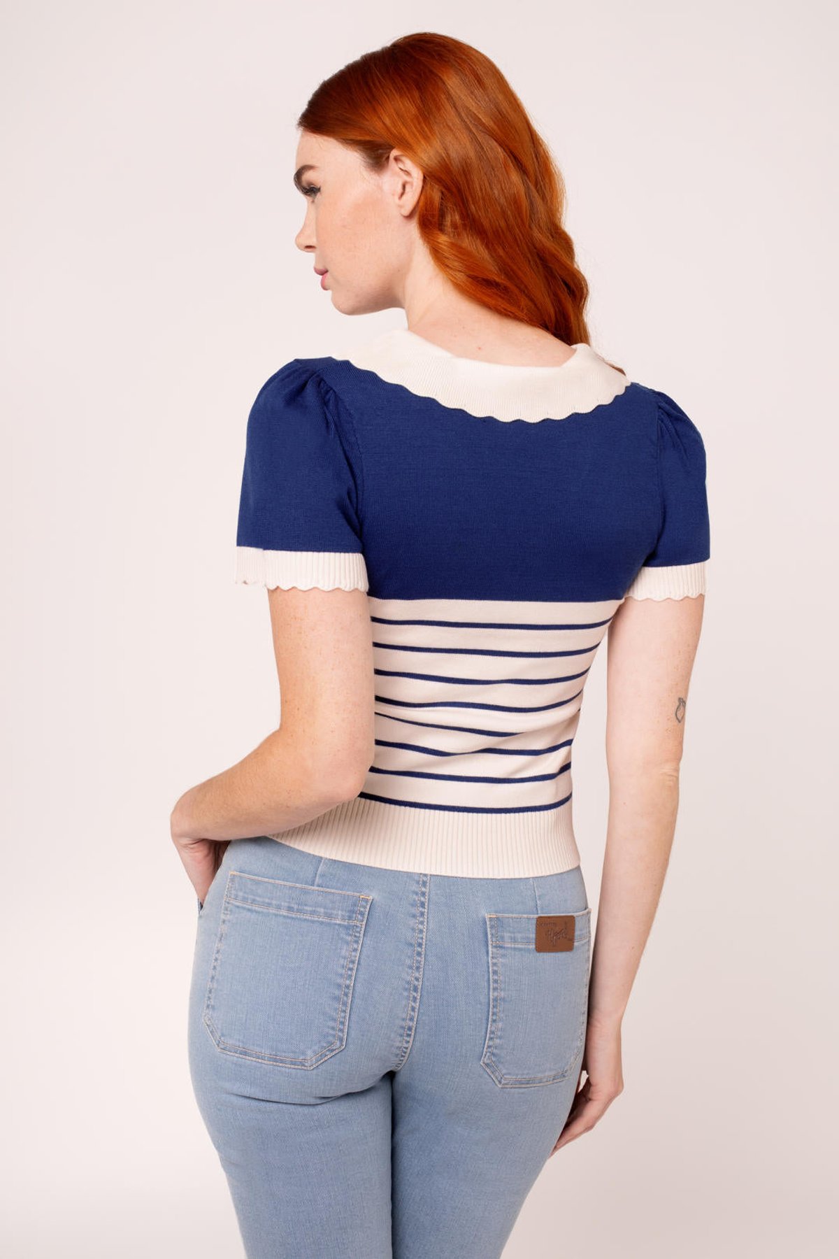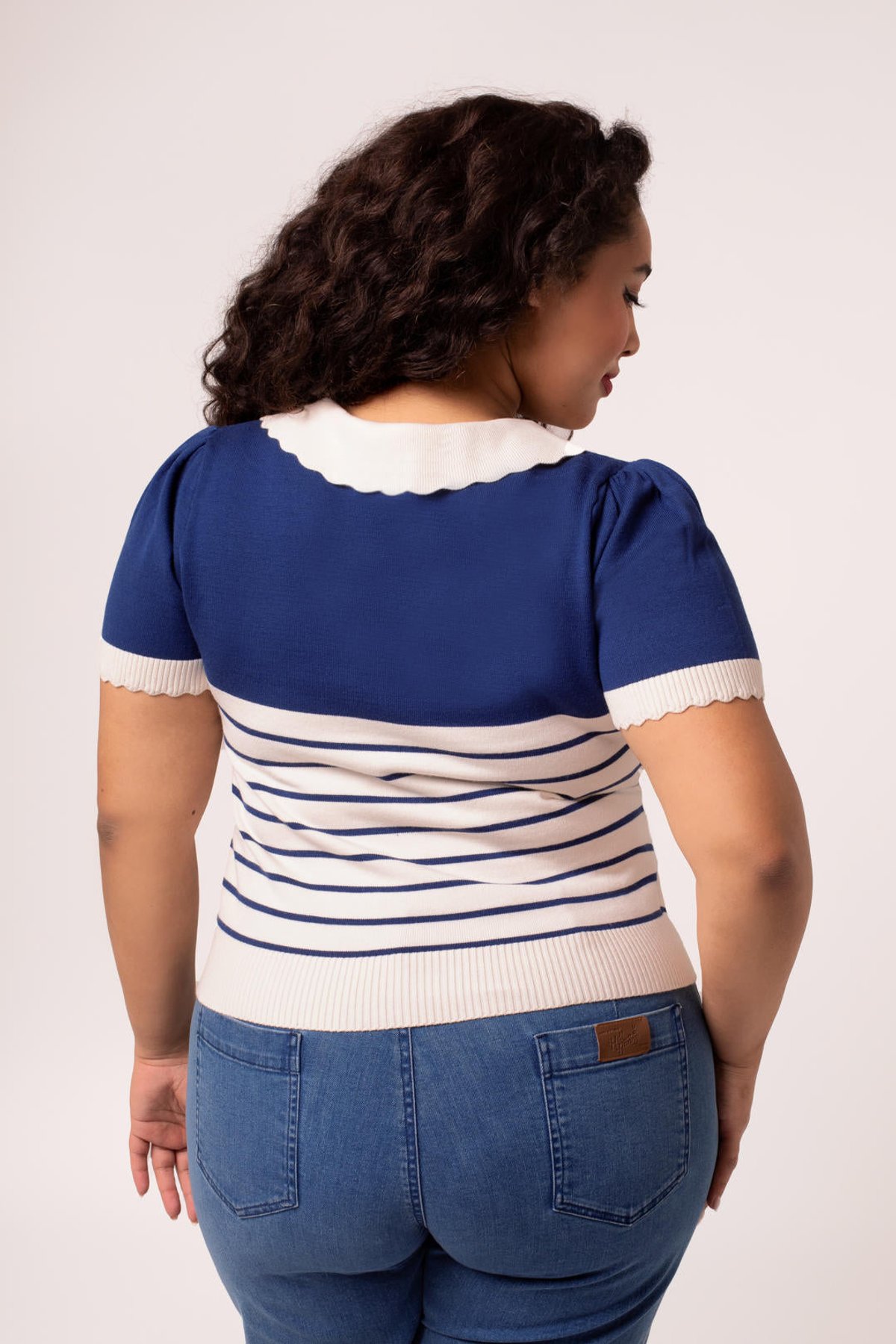 Meet the Jennie Top—a purrfect blend of vintage charm and modern sass. With its deep blue stripes contrasted by crisp ivory, this piece oozes feline-inspired style that’s both playful and polished. The delightful bows down the front add a touch of coquettish fun, while the scalloped collar and cuffs elevate the look with a hint of elegance. Whether worn alone or layered, it’s designed to flatter your figure and keep you feeling fabulous from dawn till dusk. Crafted from a comfy, stretchy blend of viscose, polyester, and nylon, this top ensures all-day ease without sacrificing style. Its versatile vibe makes it a must-have for your wardrobe, ready to be paired with your favorite jeans or a flirty skirt.