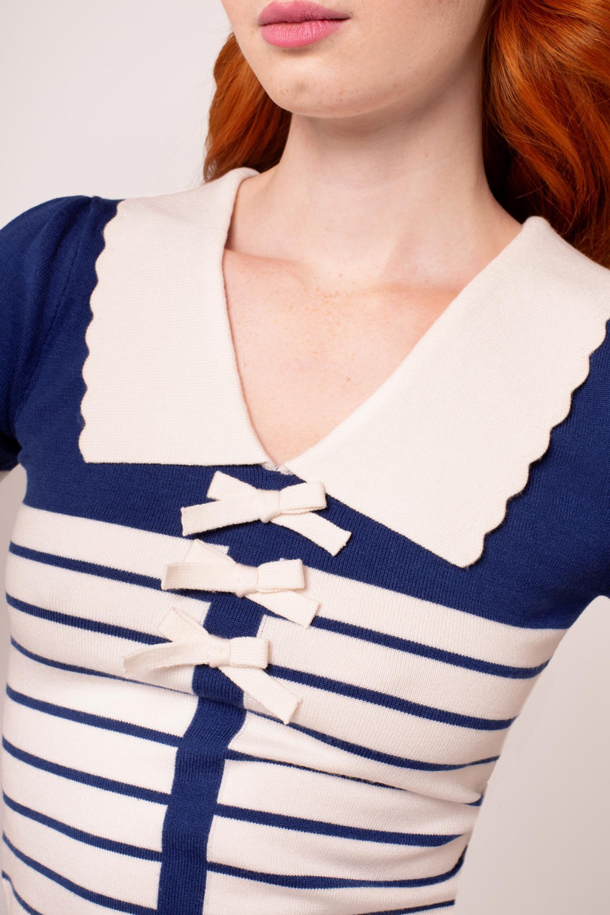 Our Jennie Top is a wardrobe essential, with its stylish short sleeves and a delightful parade of matching bows down the front, adding a whimsically playful touch to your look. The scalloped ivory collar and cuffs exude subtle elegance, whilst the ribbed hem ensures a complementary fit. 🎽