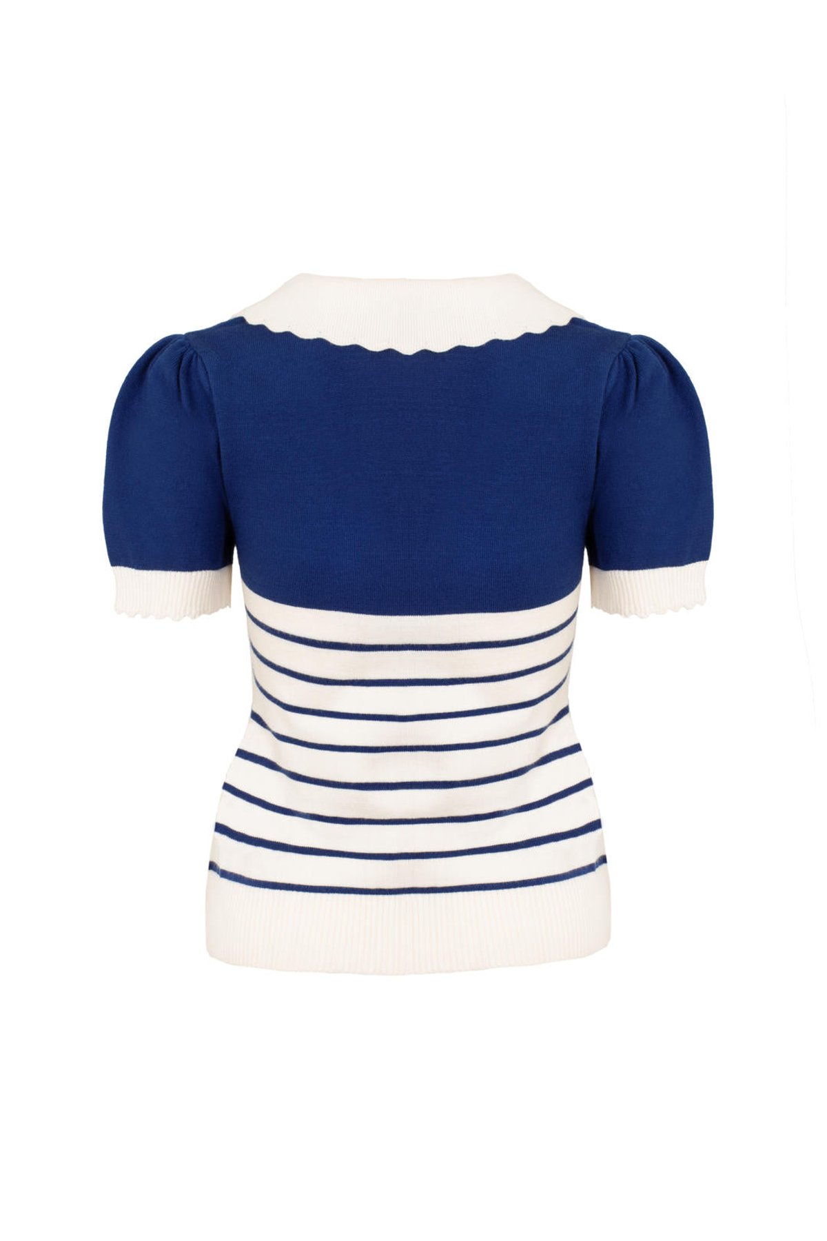 😍 Say hello to the vintage-inspired Jennie Top, the perfect blend of timeless appeal and modern-day sass by Kitty Darling! 🎀 Drenched in deep blue hues, this charming number is enhanced with contrasting ivory stripes that will make you stand out in any occasion.
