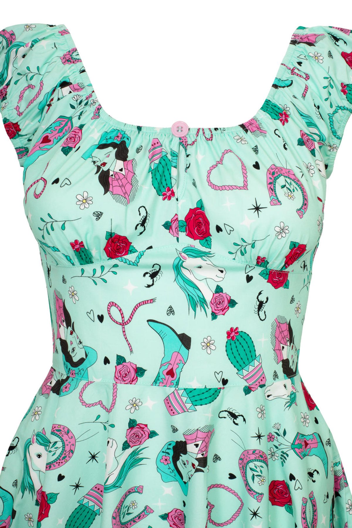 Unleash your inner vintage vixen with the Kellie Dress—a charming concoction of 1950s flair and playful whimsy. Its light blue and white canvas is sprinkled with delightful floral and diner-inspired illustrations, making every wear feel like a nostalgic daydream. The scoop neckline and elastic-edged sleeves provide a versatile fit that can be worn on or off the shoulder, while the cheeky keyhole and pink button detail add just the right touch of flirtation. Crafted from a soft cotton blend with a gentle stretch, this dress is as comfy as it is captivating. The flared circle skirt invites twirls and sashays, and discreet pockets keep your essentials close—because even vintage glam needs practicality. Whether you’re heading to a Sunday brunch, a retro-themed soirée, or just jazzing up your day-to-day, the Kellie Dress is your go-to for a purrfectly polished look.