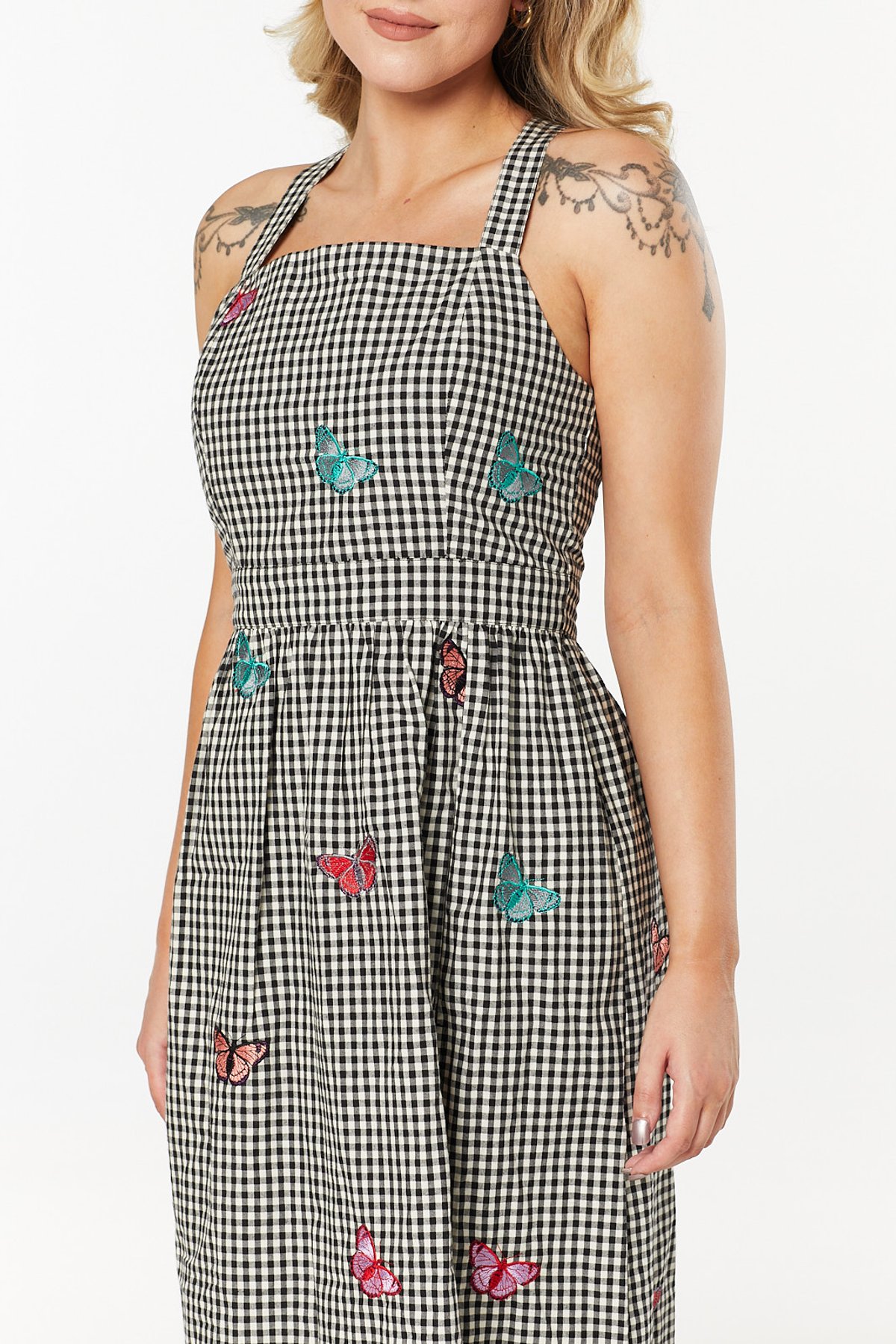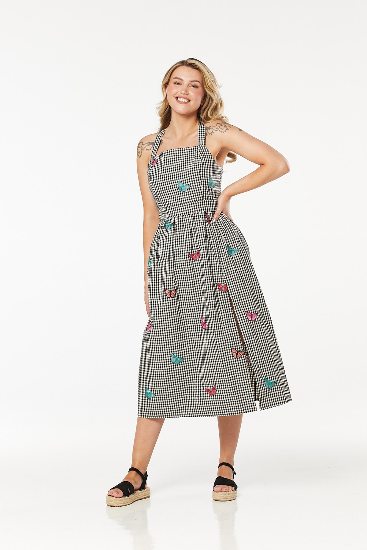 Step into the spotlight with the Luanni Dress — a purrfect blend of vintage allure and playful elegance. This charming piece features a classic black-and-white gingham pattern, sprinkled with adorable pink butterflies that whisper of whimsy and fun. The sleeveless cut, square neckline, and adjustable straps make it a summer staple that’s both flattering and comfy, perfect for turning heads and hearts alike. Crafted from sustainable cotton, it’s as kind to the planet as it is to your style sensibilities. The shirred bodice creates a beautifully contoured silhouette, while the cheeky side slit and practical side pockets add just the right touch of flirt and function. Whether you’re lounging at a garden fête or strolling along the seaside, this dress is ready to make a paw-sitive impression.