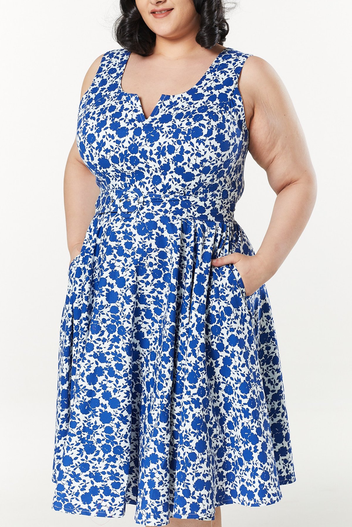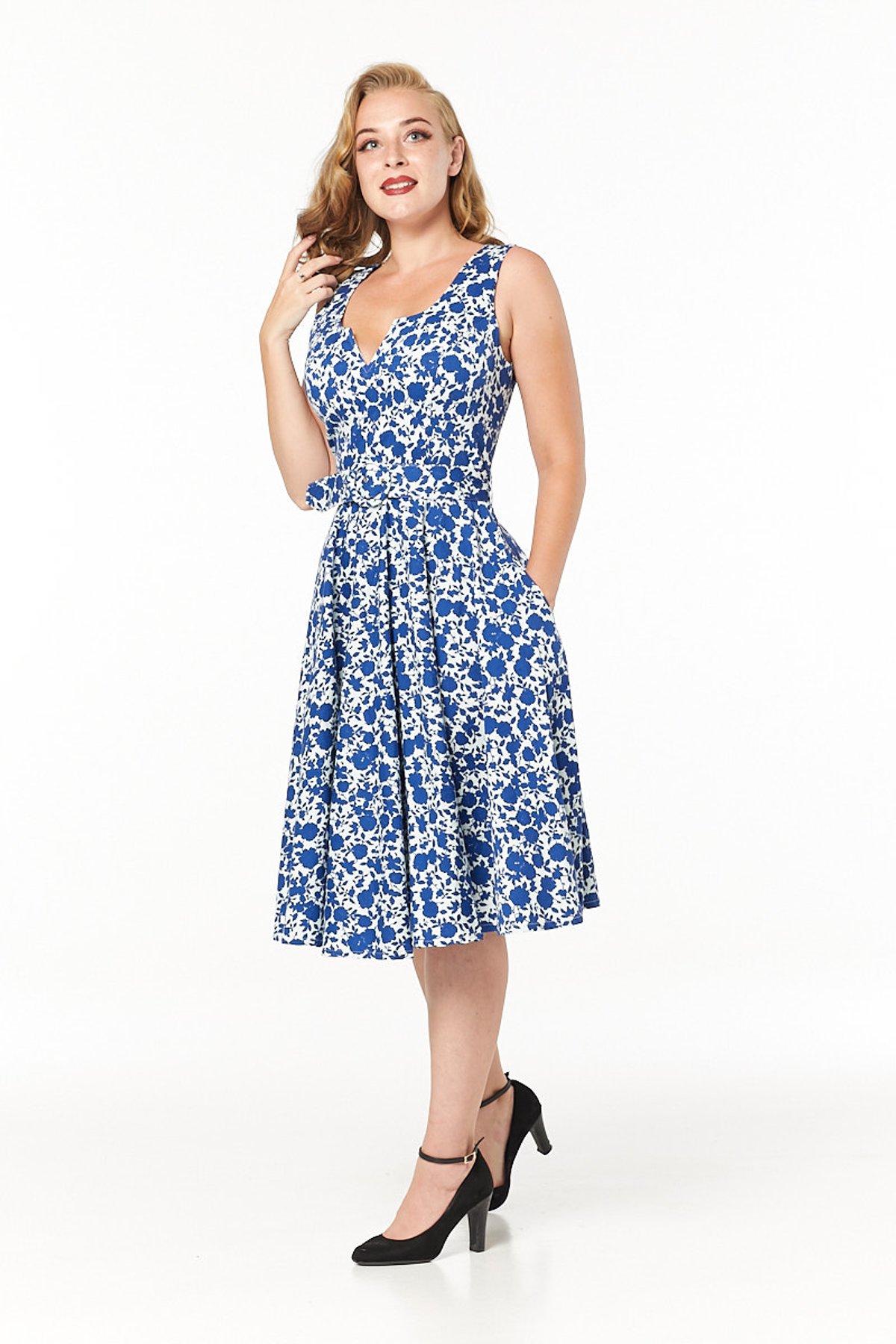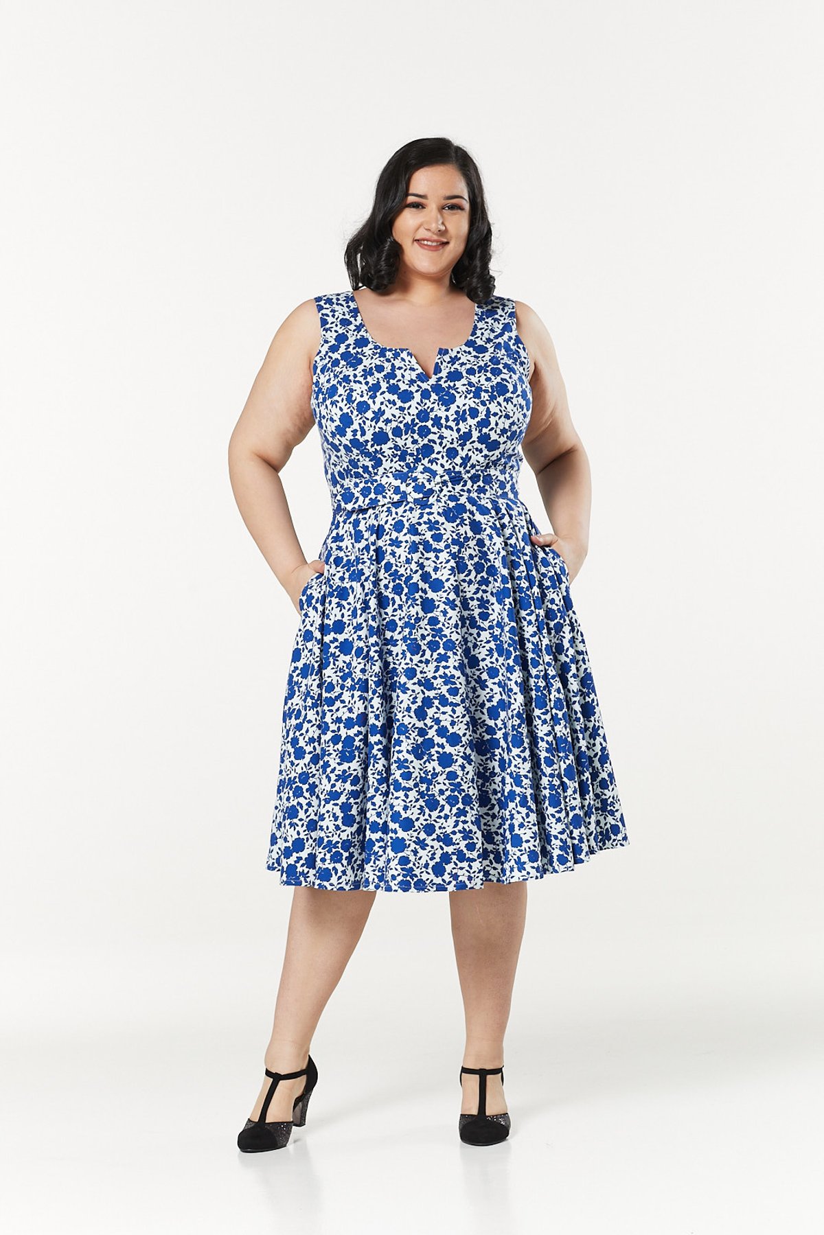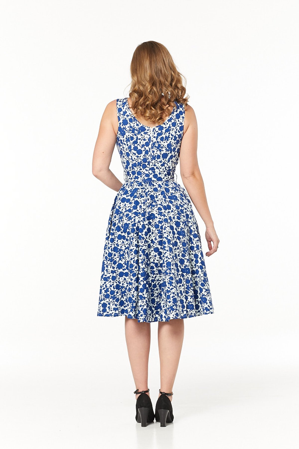 Get ready to turn heads and steal hearts in the Mina Dress — a true showstopper that effortlessly combines vintage charm with contemporary flair. Its delightful blue and white floral print is both fresh and timeless, while the soft stretch cotton ensures you stay comfy enough to twirl the night away. The playful boat-neck with a subtle V-cut-out adds just the right amount of sass, and the cinched waist with a matching belt promises a figure-flattering silhouette that’s as enchanting as a moonlit purr. Whether you're sashaying into a garden party or captivating at a casual brunch, this dress is your purrfect companion for making style statements that linger.