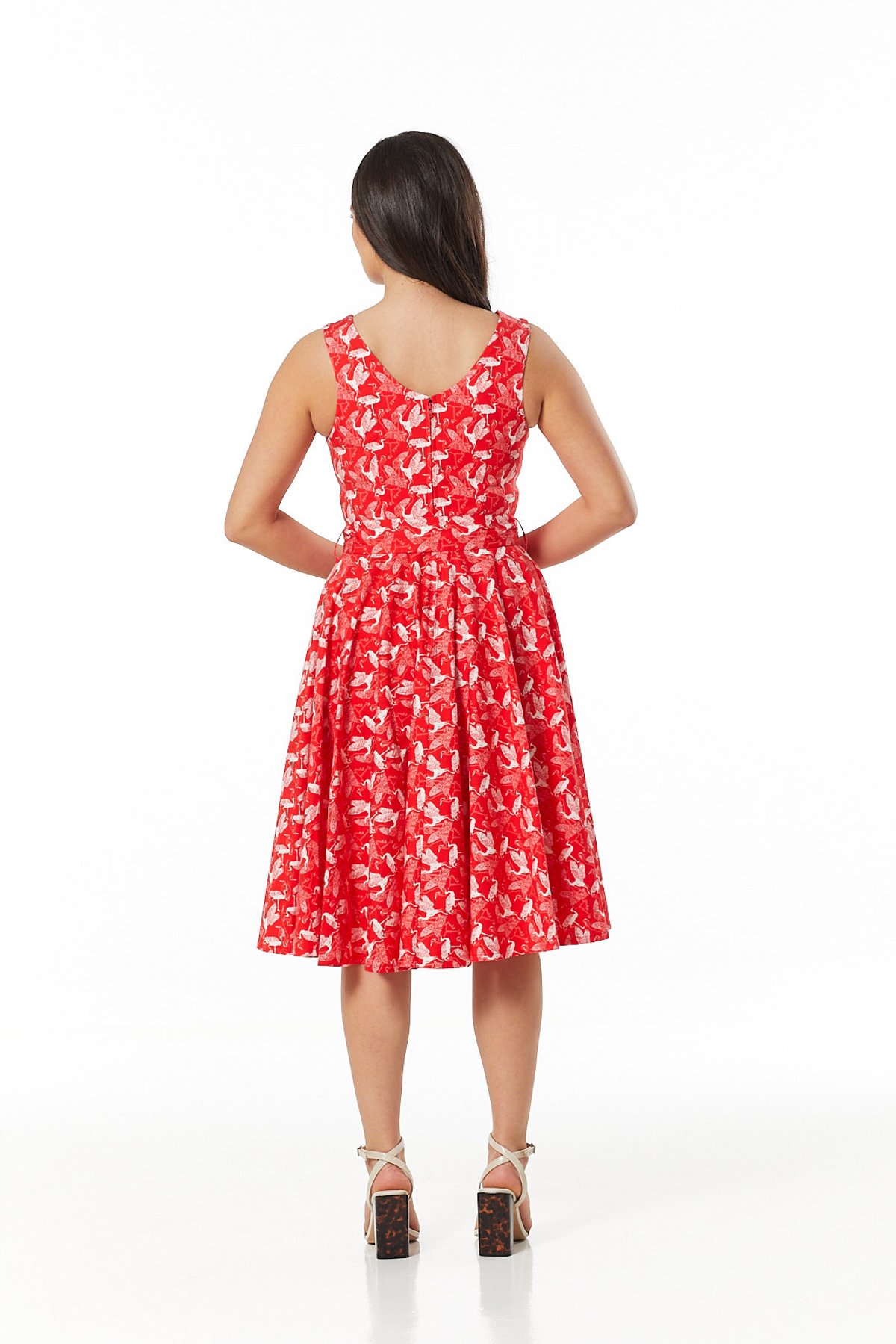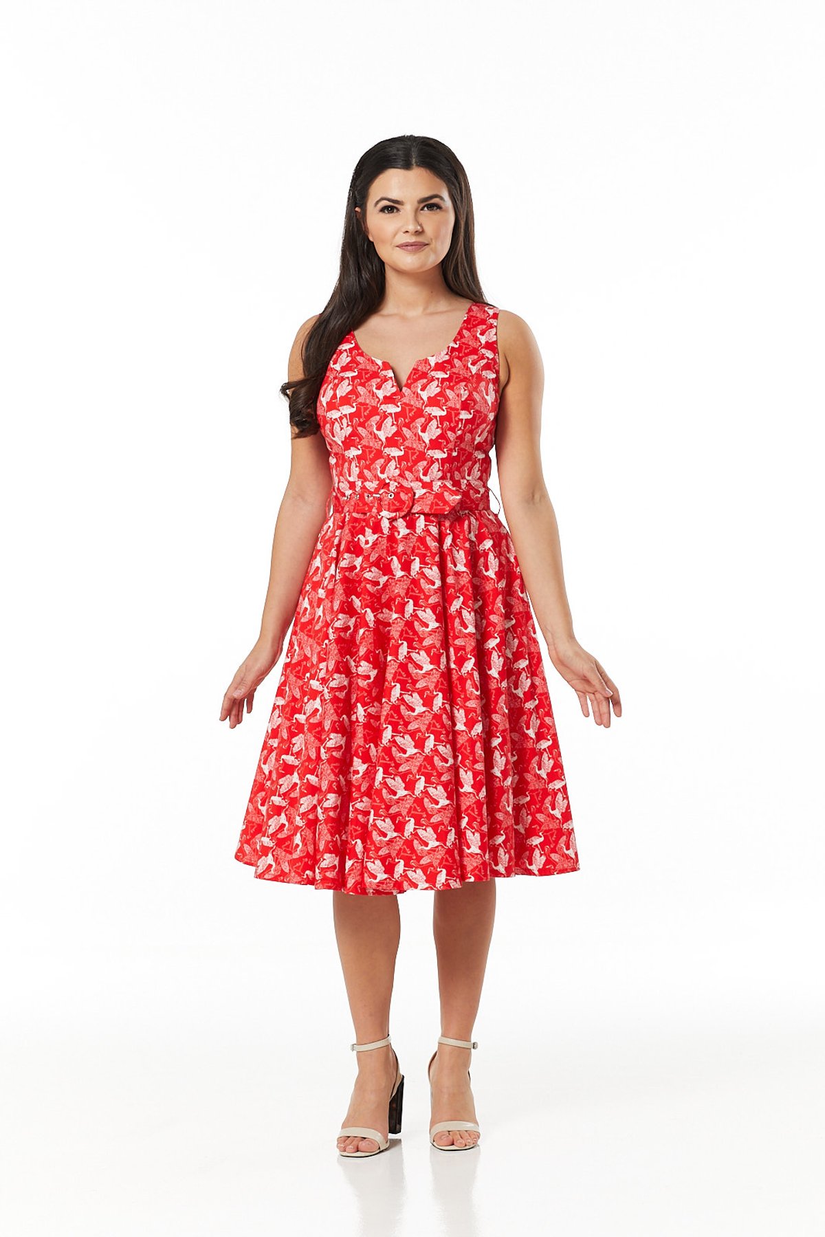 Unleash your inner vintage vixen with the Rina Dress—where playful floral patterns meet timeless 1950s charm. This purrfect combination of a vibrant red and crisp white blooms is designed to turn heads and keep you feeling fabulous from dawn to dusk. The soft stretch cotton molds to your curves, while the rounded boat neck with a flirty V-cut-out adds a dash of daring. The fitted waist, accentuated by a matching belt, creates an irresistibly flattering silhouette, and the voluminous skirt dances with every step, perfect for twirling into the night.
