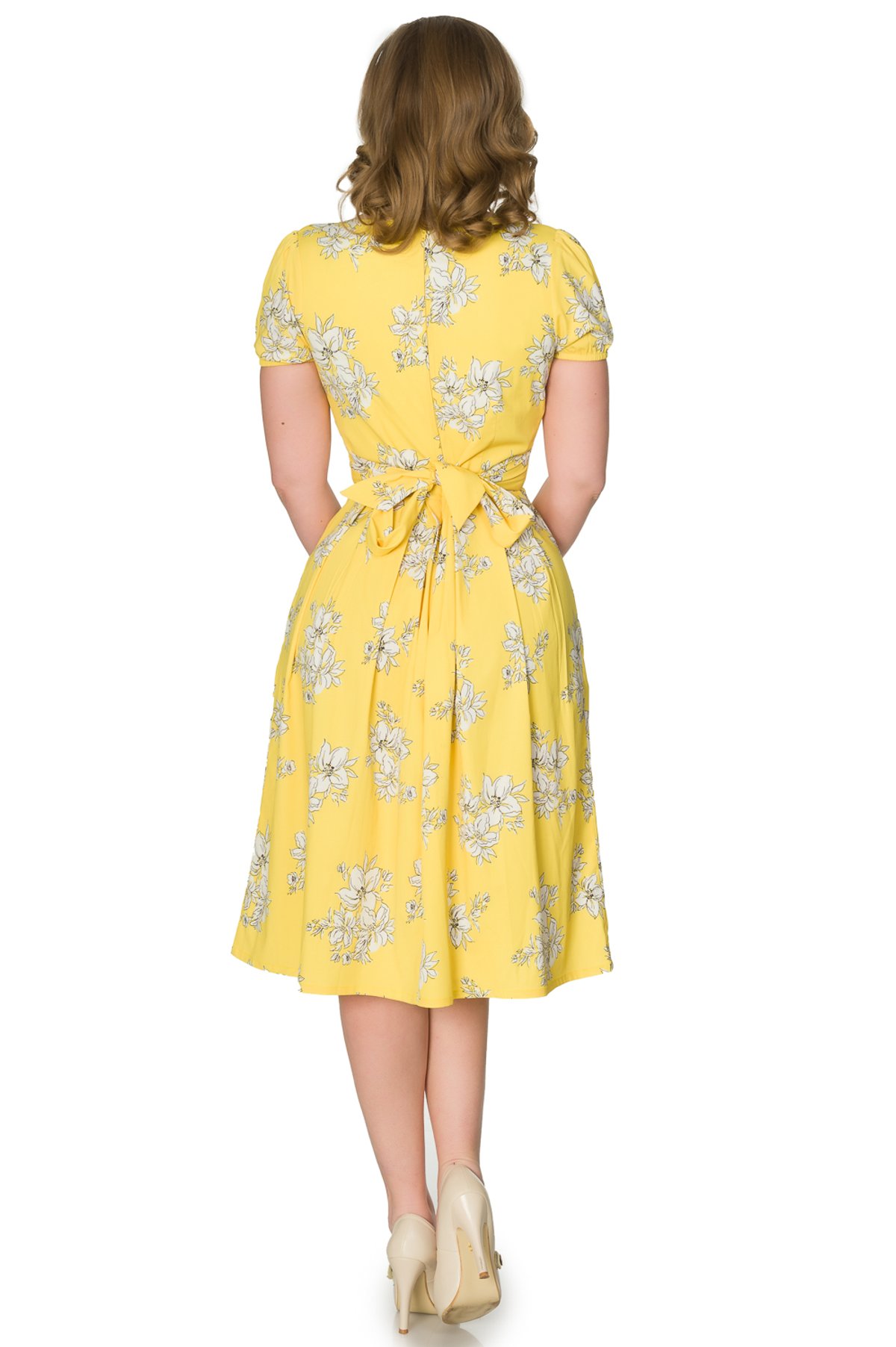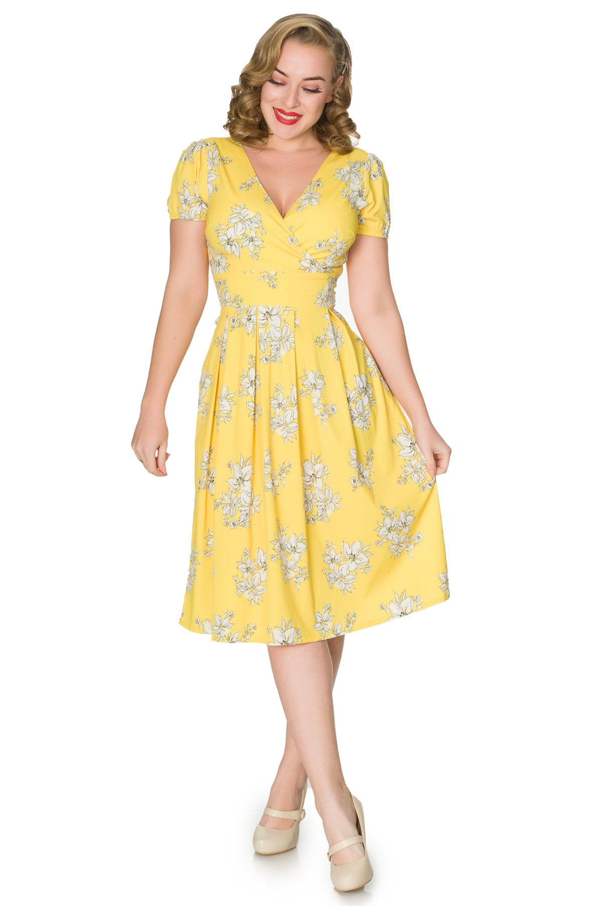 Step into sunshine and make every day a bloom-filled fête with the Rosa Dress—a true purrfection in vintage-inspired style. Its cheerful yellow hue and delicate white floral print are guaranteed to turn heads, while the flattering wrap top and fixed tie straps at the waist create a silhouette that's as charming as it is chic. The pleated midi skirt sways effortlessly, giving you that playful yet polished look perfect for a sunny brunch or a garden soiree. Crafted from lightweight fabric, this dress lets you enjoy the warm weather in feline finesse, whether you're out on a casual stroll or attending a more refined gathering. With its fun, vintage vibe, the Rosa Dress is a claw-some addition that promises to keep all eyes on you—feline irresistible!