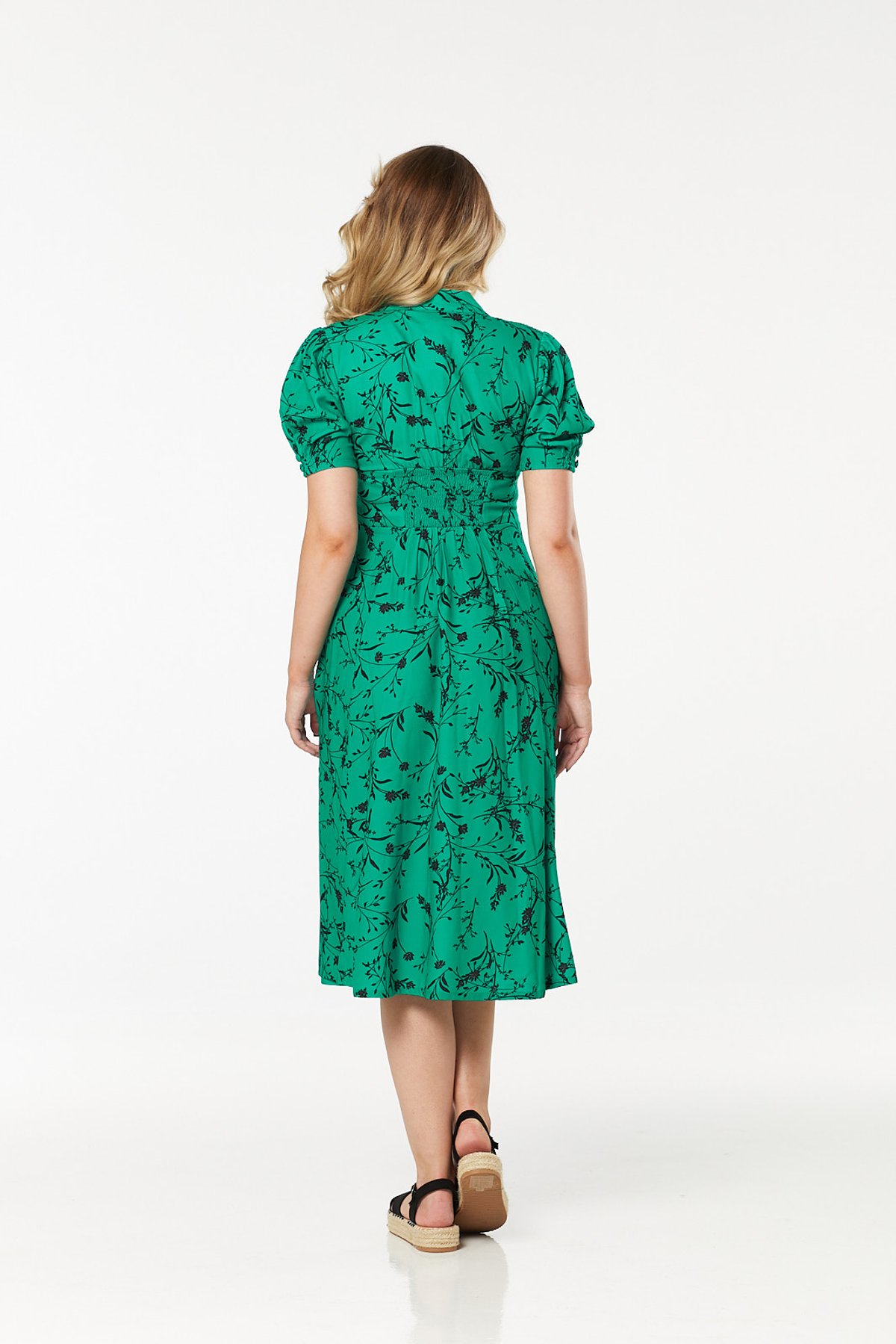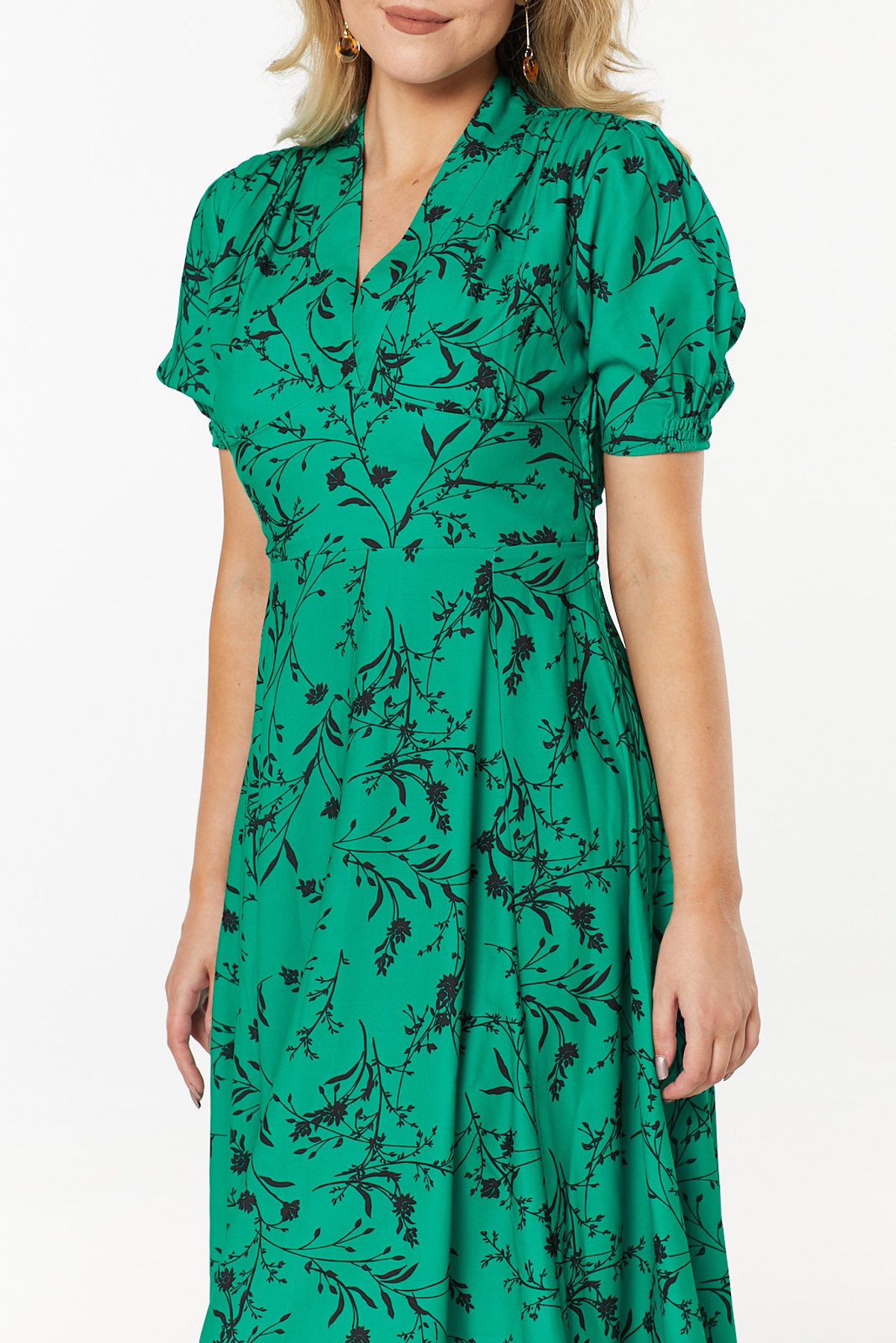 Dive into a vintage fashion time machine with our vintage-inspired Rossel dress💫. Reminisce the fabulous ’50s as this darling creation turns heads wherever you go. Adorned with whimsical black florals set against a lush green backdrop, this retro midi dress crafts the perfect vintage look👗.