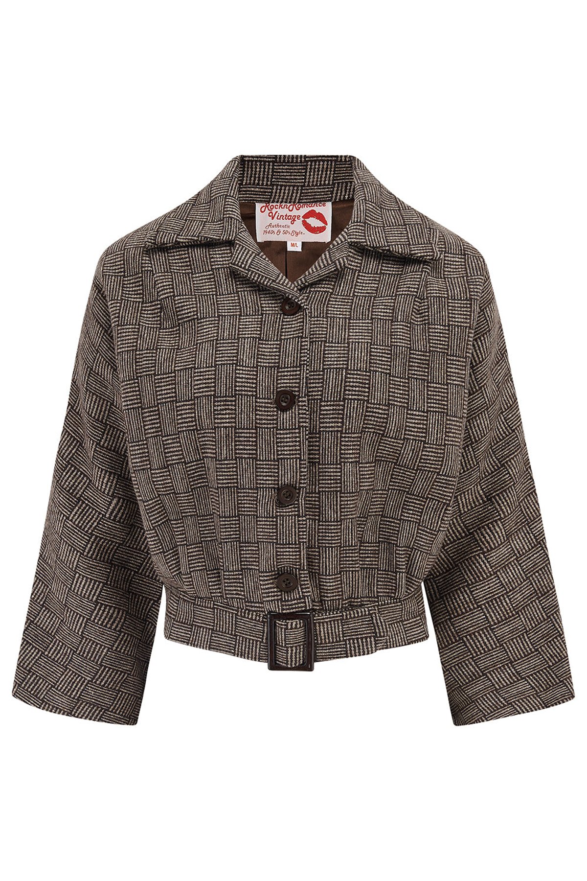 Step into a world of vintage glamour with our Be-Bop Semi-Cropped Jacket, where classic early 50s style meets timeless wool craftsmanship. The charming weave check pattern in warm browns and crisp whites creates a look that’s both refined and playful—think of it as your purrfect nod to retro sophistication. The relaxed fit drapes effortlessly, while the belted waist offers a silhouette that’s undeniably claws-down gorgeous. Sassy 3/4 batwing sleeves add just the right amount of vintage flair, making this piece as versatile as it is eye-catching. Whether you’re channeling rock ‘n’ roll rebel or vintage sophisticate, this jacket’s got you covered — or should we say, covered in style.
