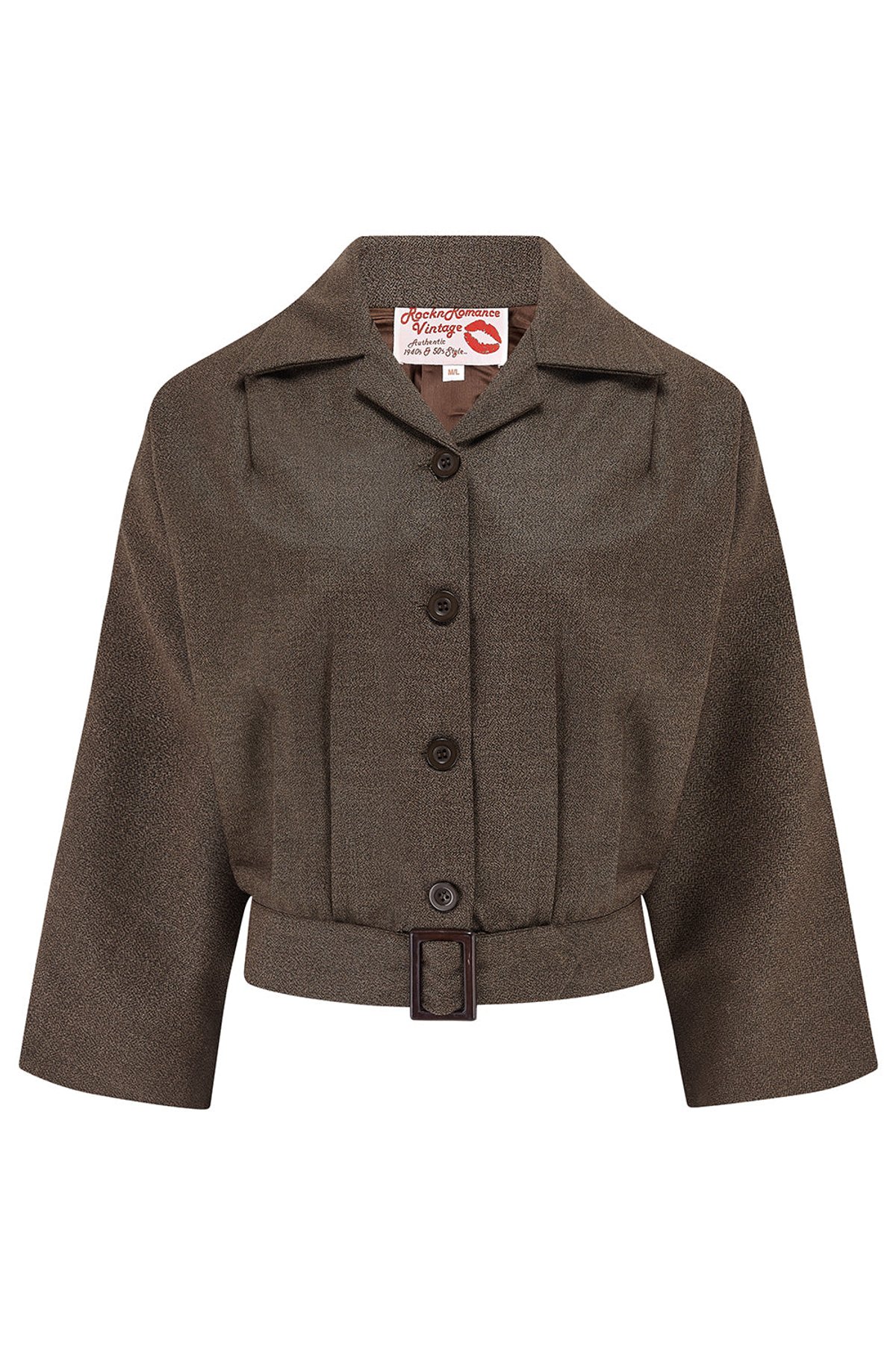 Unleash your inner vintage vixen with the Be-Bop Semi-Cropped Jacket, a purrfect blend of retro charm and modern flair. Its charming brown slub weave adds just the right touch of textured sophistication, while the relaxed bust and chic belted waist work together to create an irresistibly claw-some hourglass silhouette. The 3/4 batwing sleeves give a playful nod to classic 1940s style, elevating your look with a dash of sass and an air of effortless cool. Whether you’re strutting through city streets or lounging at a jazz club, this jacket’s versatile appeal ensures you’ll always look quite fetching.