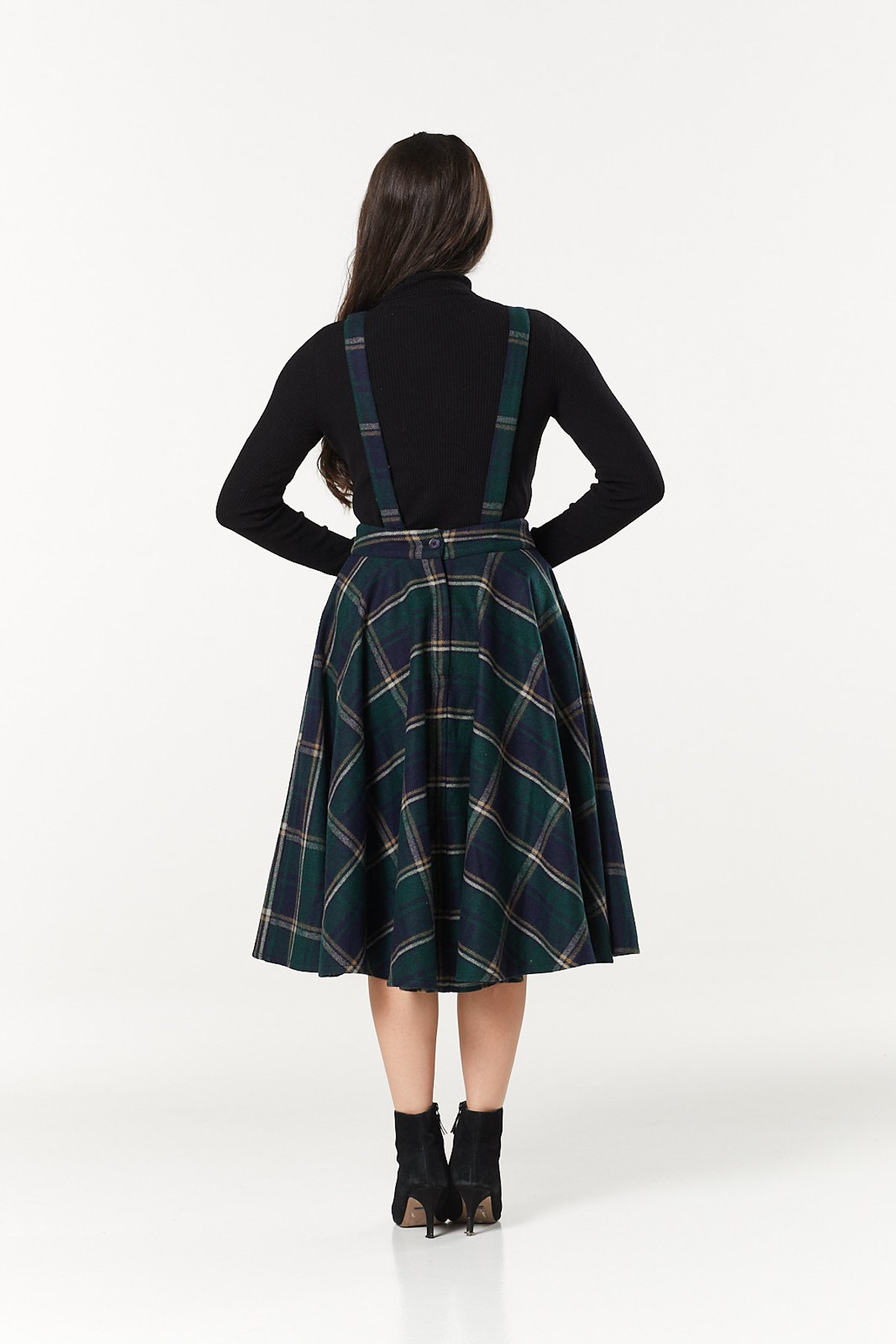 Unleash your inner vintage vixen with the Sophie Skirt, where classic check patterns meet playful charm. The navy and green hues come together in a timeless silhouette, accented by adorable braces that add a dash of mischievous flair. Crafted from a cozy yet chic blend of fabrics, this skirt drapes gracefully below the knee, making it a purrfect choice for those who love a touch of retro elegance with modern comfort. Its flattering, full-circle shape invites you to twirl and sashays that turn heads, all while feeling fabulously feline in style.