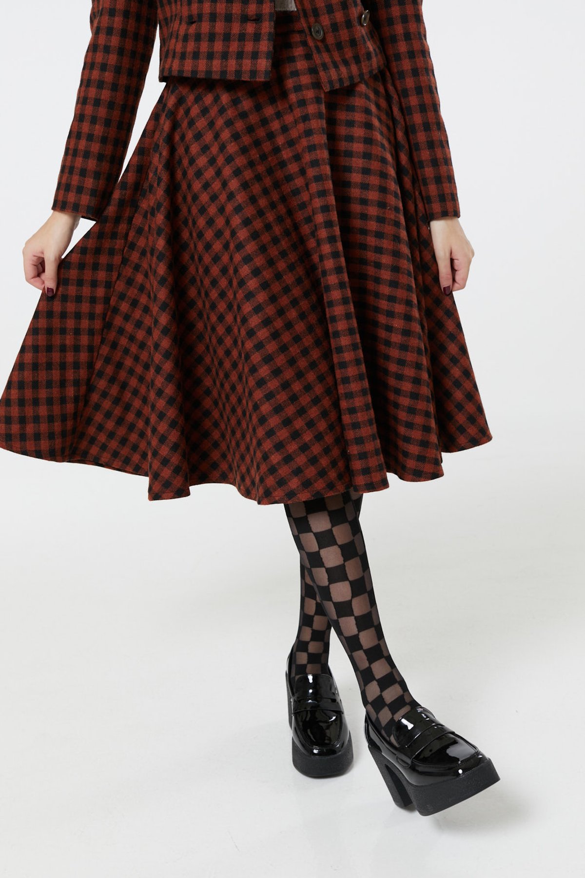 For a chic daytime look, pair Sophie with a cozy knit sweater and ankle boots—think cozy meets classy. Feeling flirtatious? Add a silky blouse and pointed heels for a retro-inspired twist that’s all about elegance. Since this piece already has a bold check pattern, keep your accessories sleek and subtle, letting the skirt do all the talking. Whether you’re a femme fatale or a vintage vixen, remember: the right accessories will only make your style purrfect.