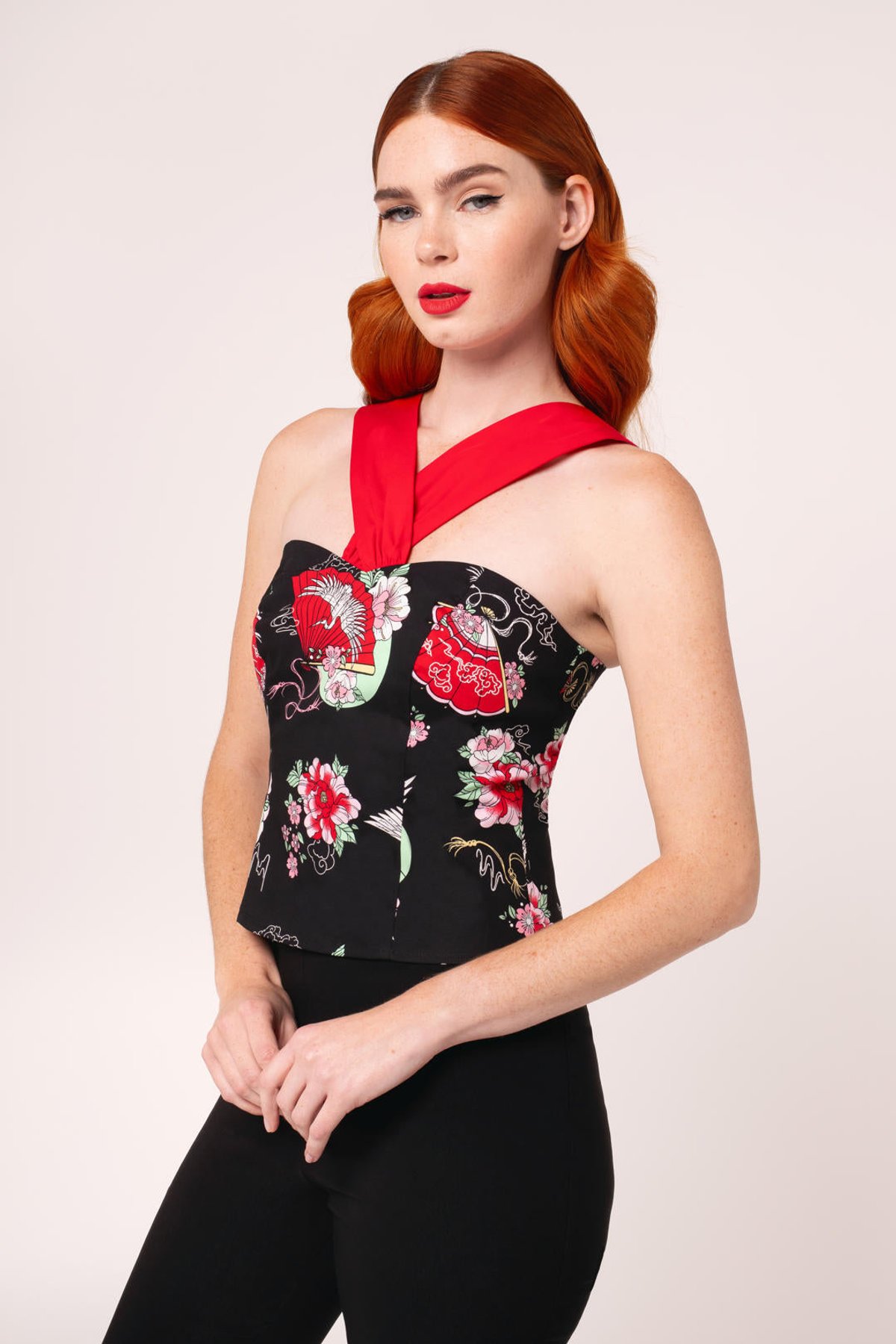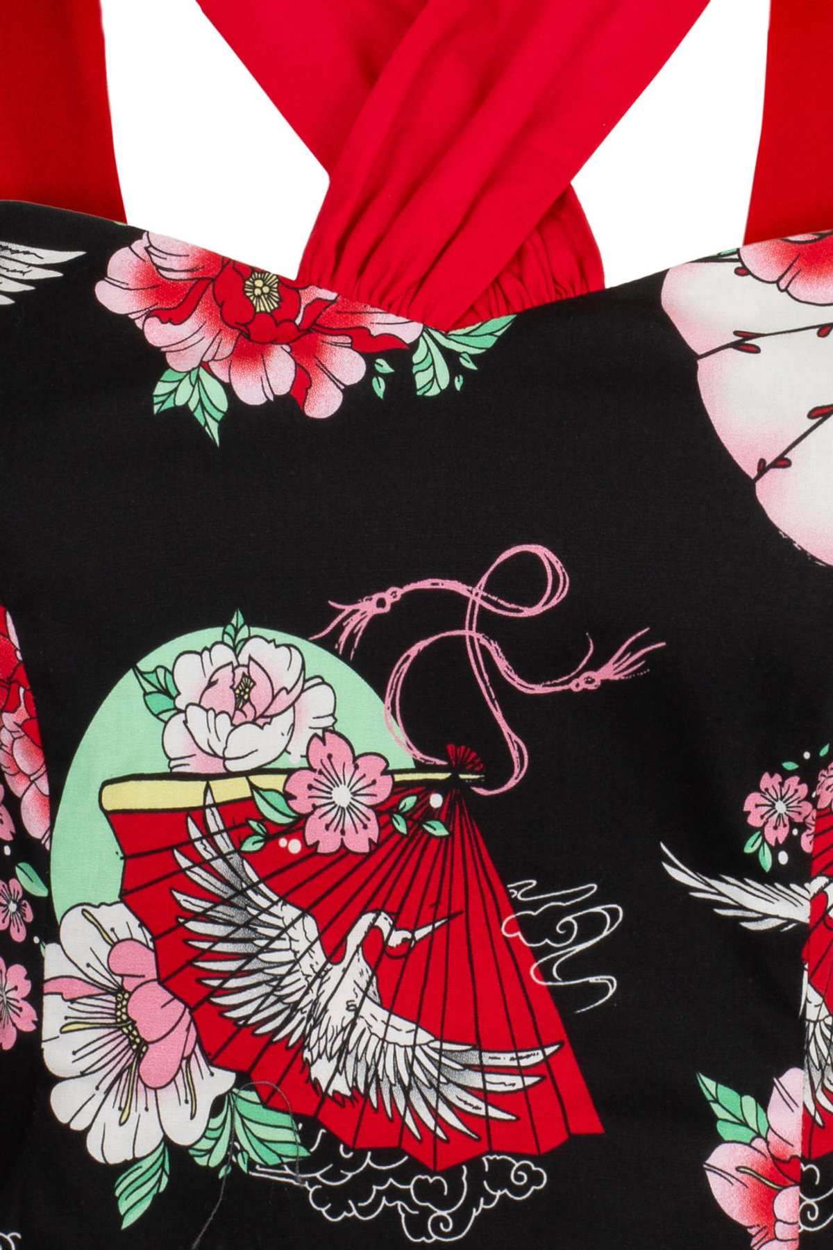 🌺💃 Dive headfirst into a glamorous, bygone era with our irresistible Vintage-Inspired Yuna Top. This sassy and sophisticated beauty, crafted from a sumptuous black cotton blend, is sprinkled with intricate pink and red floral patterns, whimsical flying cranes, and charming fans. A touch of the ’50s, right here in the 21st century.