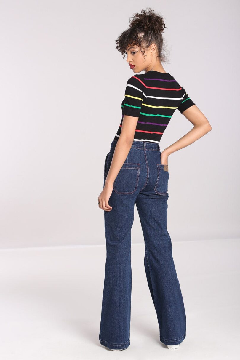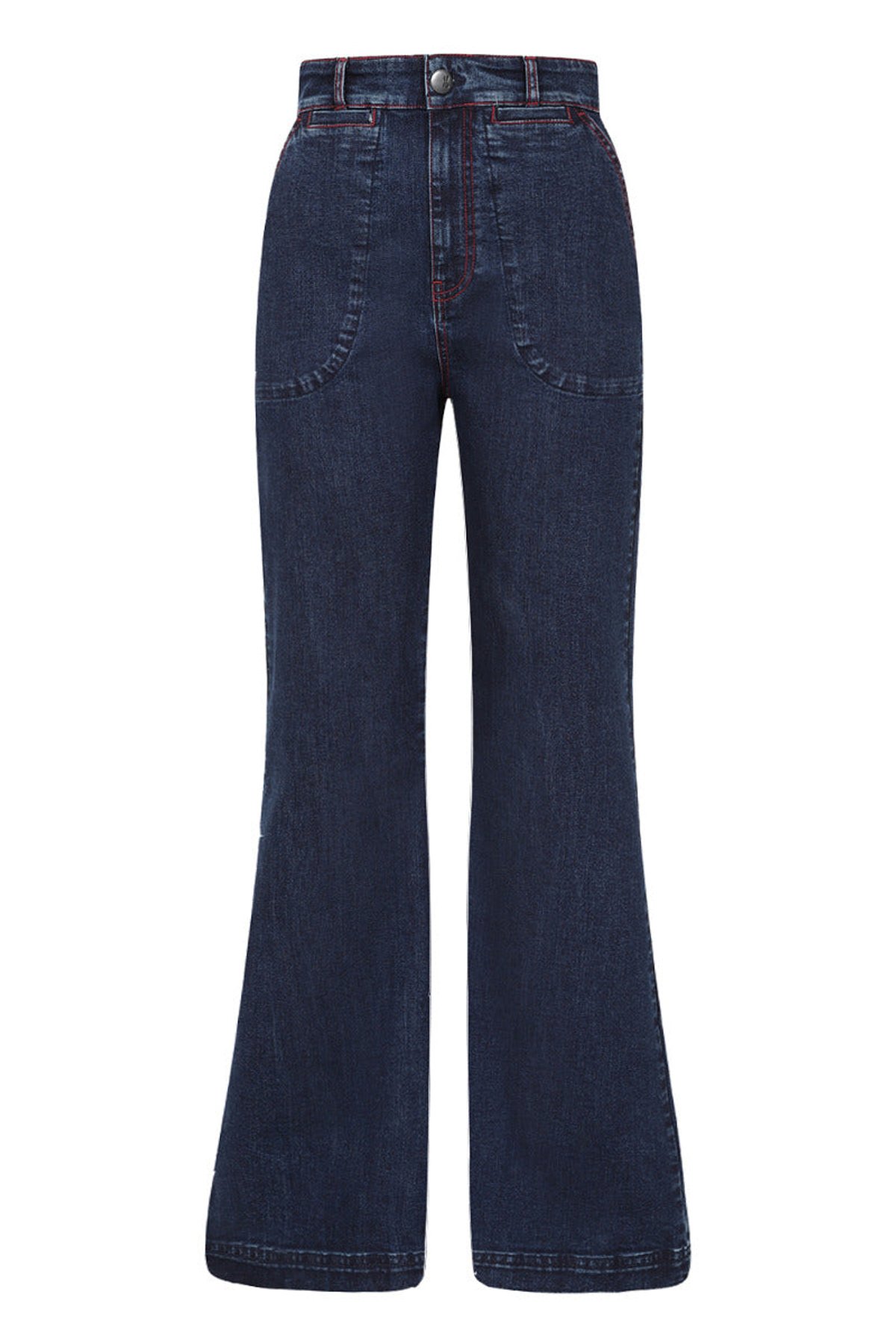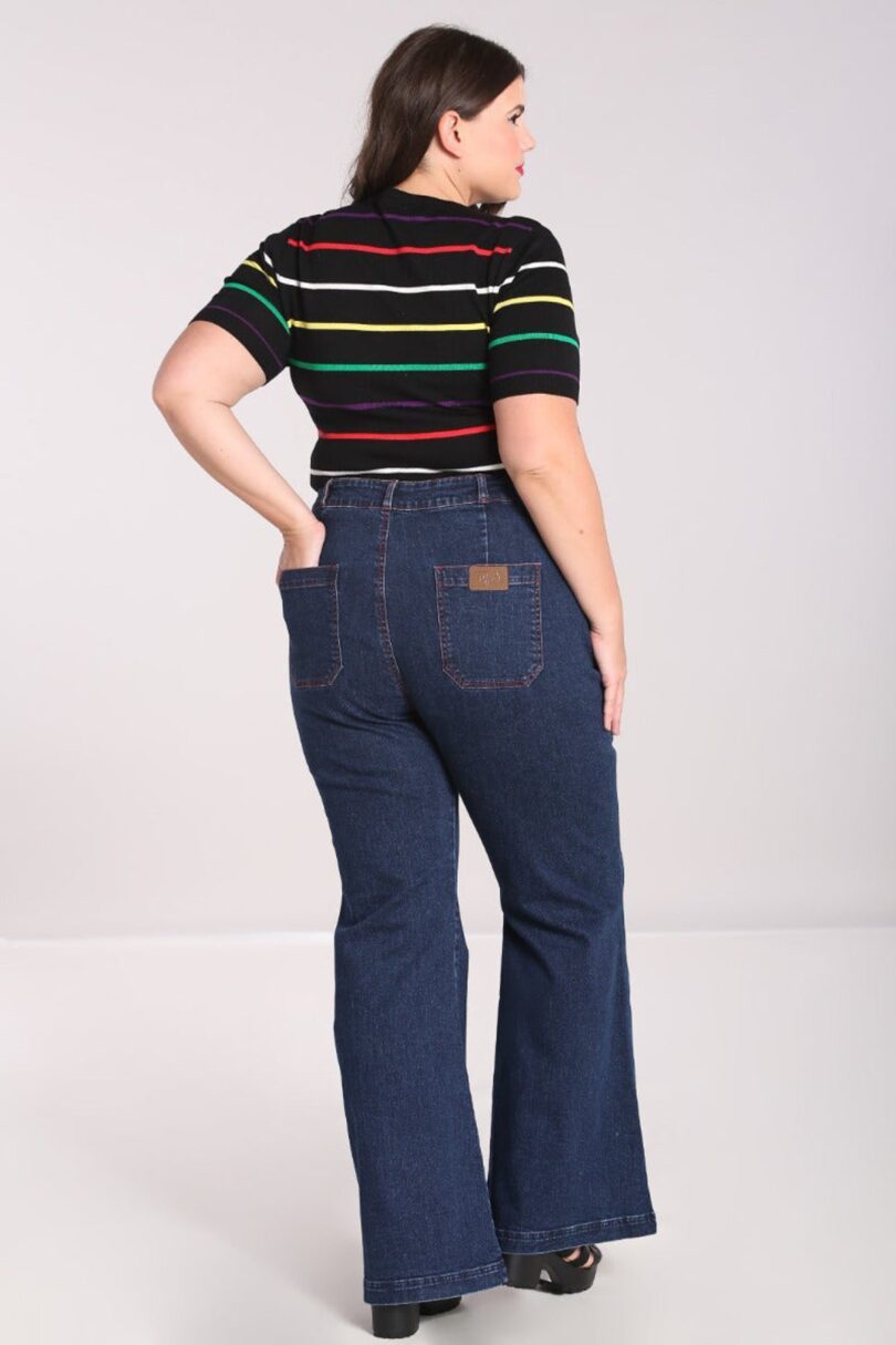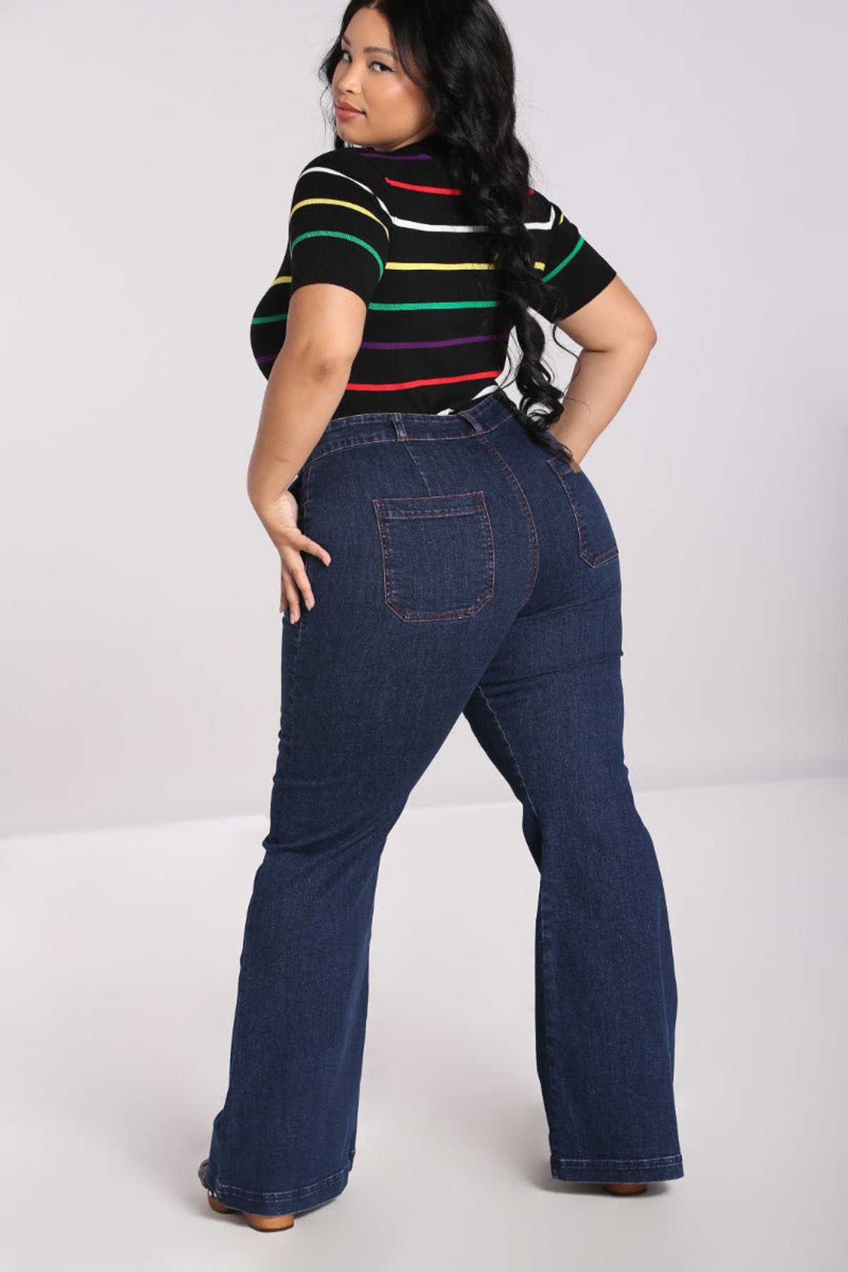 Step into the spotlight with our Jaclyn Jeans — where vintage charm meets modern sass. These high-waisted, flare-bottom beauties boast a rich dark blue denim with playful red topstitching that’s as daring as you are. Designed to accentuate your curves and flatter every move, their stretchy fabric ensures you stay comfy while turning heads. From the chic waistband with belt loops to the classic button and zip fastening, every detail is crafted to make you feel fabulous — and just a little mischievous.