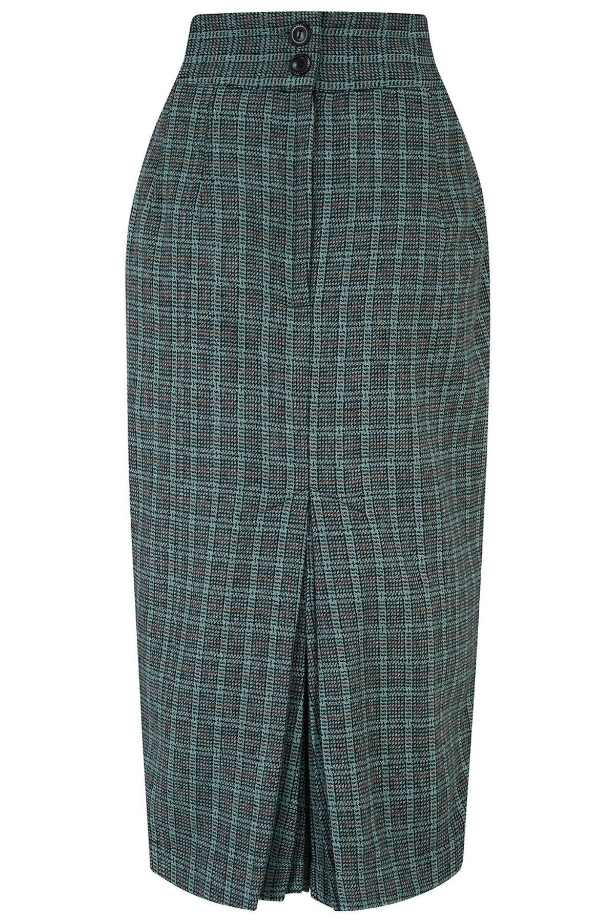 Let your wardrobe do the talking with our 💫Vintage Jitterbug Pencil Skirt💫 in a classy teal grey check. Step back into the enchanting era of the 1950s! This charming piece is cut to enhance your silhouette, hugging those curves just where it counts. Add to it, a flirtatious kick-pleat at the rear, making it oh-so perfect for a spin or two on the dance floor.🕺