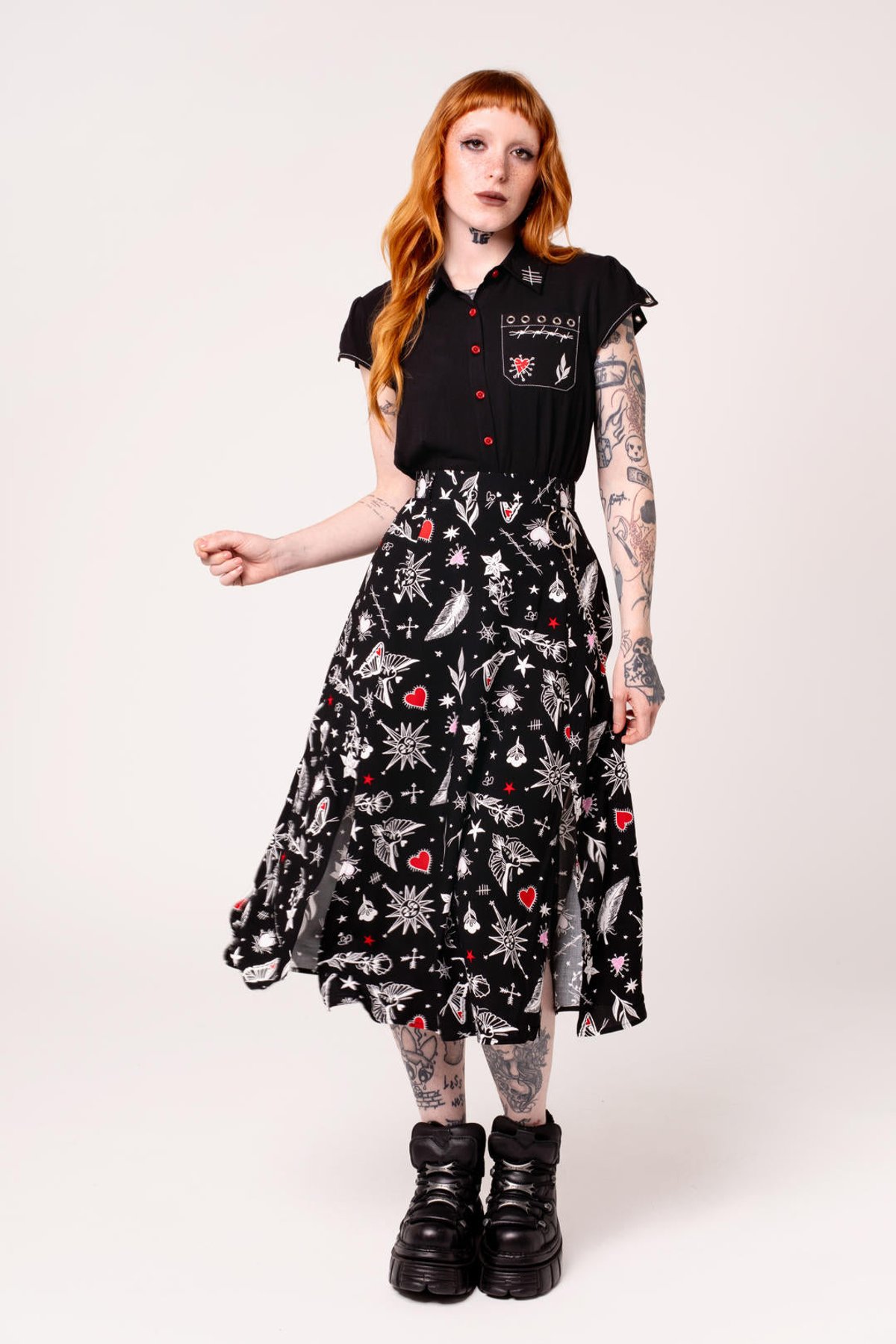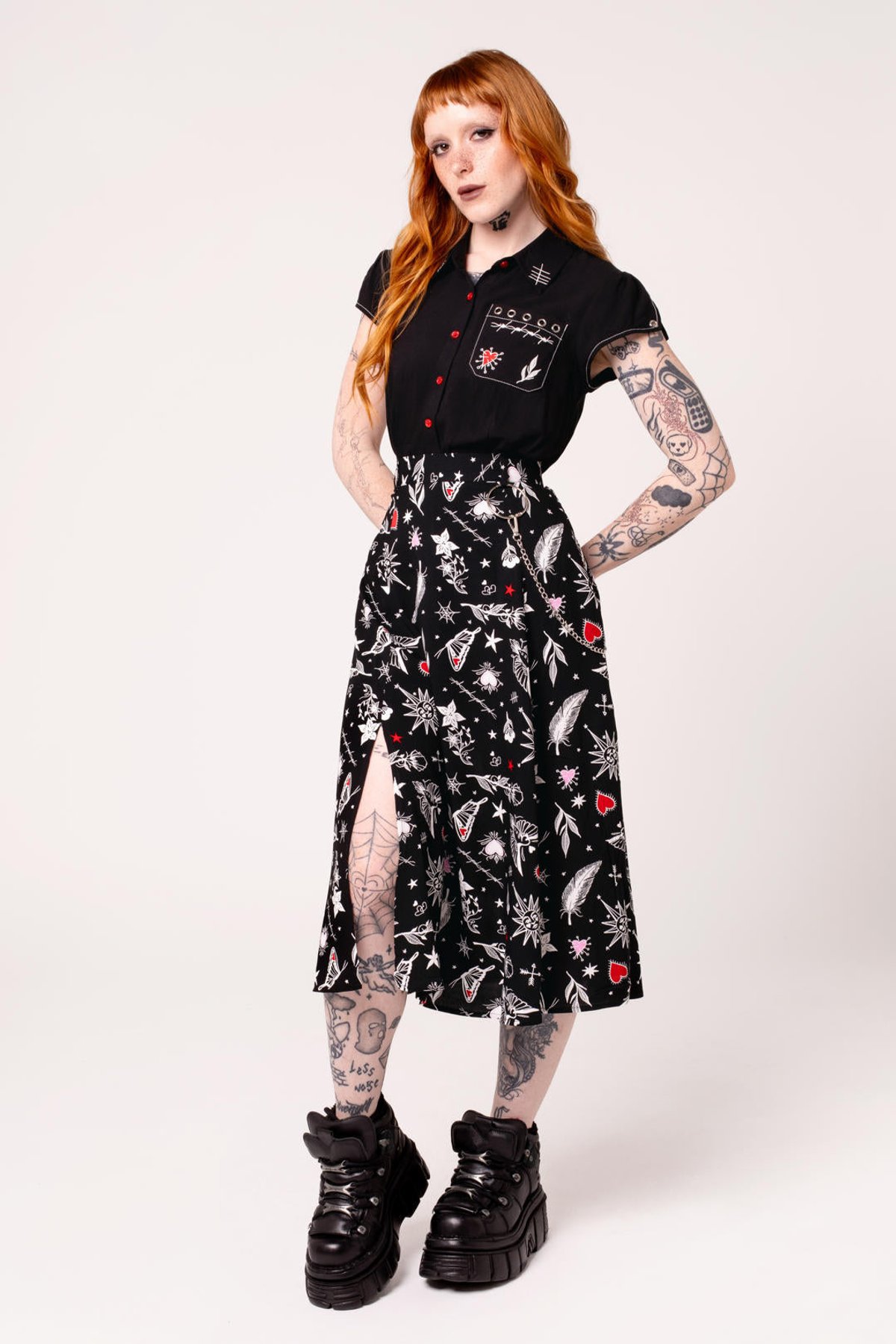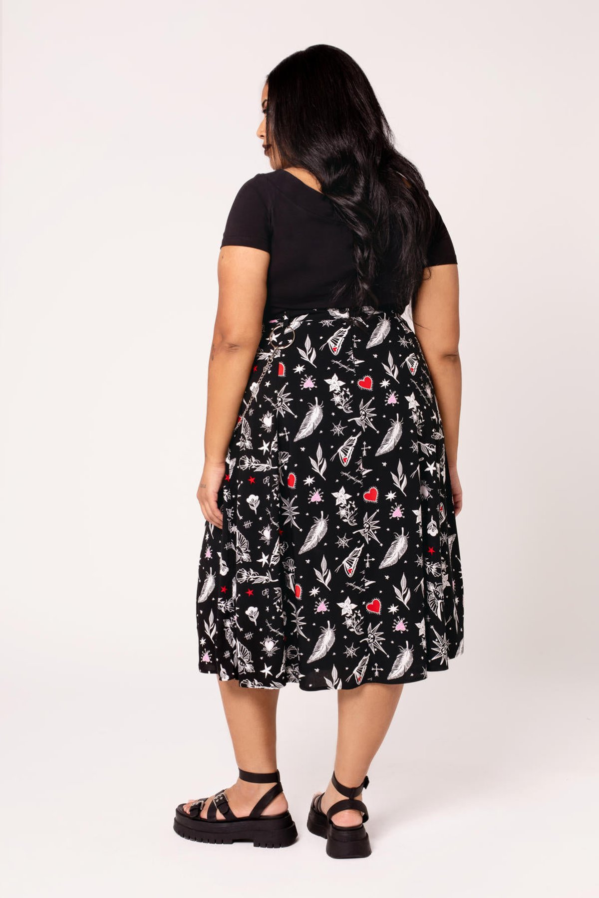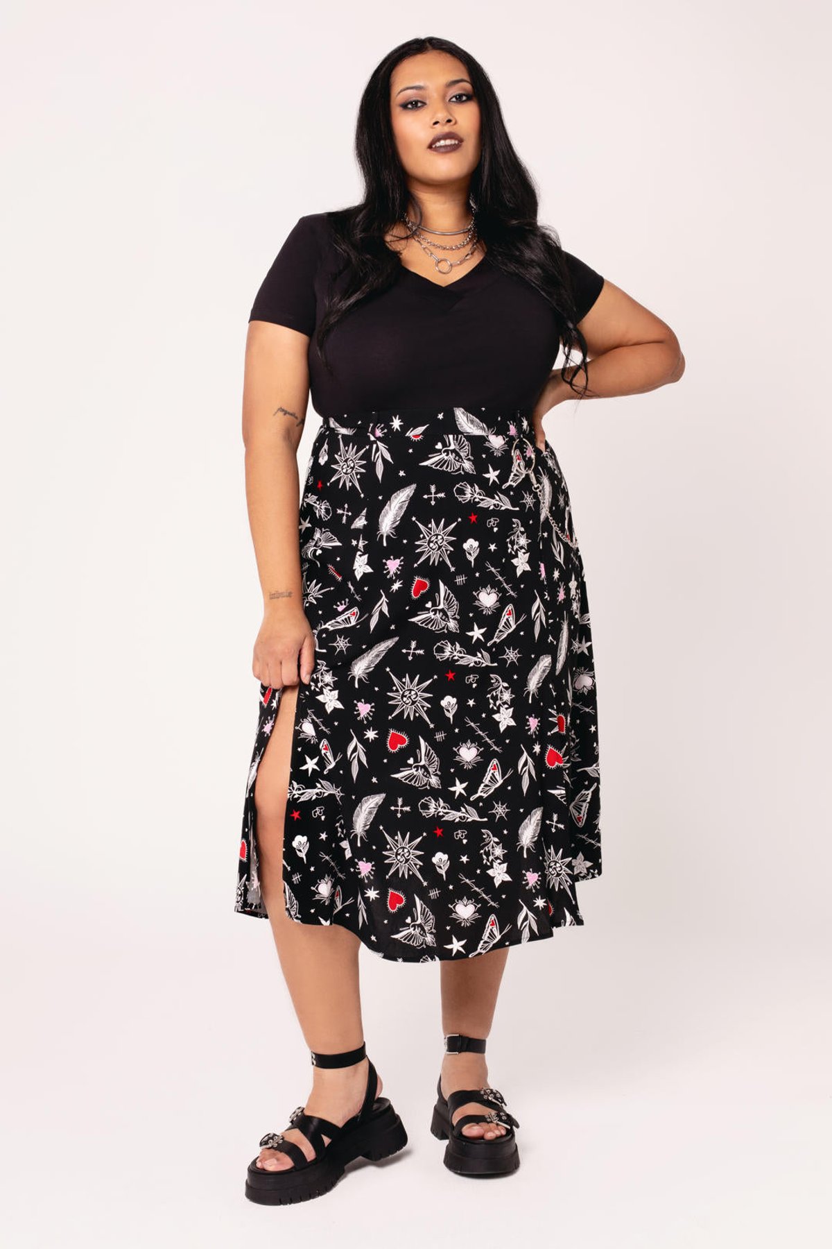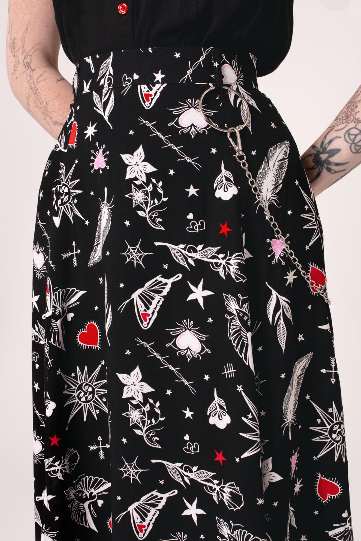 Unleash your inner rebel and turn heads with the Leah Skirt’s bold monochrome palette and abstract tattoo-inspired designs. Its long, flowing midi silhouette is a perfect playground for your latest footwear obsession, while the daring front splits add just the right amount of flirtation. The self-fabric waistband with belt loops is as practical as it is stylish, giving you a tailored look that’s easy to wear. Crafted from 100% viscose, this piece drapes with effortless elegance, while the silver ring and chain detail add a touch of punk attitude. Whether you’re feeling vintage vibes or want to make a statement, the Leah Skirt is your new go-to for a look that’s both eye-catching and undeniably chic.