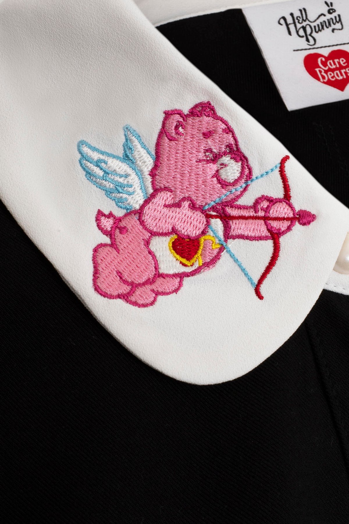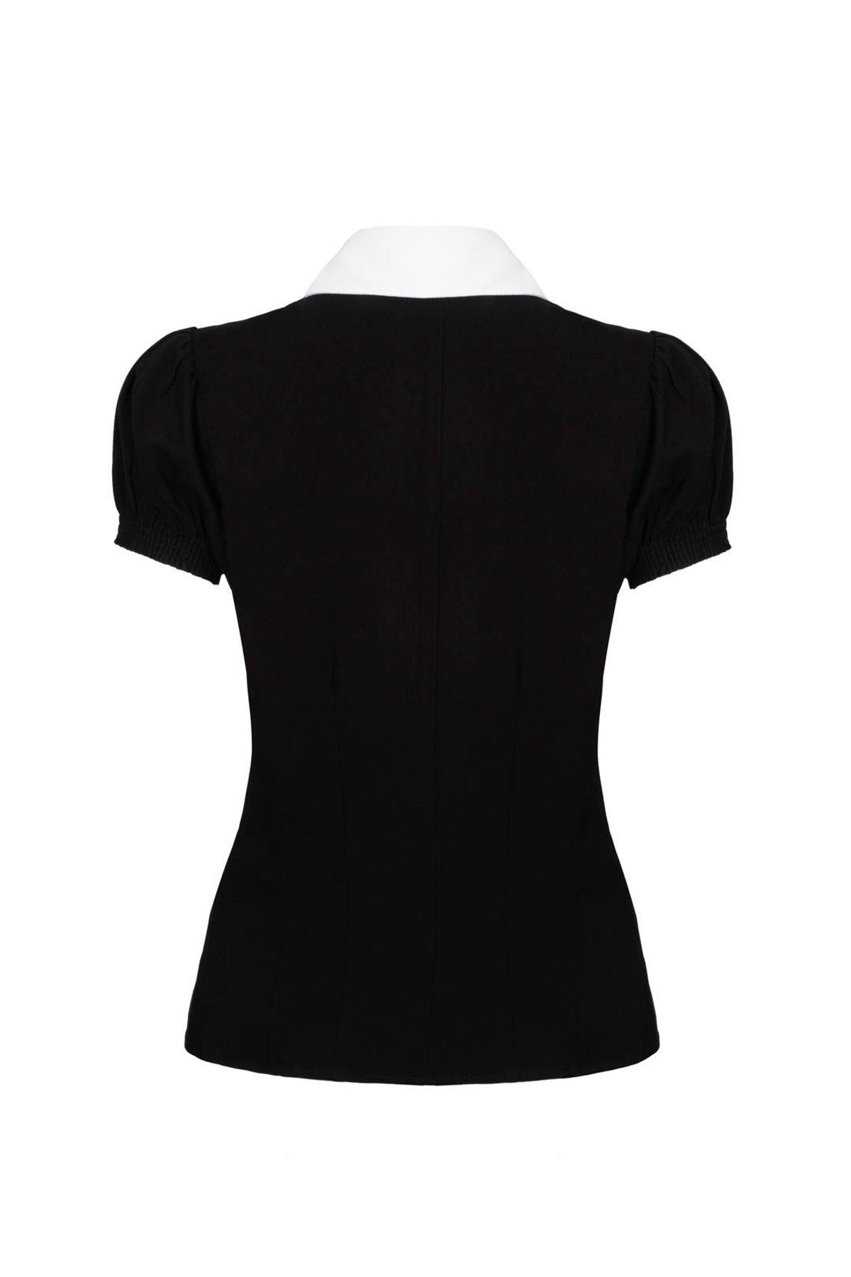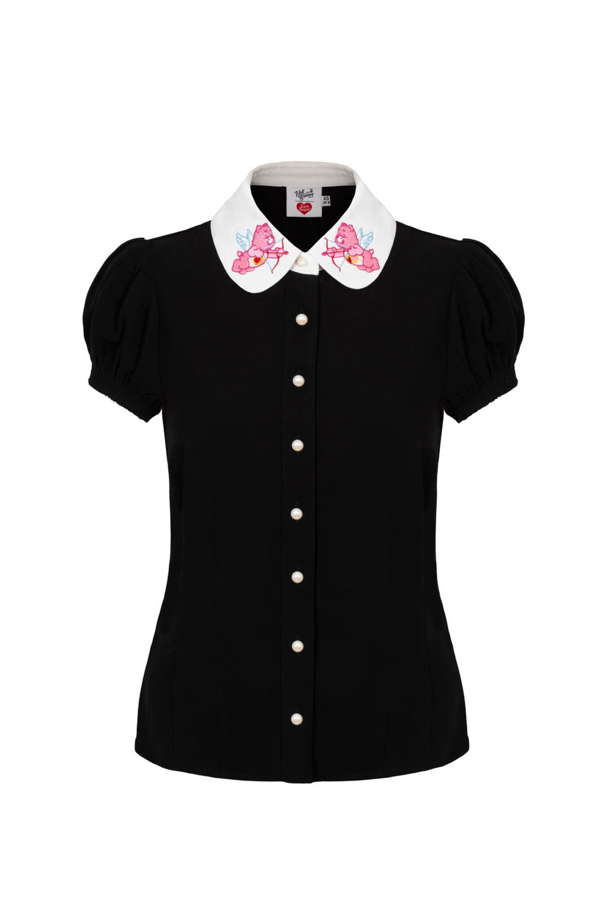 Introducing the Love-A-Lot Blouse—a purrfect blend of vintage-inspired charm and playful elegance. Its crisp white collar and adorable cherub Love-A-Lot Bear embroidery instantly add a sweet, nostalgic touch to any outfit. The sleek black fabric contrasts beautifully with pearly white buttons, creating a look that's both adorable and effortlessly chic. With its puff sleeves and elasticated cuffs, this blouse offers a flattering silhouette while keeping you comfortable from morning coffee to evening adventures. Crafted from soft, lightweight viscose, it drapes beautifully without stretch, so just be sure to pick your size wisely. Whether you’re dressing for a vintage market stroll or a casual brunch, this piece promises to turn heads and steal hearts.