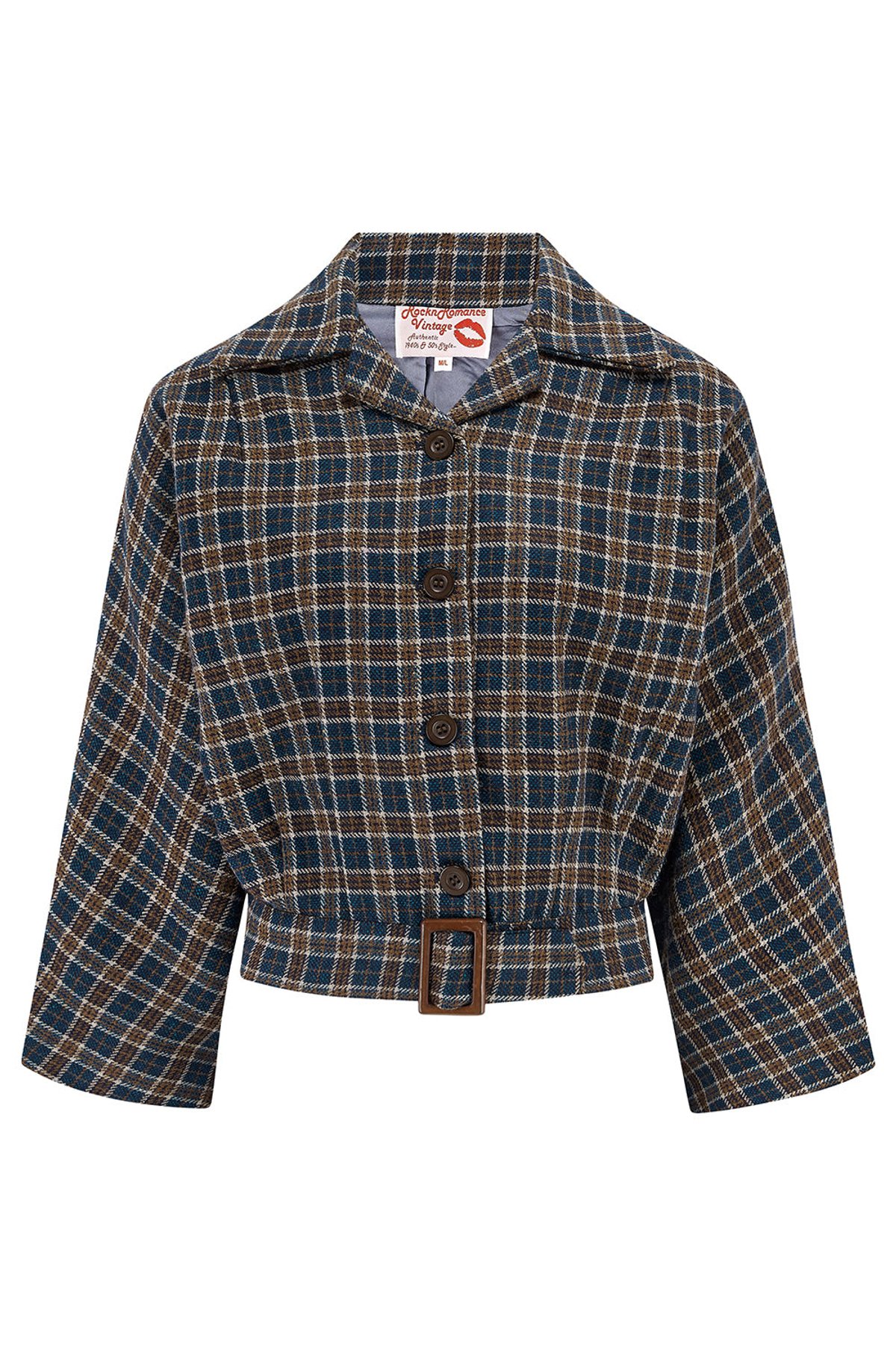 Tickle your vintage passion with our Be-Bop semi-cropped jacket in navy & brown check! This piece is a delightful throwback to late 40s and early 50s fashion.🌹 With its relaxed fit and neat belted waist, it instinctively carves out a divine hourglass silhouette. And let’s not forget those playful 3/4 batwing sleeves! With their cheeky charm and style, they’re sure to ruffle some feathers.
