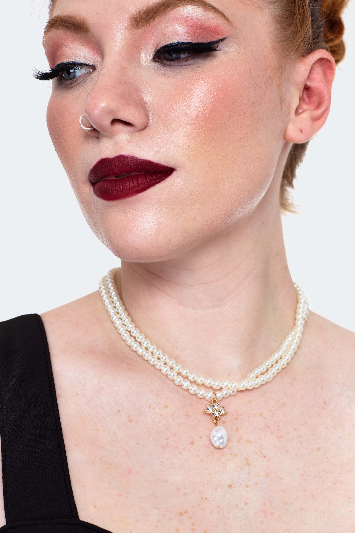 Unleash your inner vintage vixen with our Pearl Beaded Charm Necklace—a true purrfect blend of timeless elegance and playful sophistication. Featuring two shimmering layers of pearl-like beads and a charming drop pendant, this piece exudes retro glamour with a modern twist. Its classic white and gold hues make it a versatile accessory that effortlessly elevates any look, whether you're channeling old Hollywood chic or adding a touch of refined sparkle to your everyday style. Crafted to captivate, it’s a necklace that’s as enchanting as a moonlit catnap and just as irresistible.