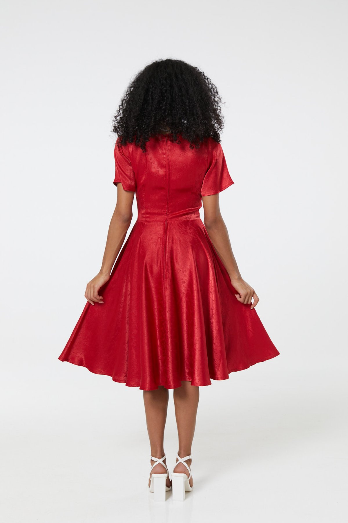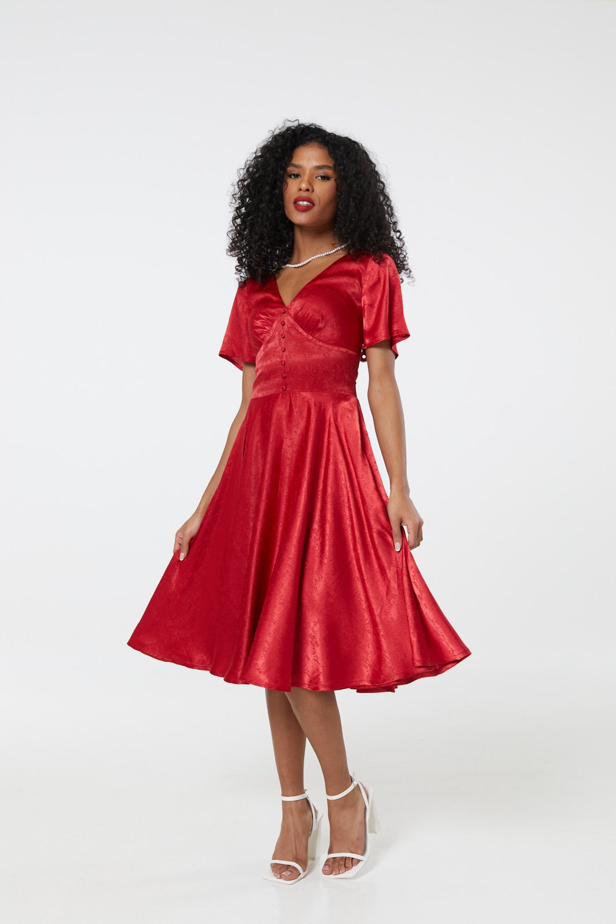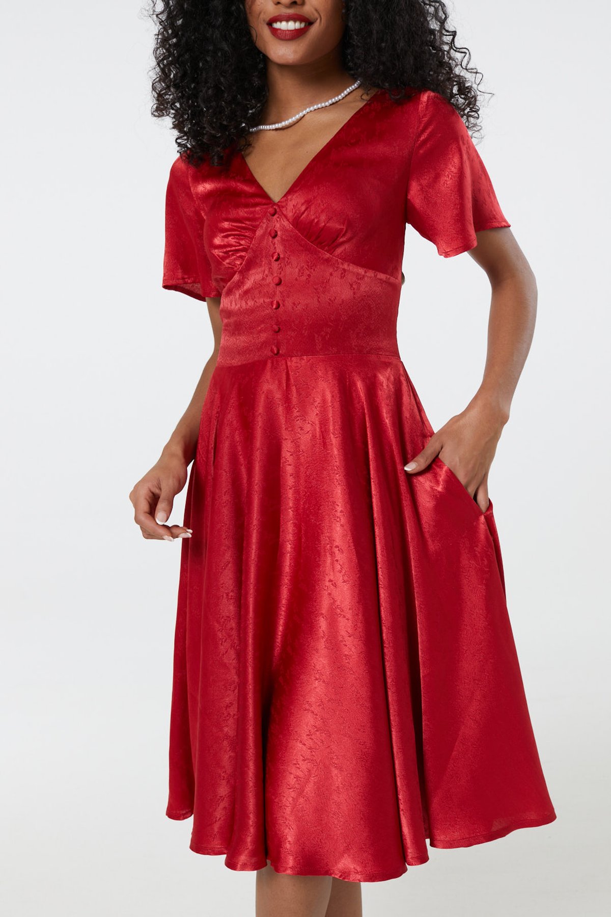Get ready to pounce on this fiery red stunner that oozes vintage charm with a modern twist. The Kaylee dress is a purrfect blend of timeless elegance and playful flair, crafted from plush jacquard fabric embroidered with subtle floral designs. Its flattering V-neckline, adorned with delicate faux buttons, frames your face with feline finesse. Short sleeves add a touch of demure sophistication, while the knee-length flare skirt swishes with every step — guaranteed to make you feel claws-down gorgeous at any occasion. Practicality is part of the package, thanks to hidden side pockets perfect for stashing your essentials without missing a beat. Whether you’re sashaying into a special celebration or simply wanting to turn heads on a day out, this dress is your best bet for effortless, vintage-inspired style.