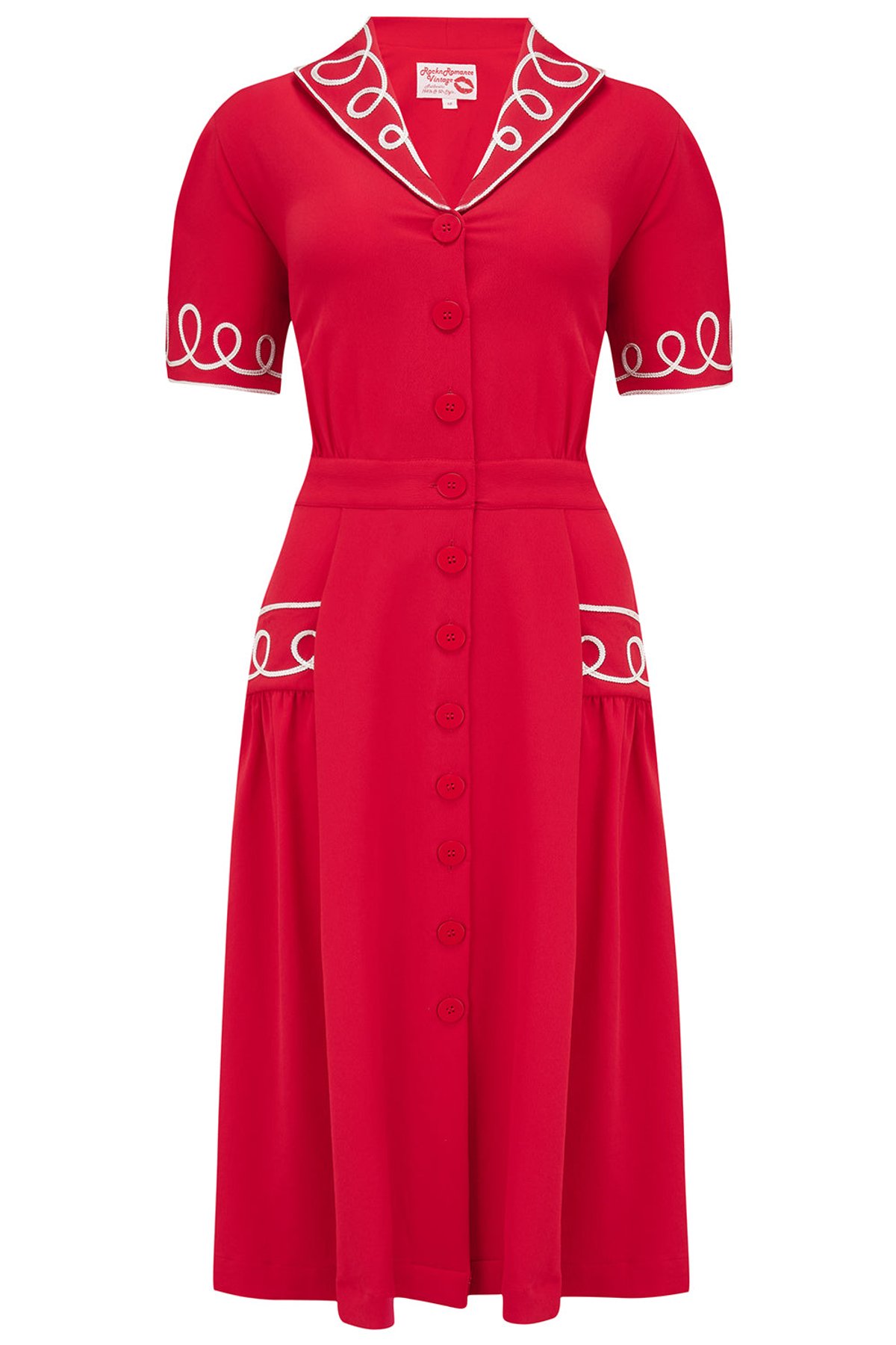Unleash your inner vintage vixen with the Loopy-Lou Shirtwaister Dress, a playful ode to 1950s glamour. Its vibrant red hue and charming ricrac detailing add just the right amount of flirty fun, while the elasticated waist offers a purrfect fit that flatters every move. Crafted from luxurious poly crepe, this dress drapes effortlessly, giving you that timeless silhouette with a modern twist. Whether you're feeling bold enough to dance the night away or prefer a chic daytime stroll, this piece is your new go-to for a touch of retro sophistication with a mischievous wink. Its versatile design means you’ll feel fabulous whether paired with heels or flats, making it a wardrobe staple that’s as practical as it is pretty. A true classic with a sassy twist—what more could you ask for?