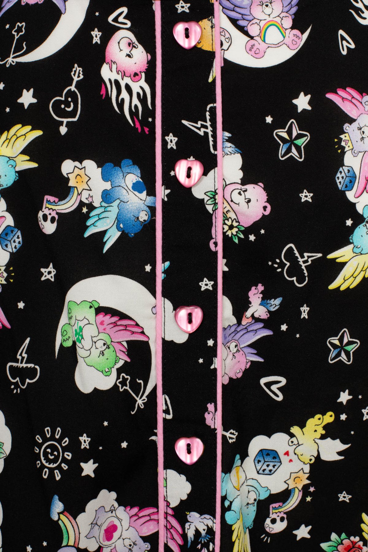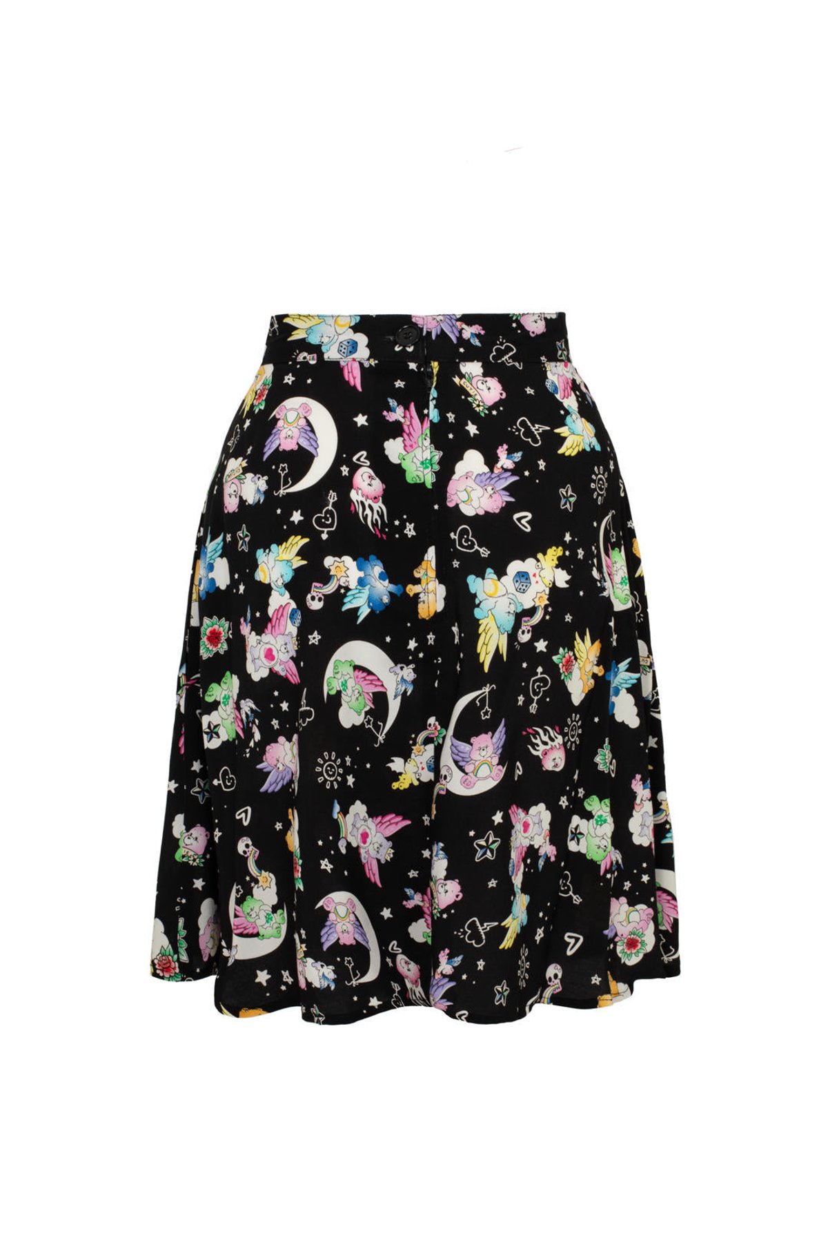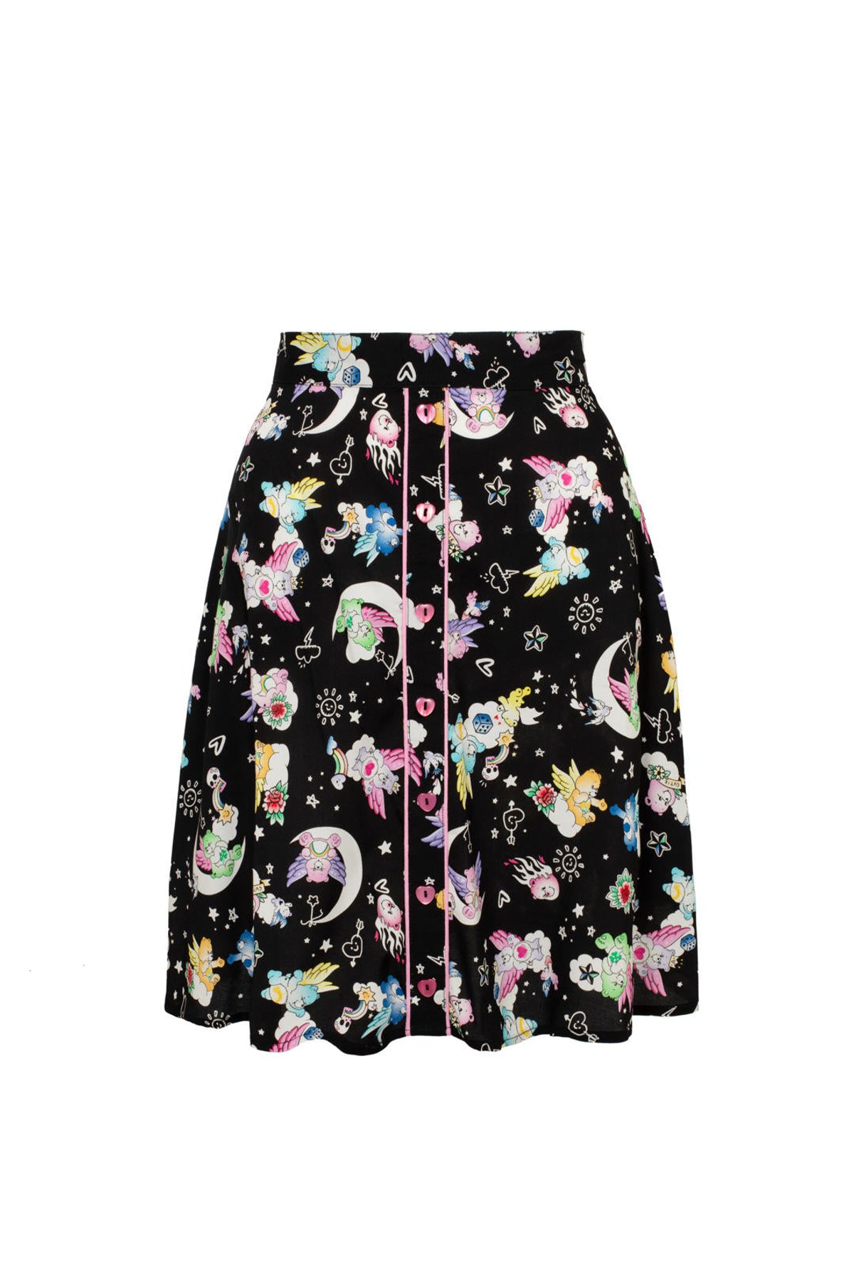 Unleash your inner boho goddess with our Roxi Skirt—a true purrfect piece for those who love vintage with a playful twist. This mini skirt features a sleek black backdrop sprinkled with whimsical floral and celestial motifs, all adorned with charming tattoo-inspired touches and adorable Care Bear pals. Heart-shaped buttons and pink piping add a sweet, retro flair that’s as enchanting as a moonlit night. Crafted in 100% viscose, it’s as comfy as it is chic, hugging your curves in all the right places and making every step feel feline-tastic.
