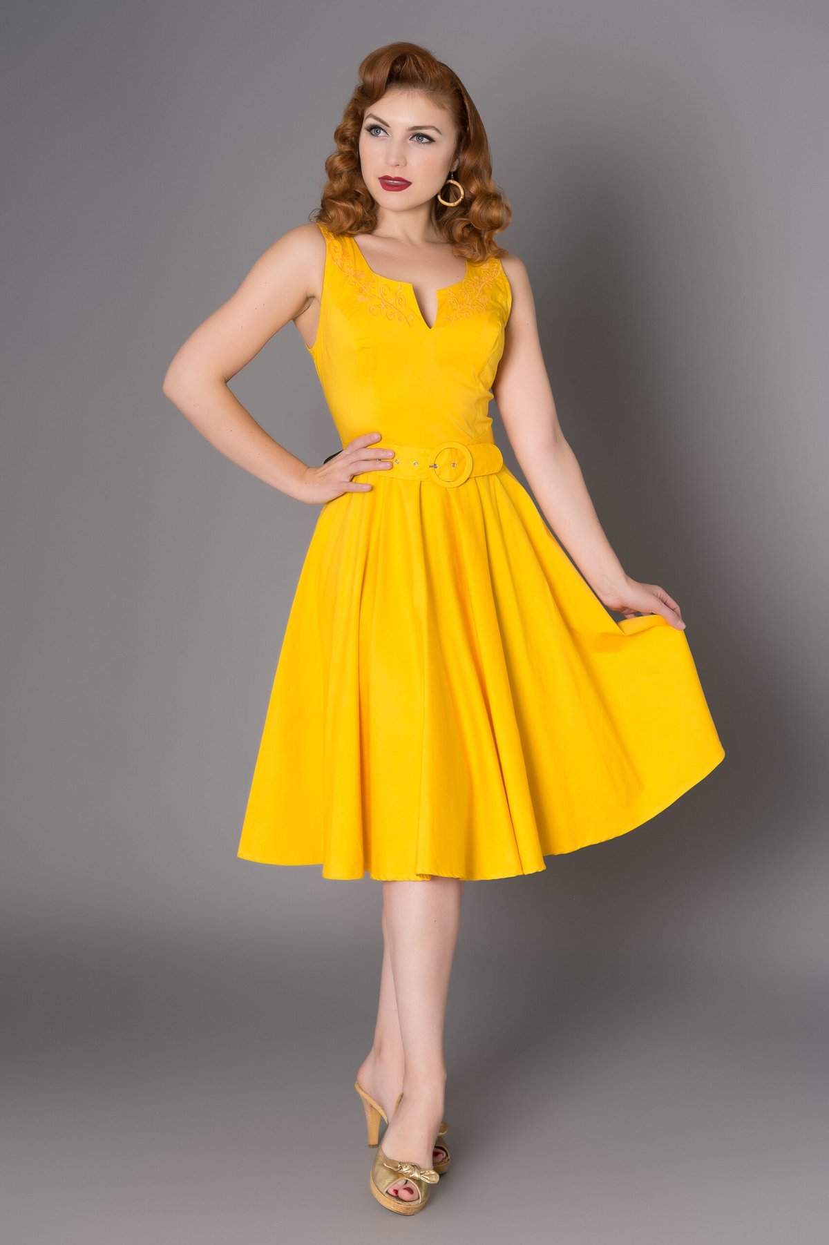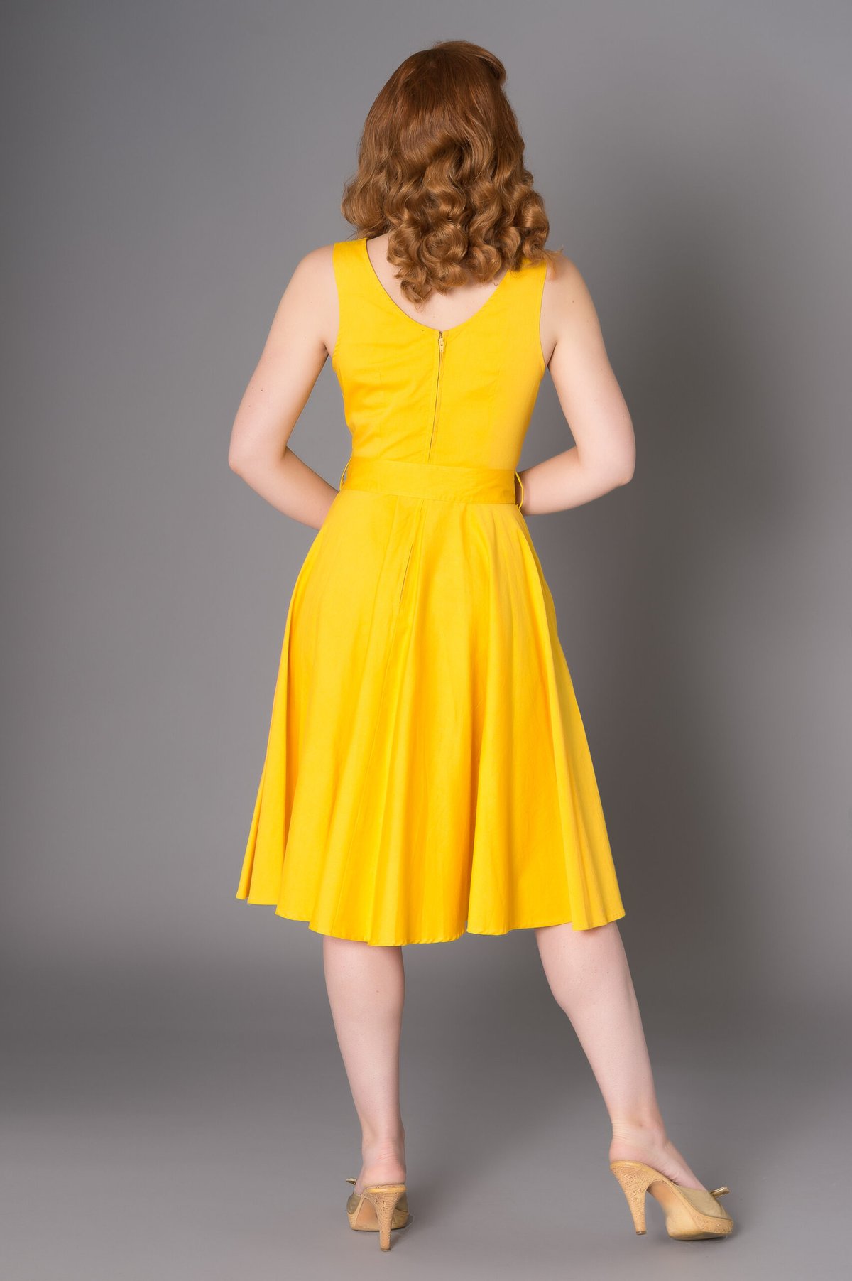 Get ready to purr with delight in the Samantha Dress—a true feline-inspired stunner! This vintage-inspired piece winks at the glamour of the 1950s, flaunting a radiant yellow hue that’s impossible to ignore. Its fitted bodice and rounded boat neck with a playful V-cut add just the right amount of flirty charm, while the swing skirt and chunky belt will have you feeling claws-down gorgeous. Designed for both style and practicality, the concealed pockets make sure you’re always prepared to paw-some moments, whether it’s a garden fête or a sunny afternoon out. This dress is a purrfect blend of retro glamour and everyday elegance, crafted to make you feel confident and chic every time you slip into it.